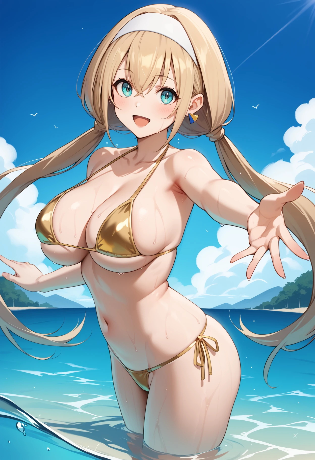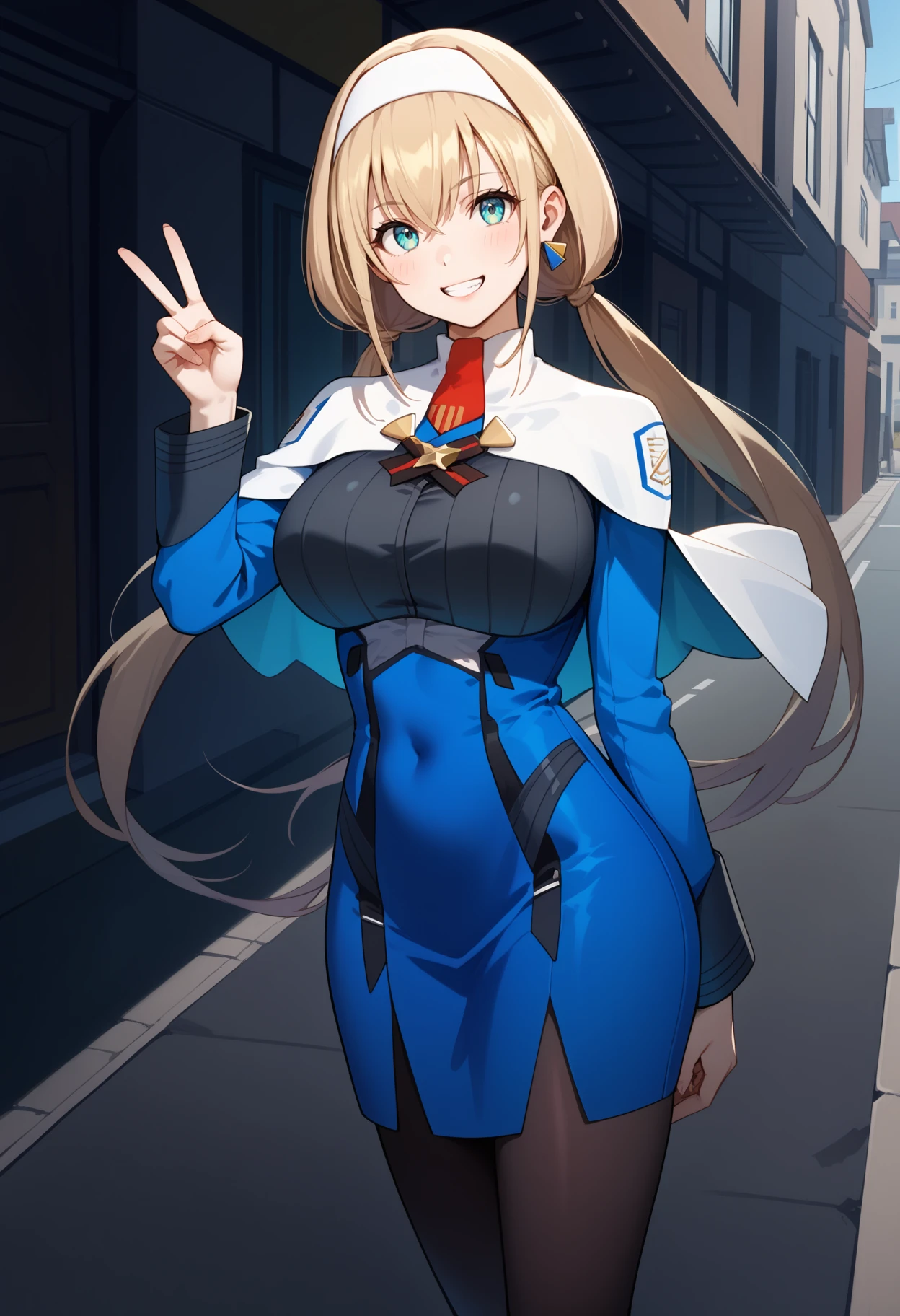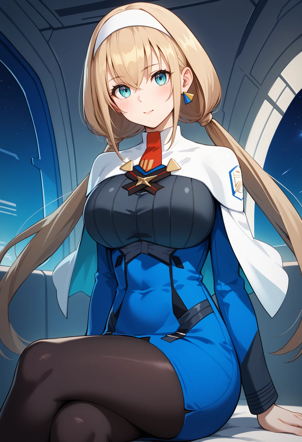 1girl, solo, long hair, blonde hair, low twintails, white hairband, triangle earrings, large breasts, military uniform, white capelet, necktie, blue dress, long sleeves, black pantyhose