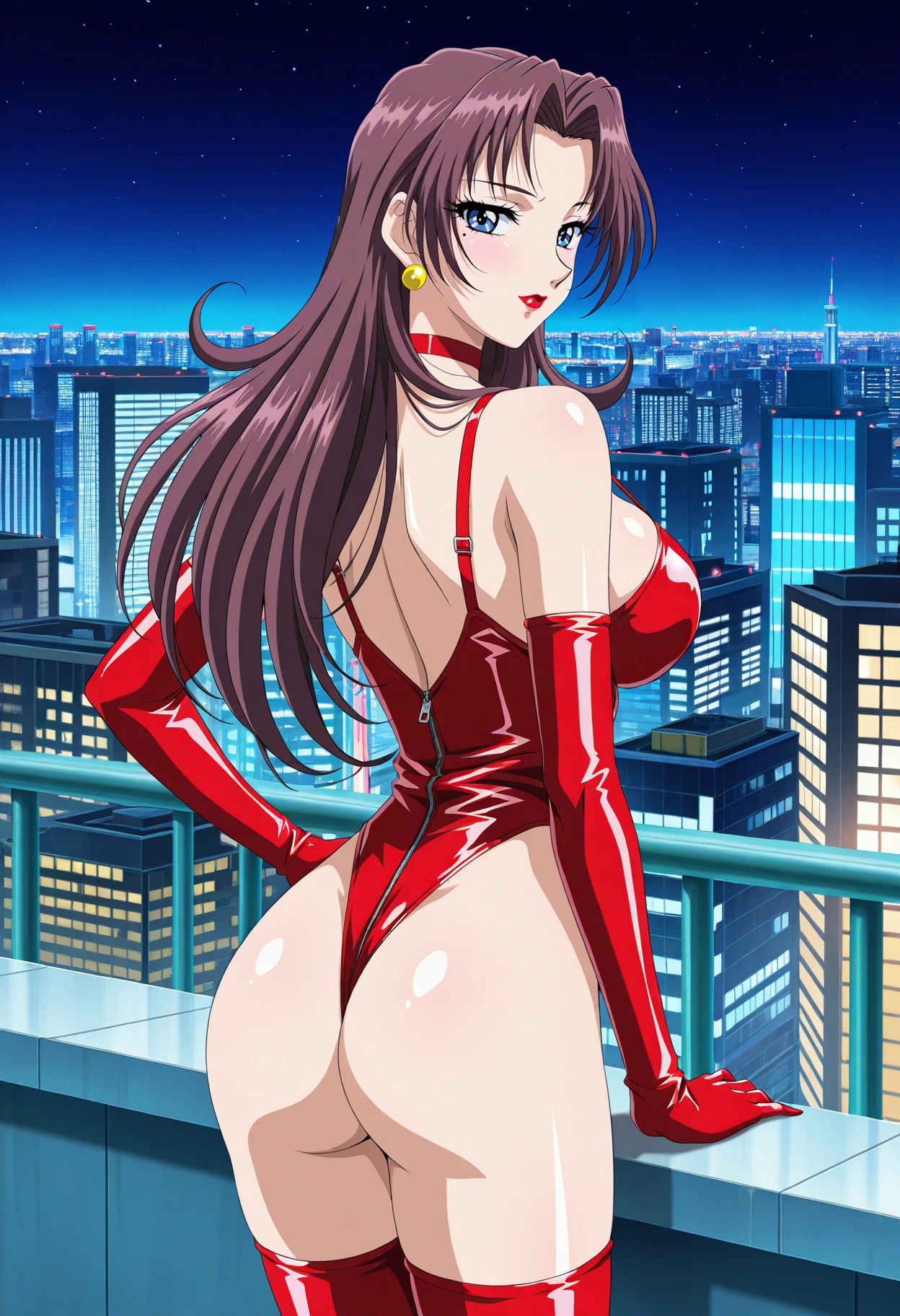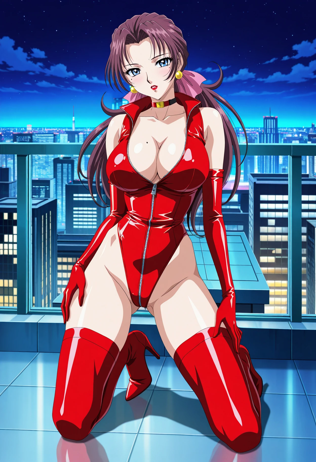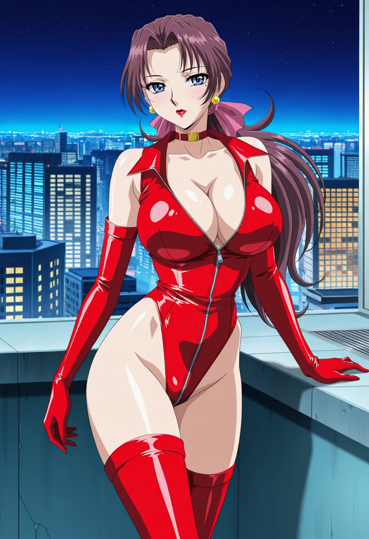 superhero outfit: navel, thighs, latex, superhero, jewelry, earrings, choker, leotard, cleavage, red leotard, highleg leotard, bare shoulders, zipper, gloves, elbow gloves, thighhighs, red thighhighs, highleg,