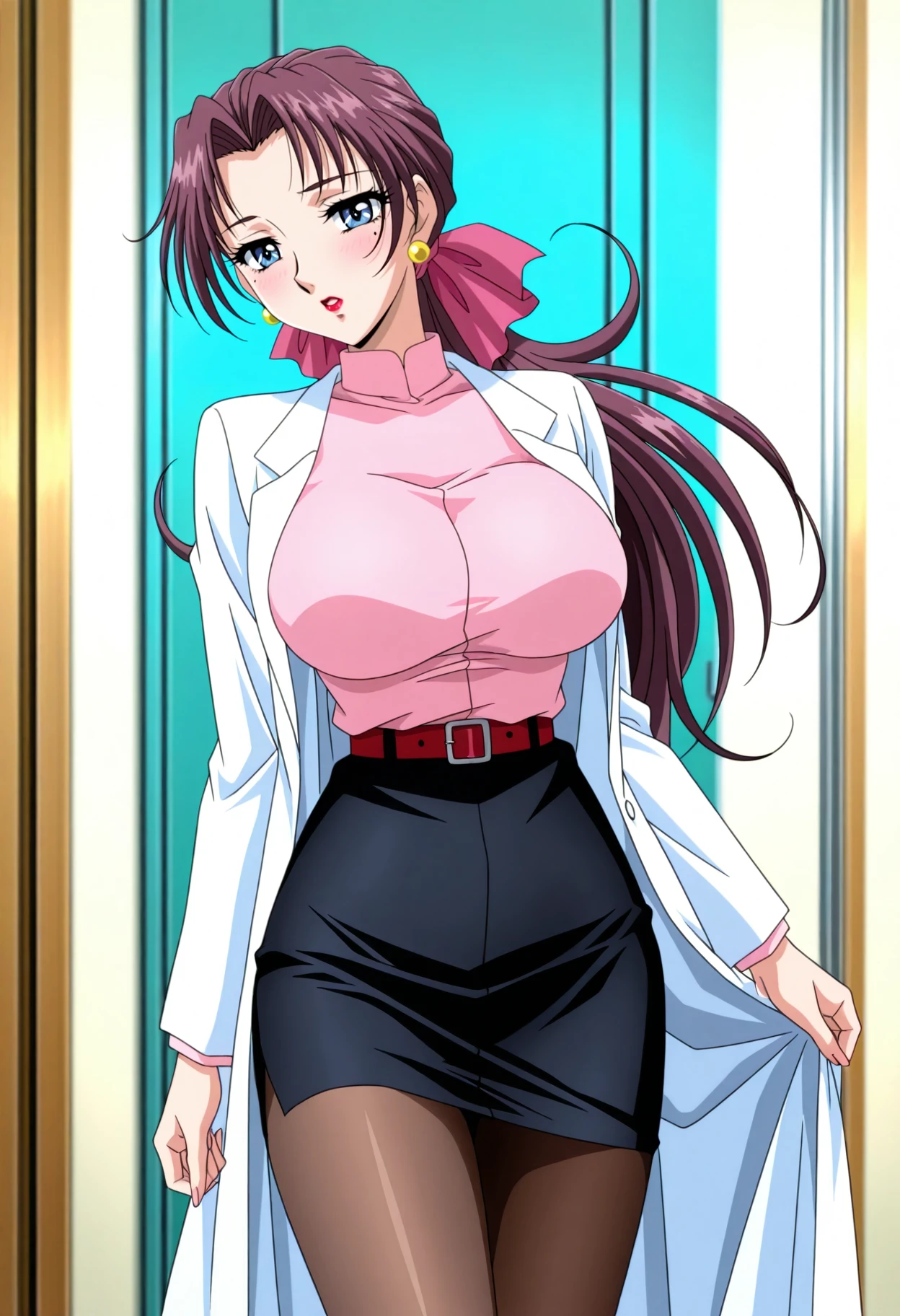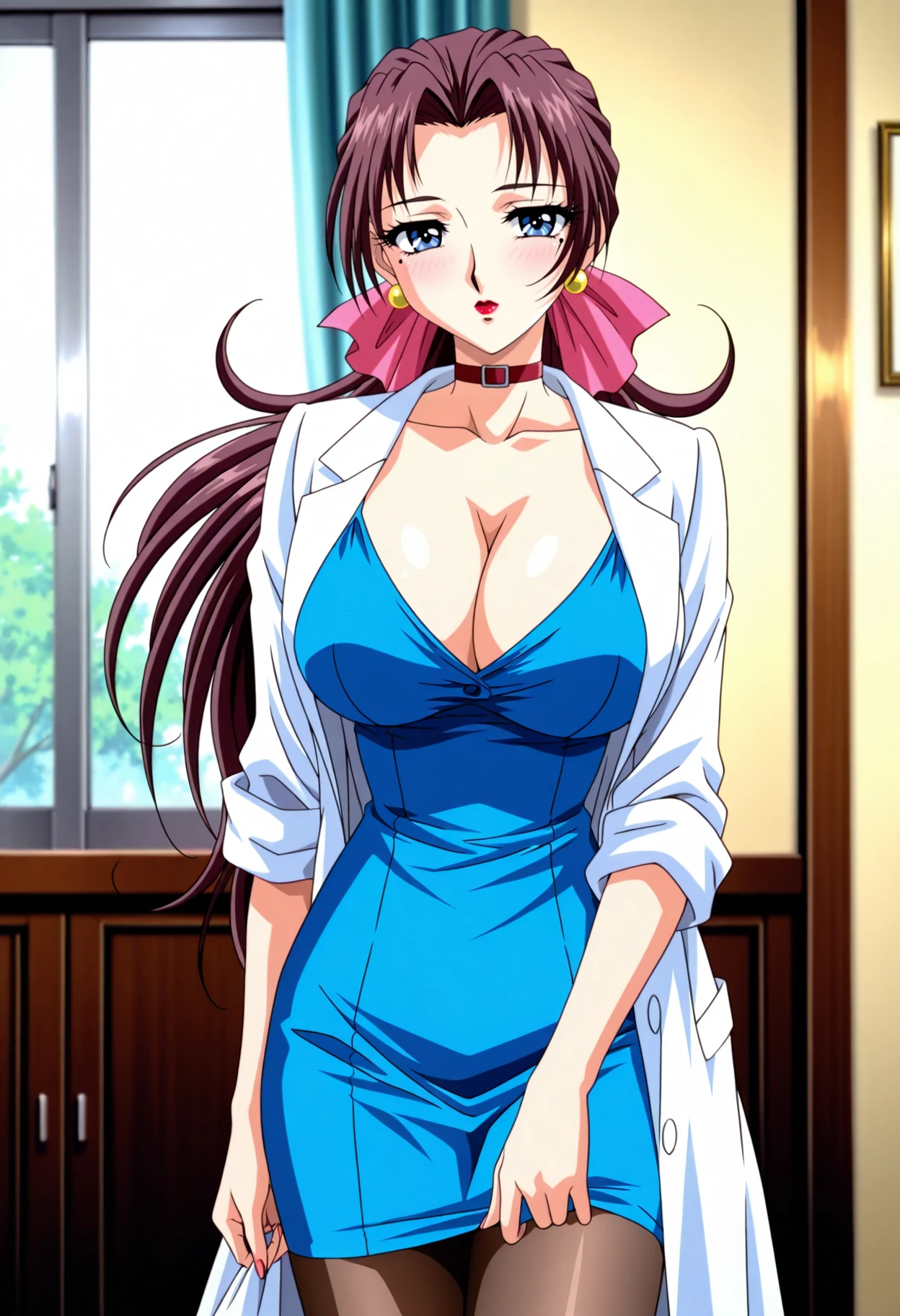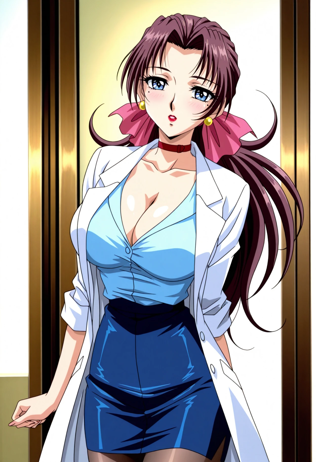 nurse outfit tags: bow, hair bow, pink bow,earrings, jewelry, choker, red choker, labcoat, sleeves rolled up, shirt, blue shirt, skirt, blue skirt, pencil skirt, cleavage, pantyhose,