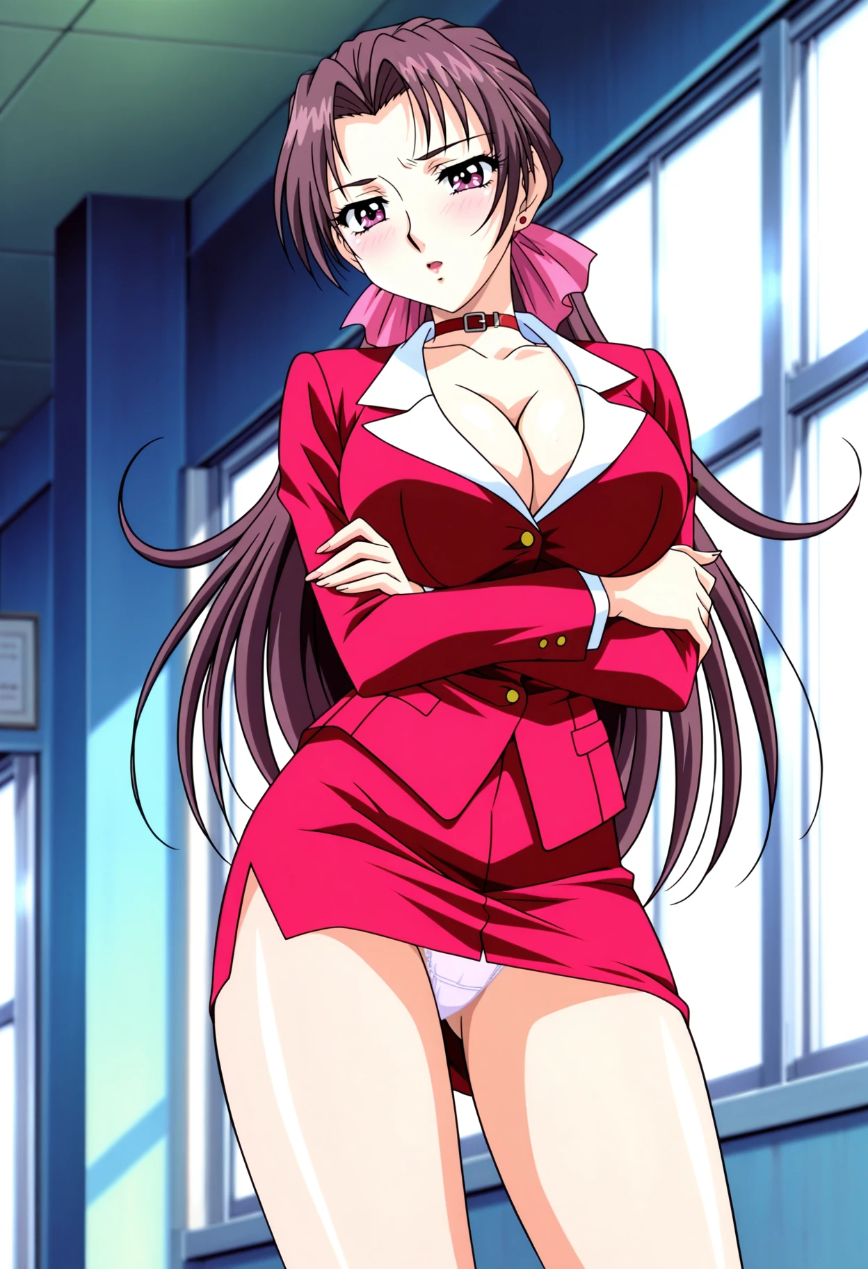 main tags: 1girl, solo, mature female, blue eyes, long hair, ponytail, brown hair, purple hair, mole, mole under eye, breasts, makeup, lipstick, red lips,
