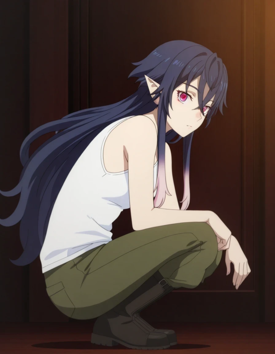 pink eyes, long hair, dark blue hair, pointy earsOutfit [1] [Military Uniform] [Version 1]: