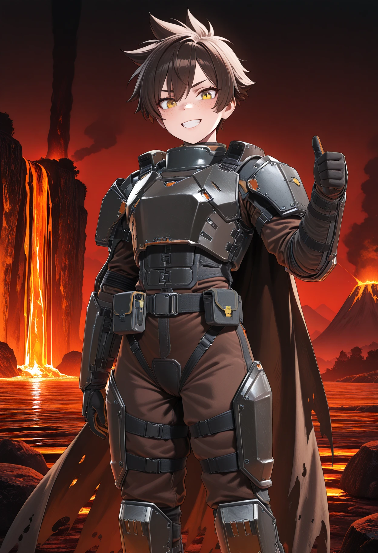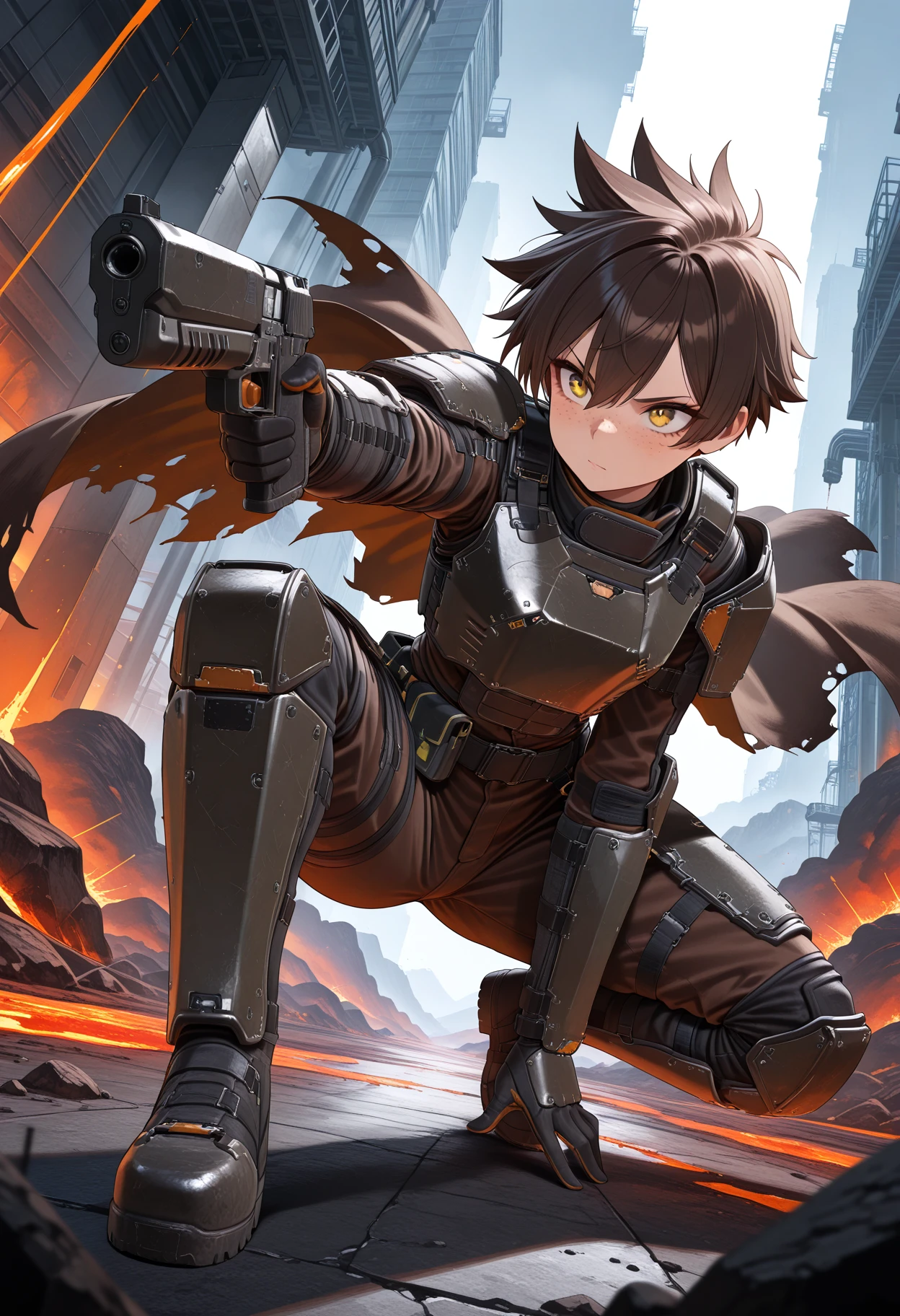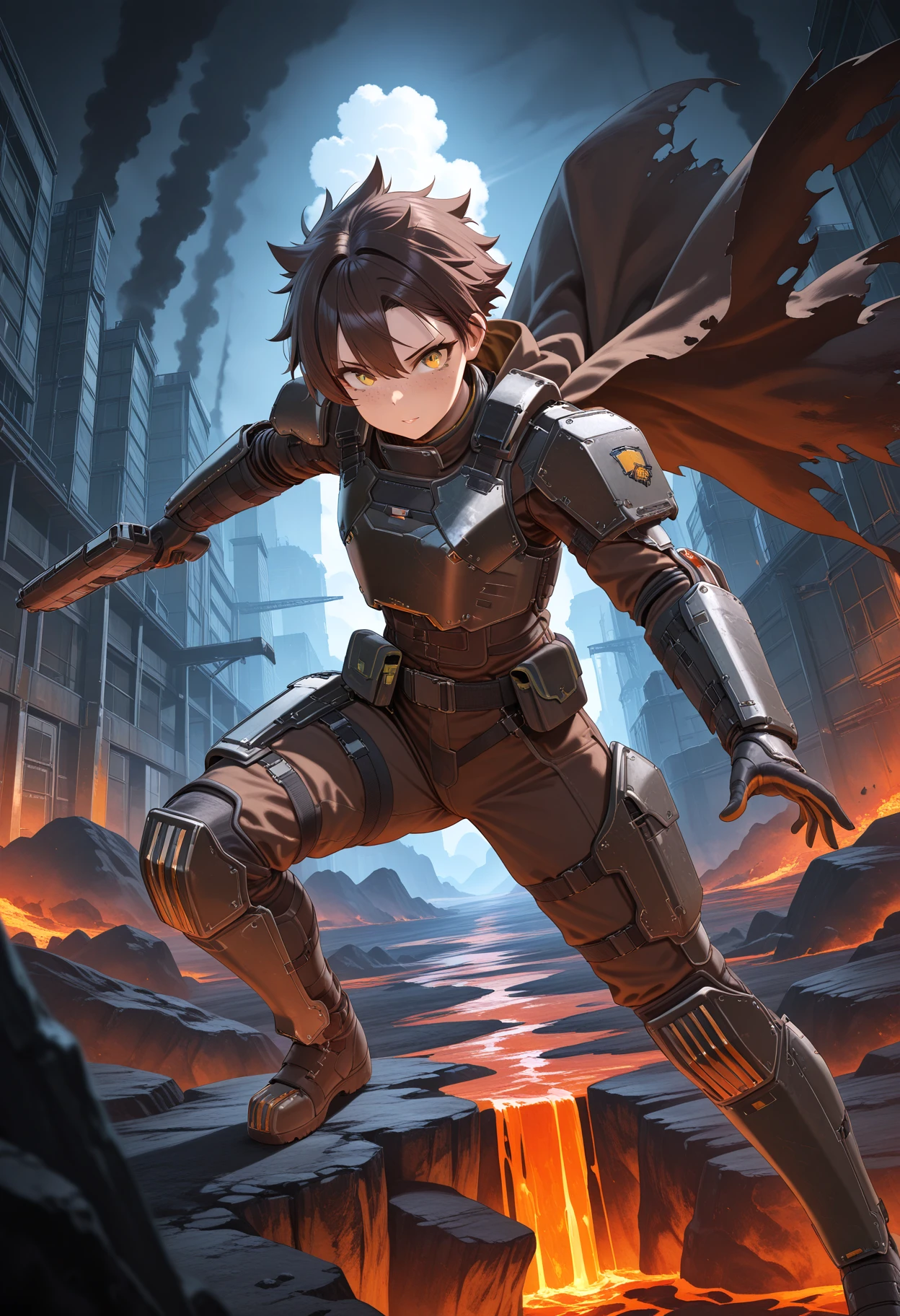 sa7headfirst, military uniform, brown jumpsuit, cuirass, belt, tactical pouches on belt, emblem on cuirass, shoulder armor, vambraces, gloves, side thigh armor, shin guards, boots, orange accents on armor,
