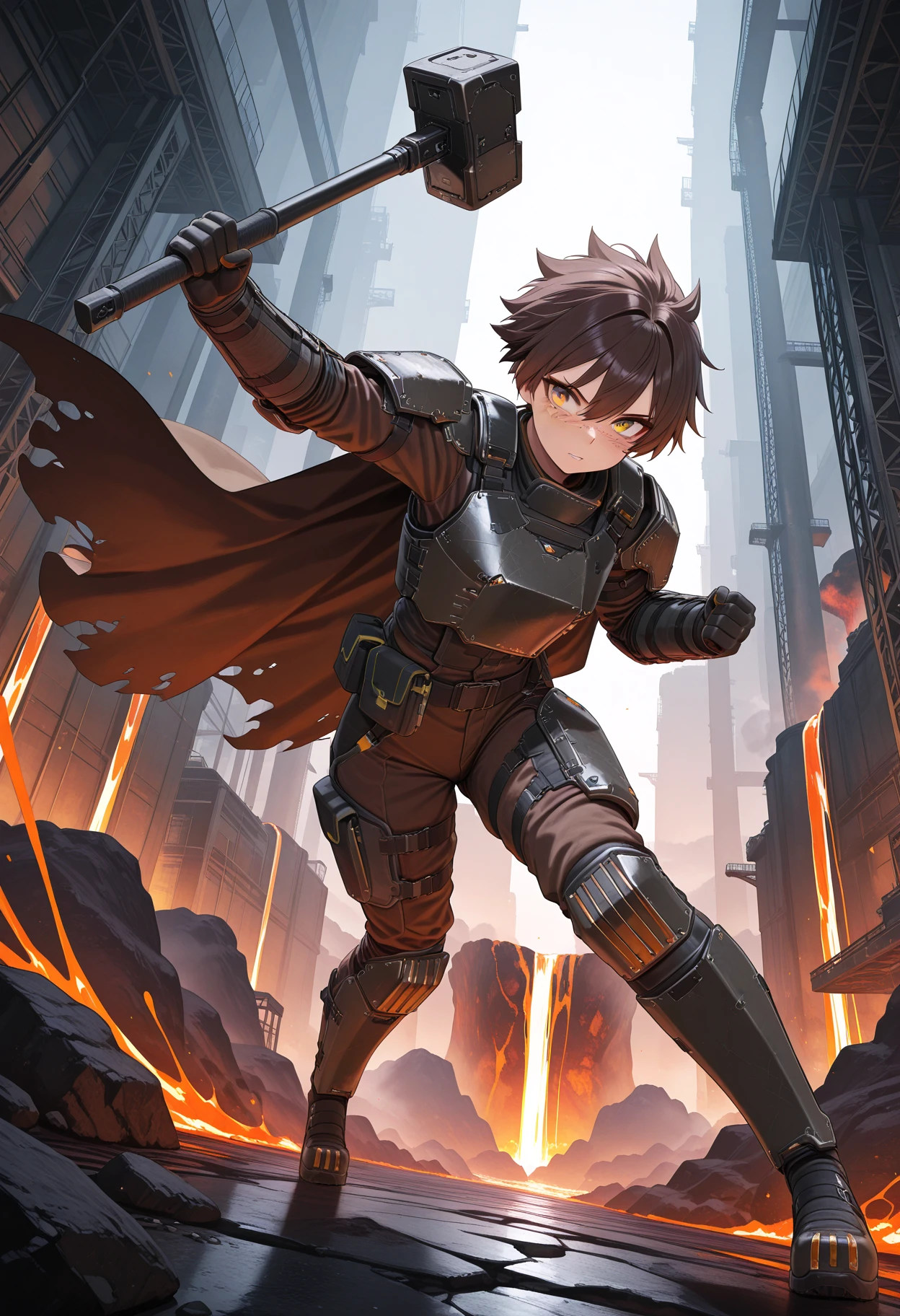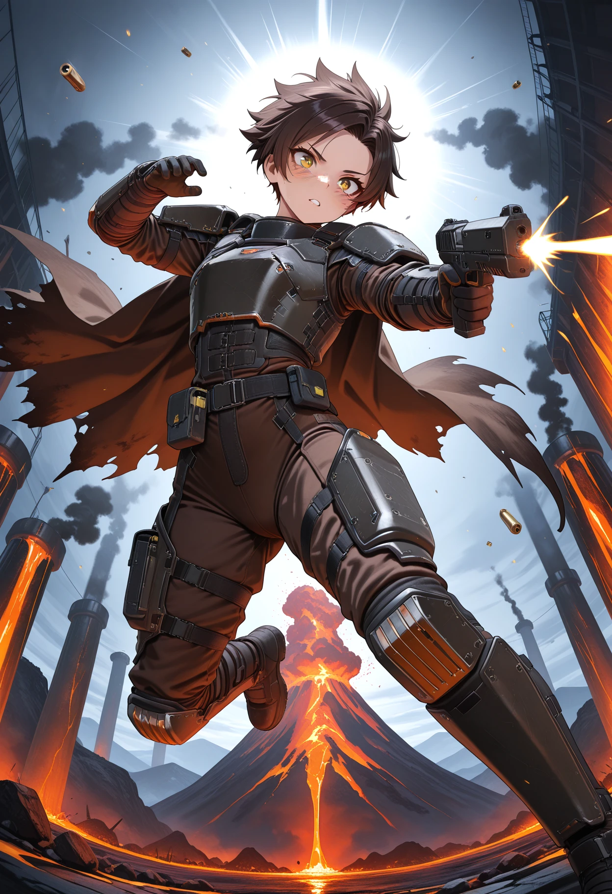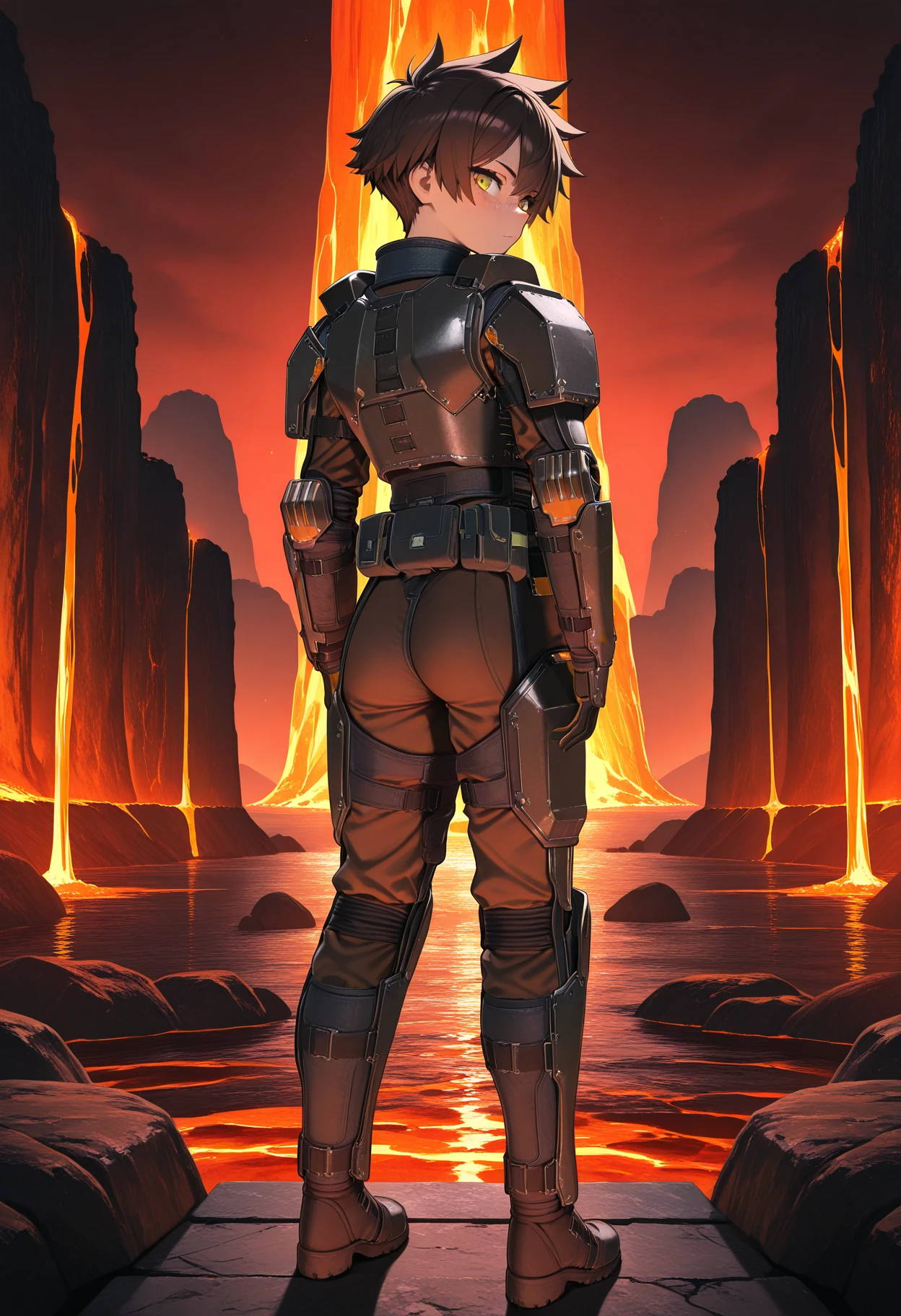 sa7headfirst, military uniform, brown jumpsuit, cuirass, belt, tactical pouches on belt, emblem on cuirass, shoulder armor, vambraces, gloves, side thigh armor, shin guards, boots, orange accents on armor,