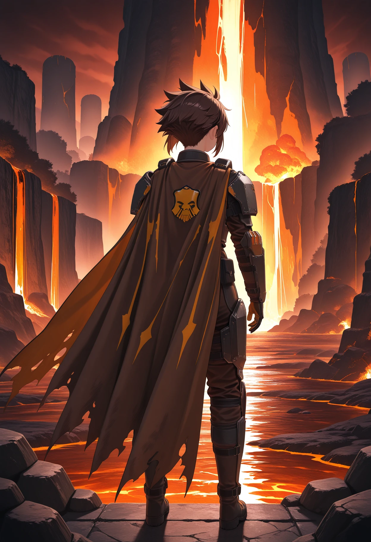 brown cape, torn cape,emblem on cape, orange arrow on cape,