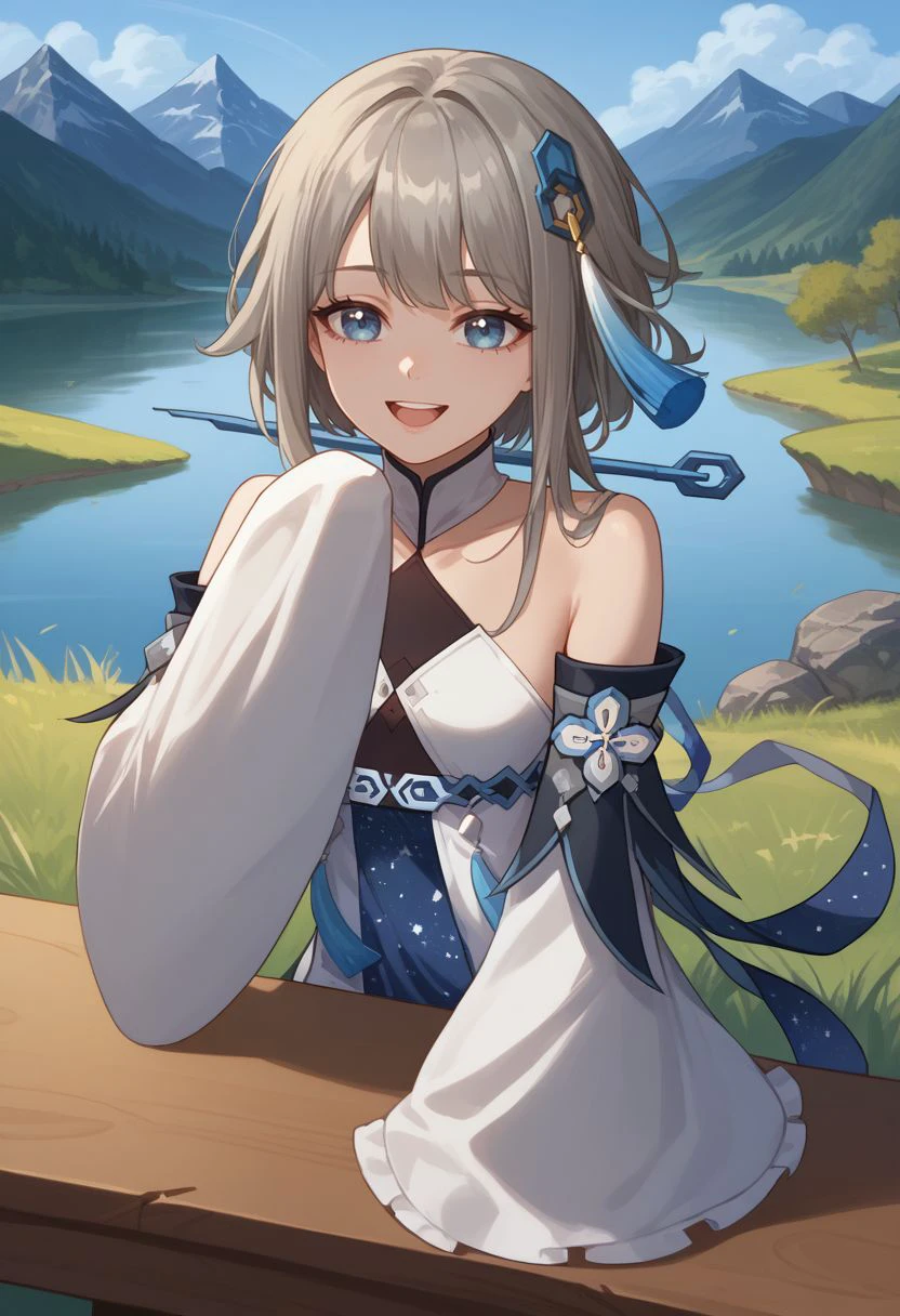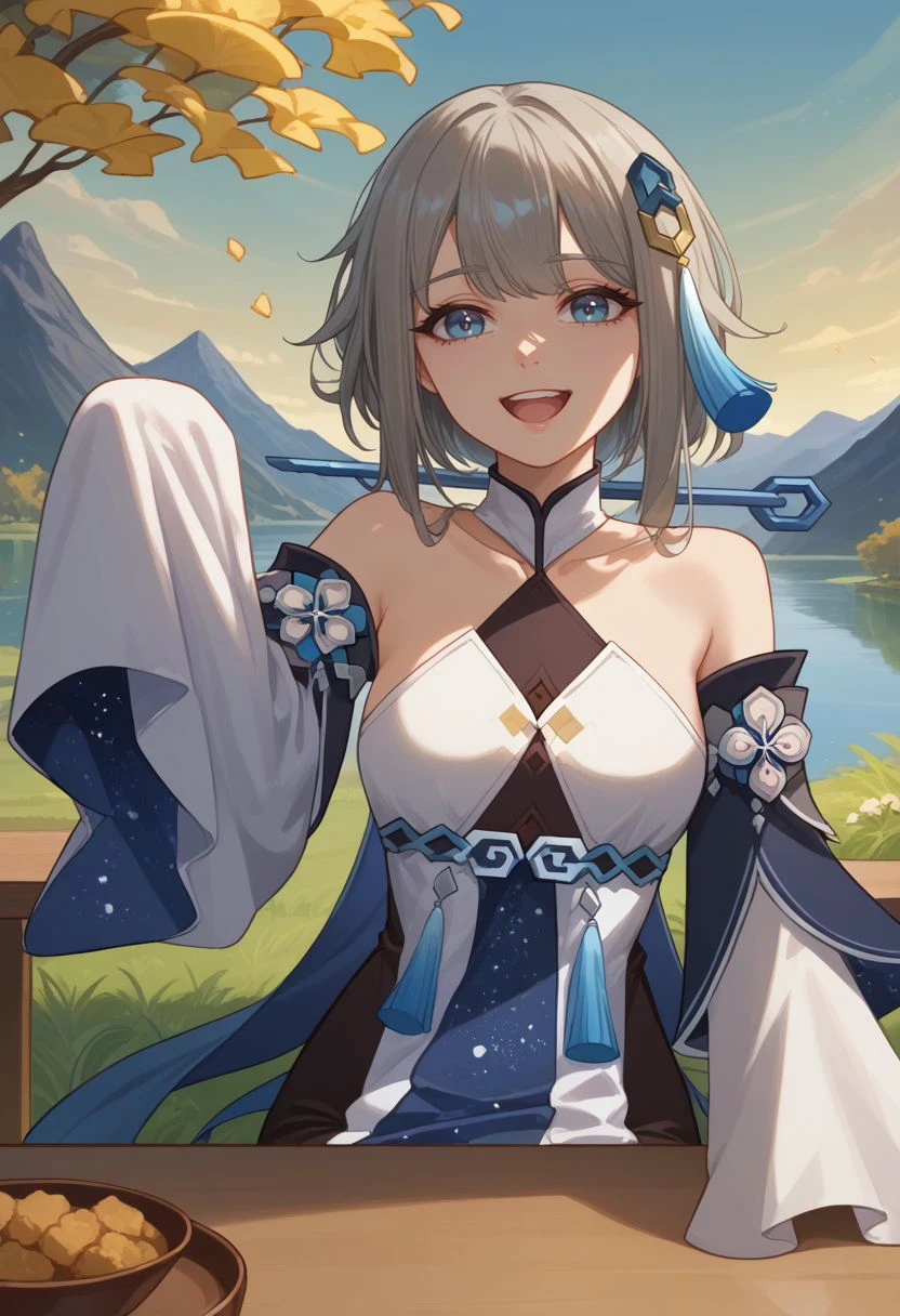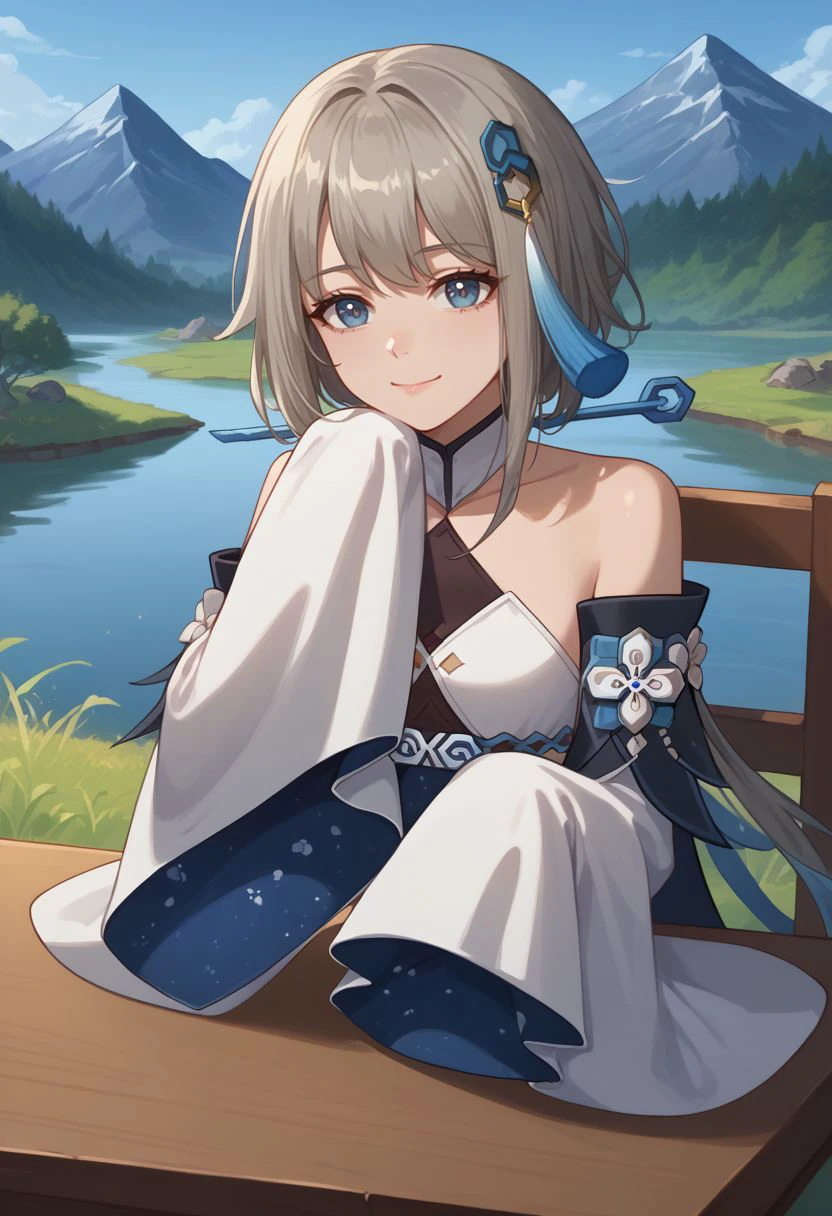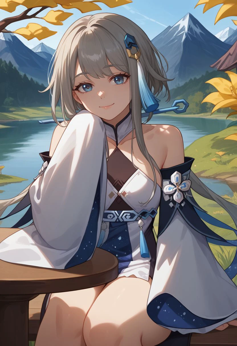 Appearance : guizhongdef, blue eyes, grey hair, long hair, sidelocks, hair ornament, tassel hair ornament, small breasts,