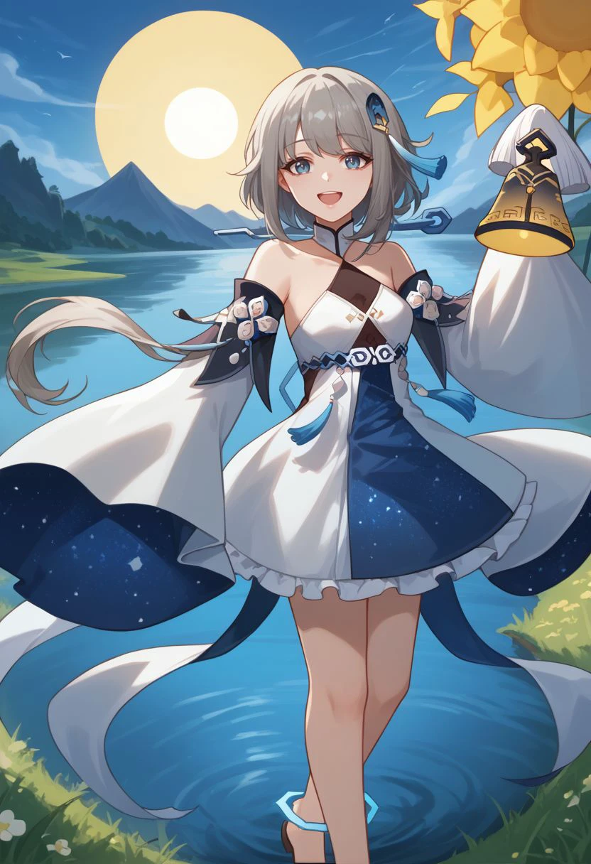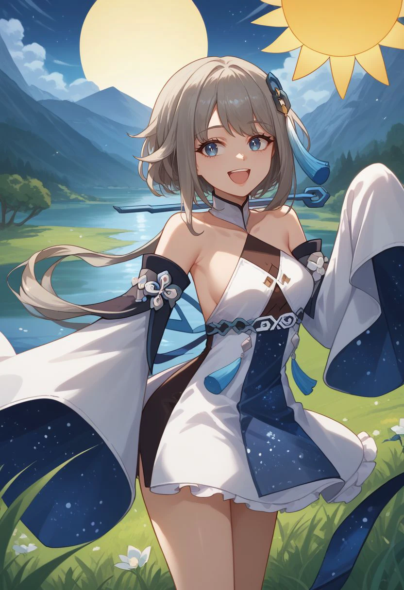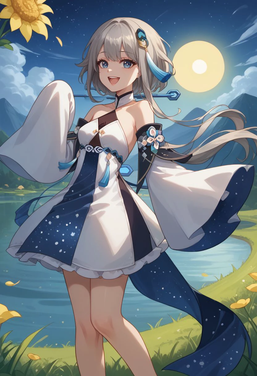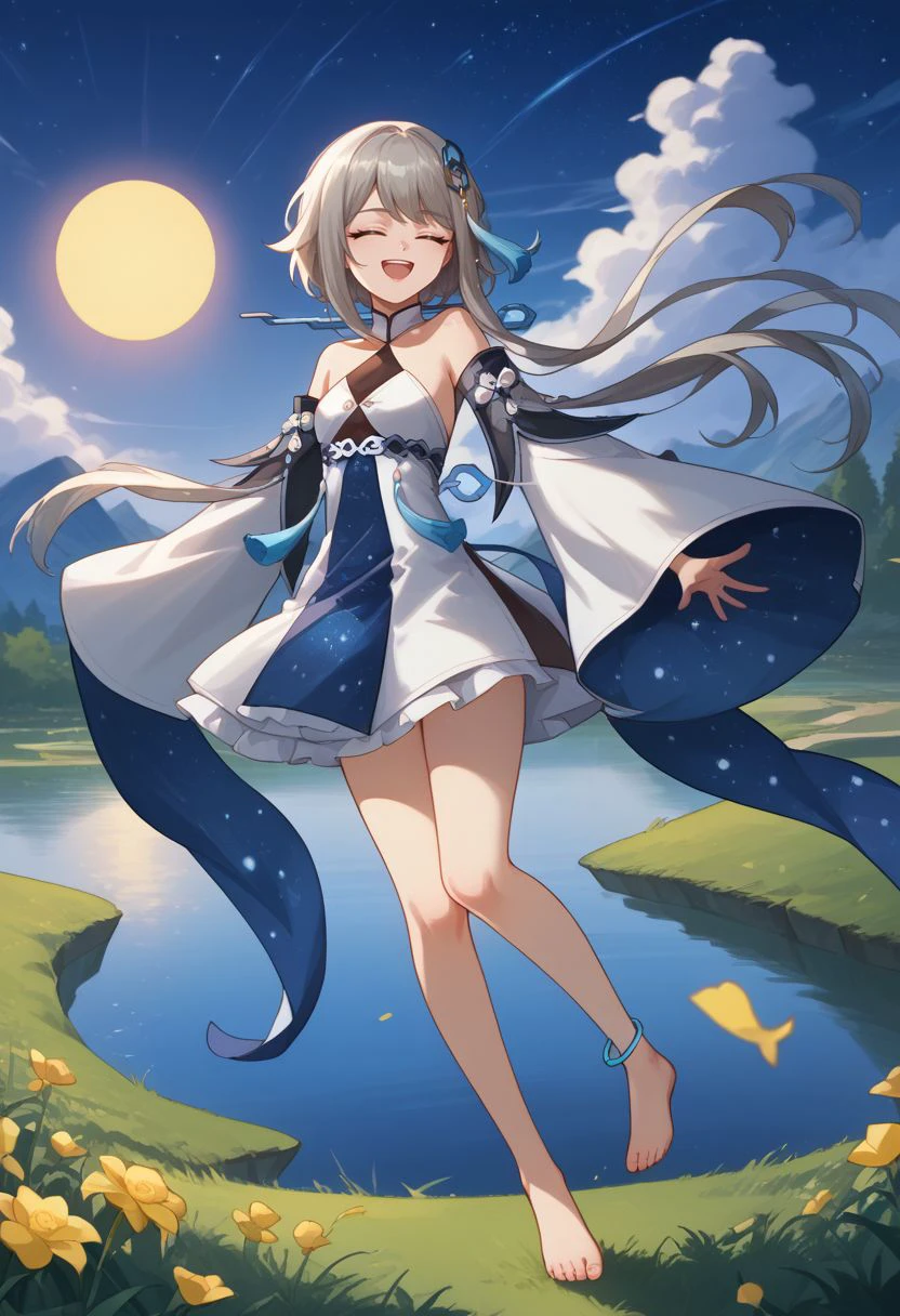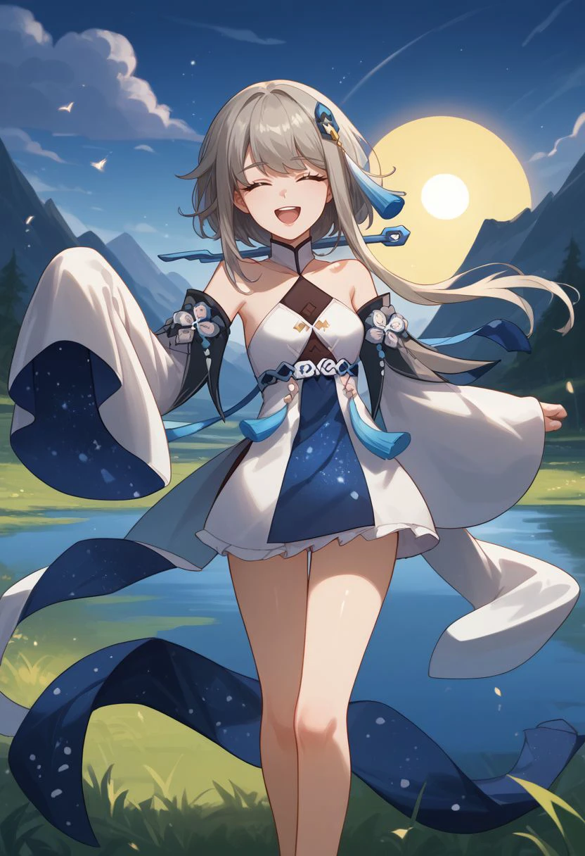 Outfit : bare shoulders, detached sleeves, wide sleeves, long sleeves, sleeves past fingers, white dress, halterneck, chinese clothes, starry sky print, tassel, anklet,