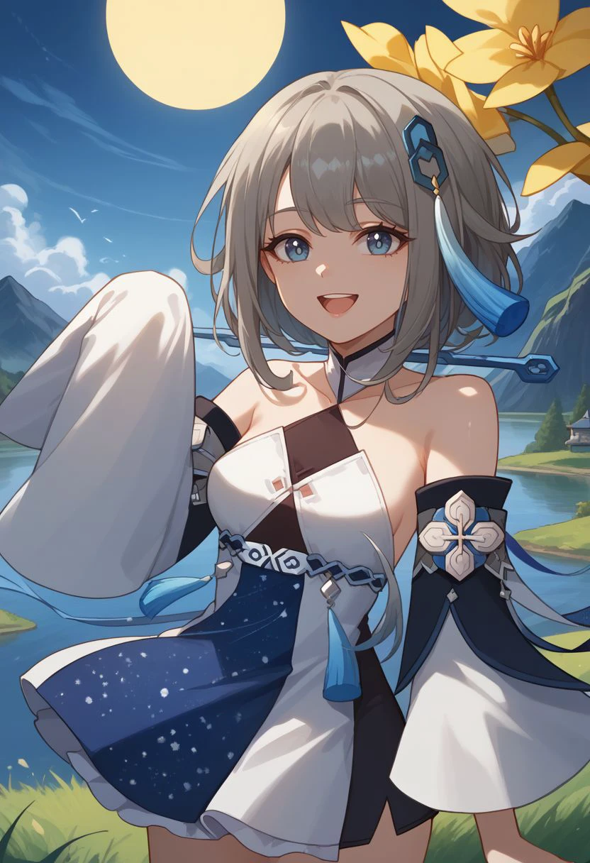 guizhongdef, blue eyes, grey hair, long hair, sidelocks, hair ornament, tassel hair ornament, small breasts,