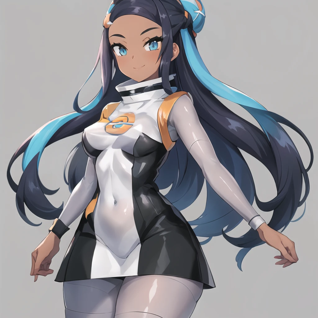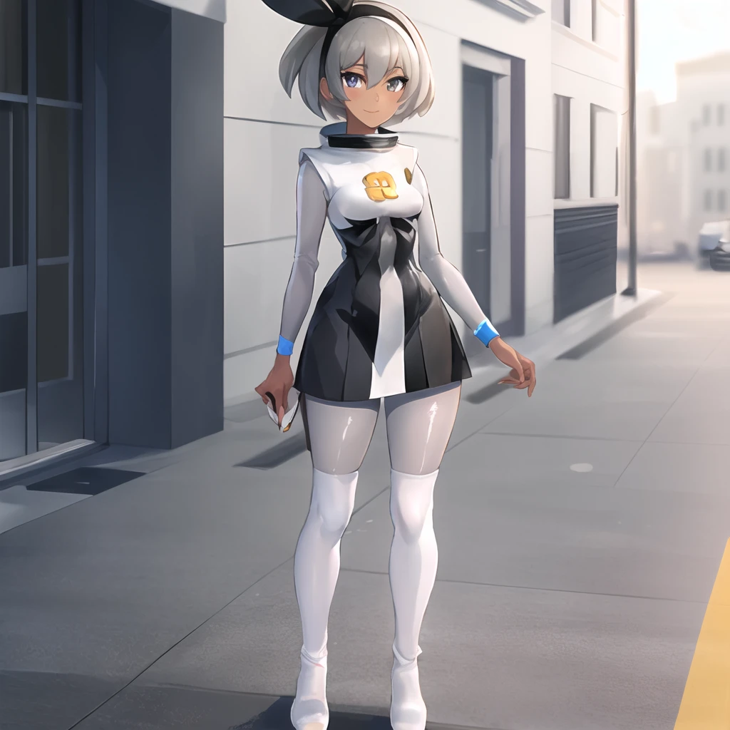 Clothing: uniform, dress, short dress, boots, grey boots, knee boots, grey footwear, pantyhose, long sleeves, bodysuit under clothes, bodysuit, grey bodysuit, high collar