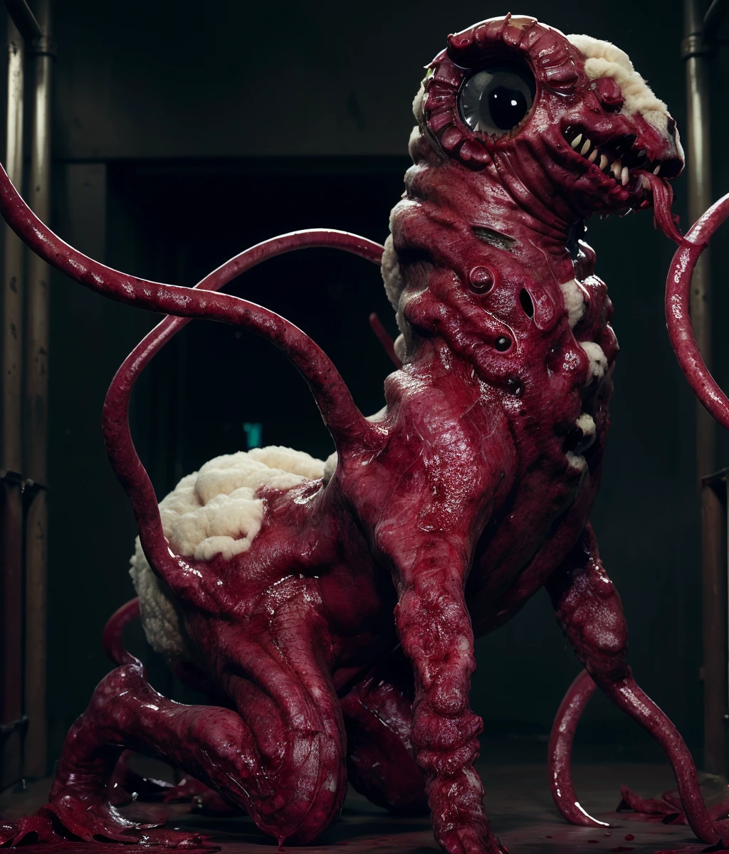 Tag:sharp_teeth,bifurcated jaw,blood from mouth,long tongue,sharp claws,arthropod limbs,exposed bone,tentacles,blood stain,deformed,creature,monster,no humans,body horror,horror \(theme\),Happy Meat Farms,