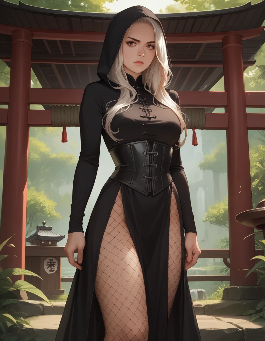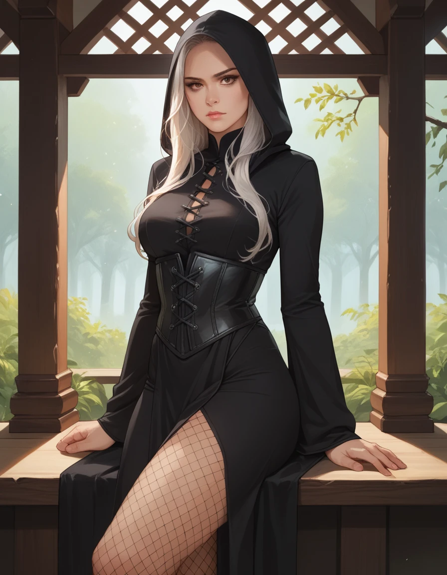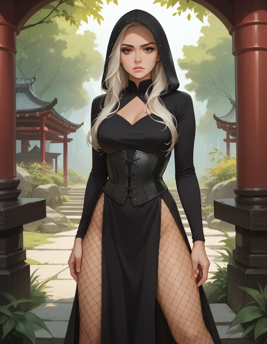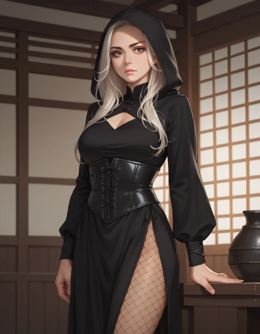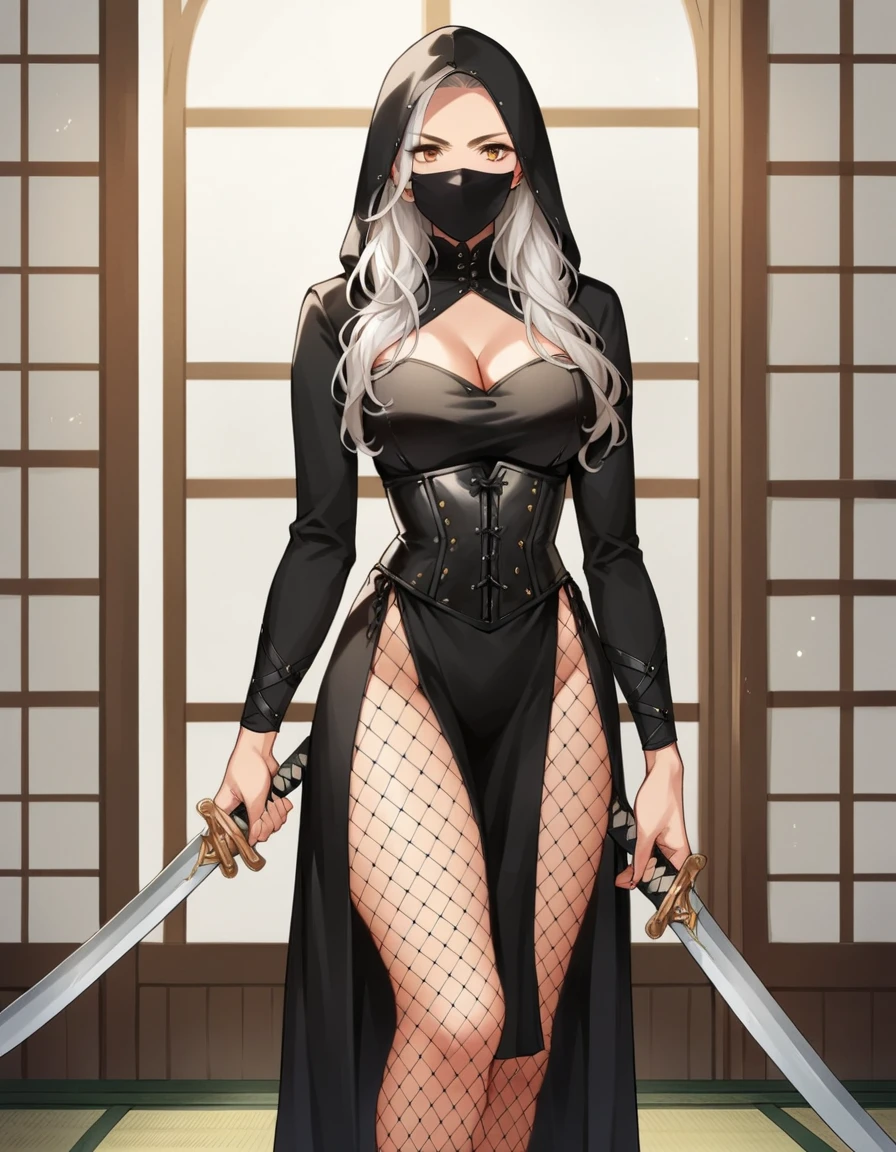 hud_smurai, black dress, pelvic curtain, long sleeves, corset, hood, mouth mask, fishnet pantyhose