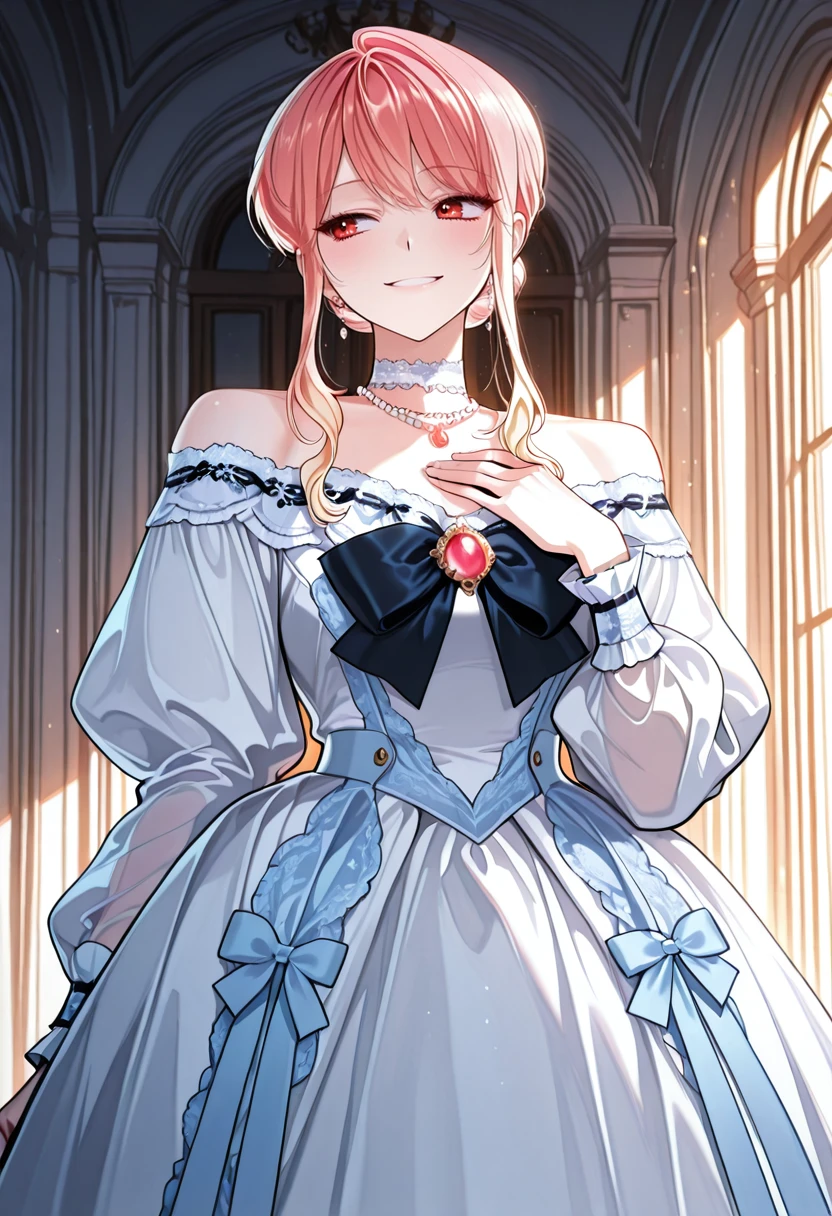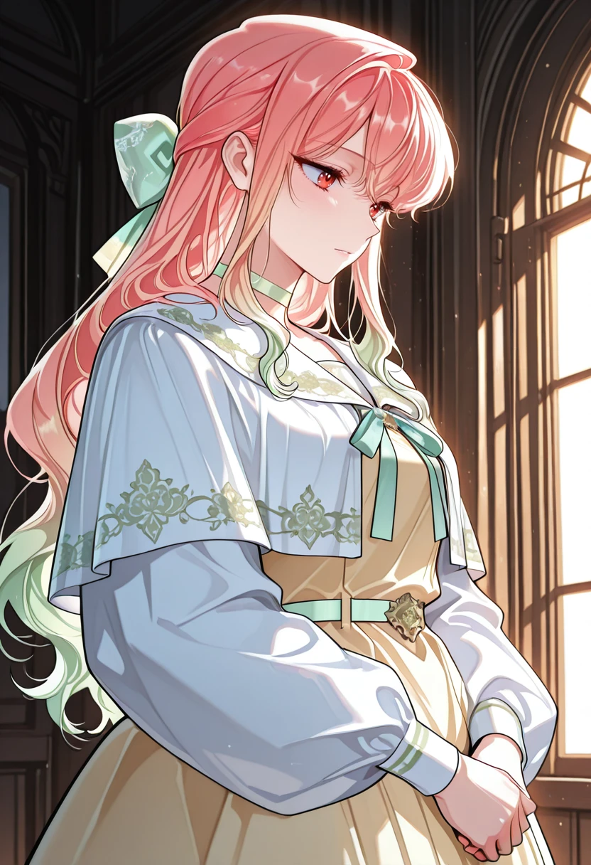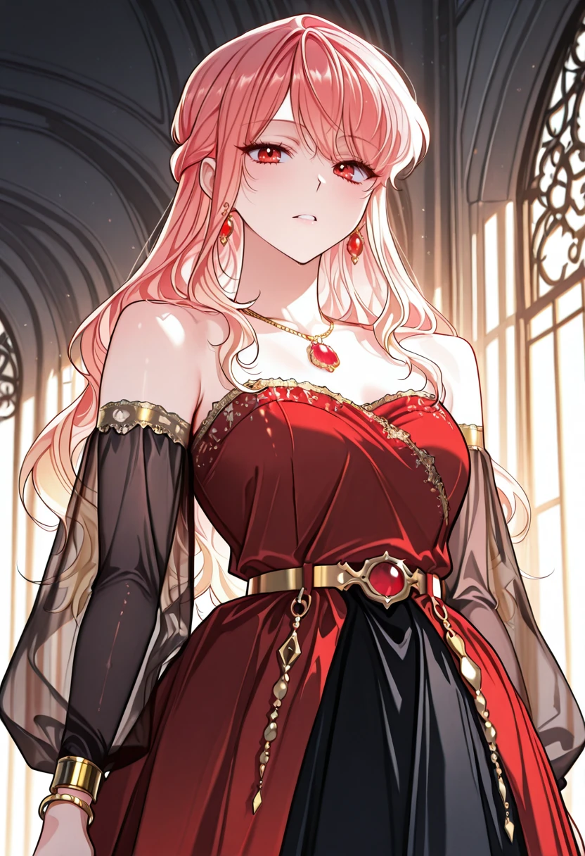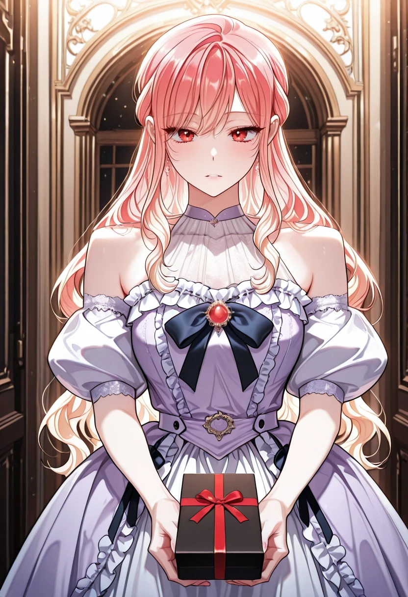 CamilaSorpel, red eyes, pink hair, long hair, wavy hair, loose hair, gradient hair, blonde hair