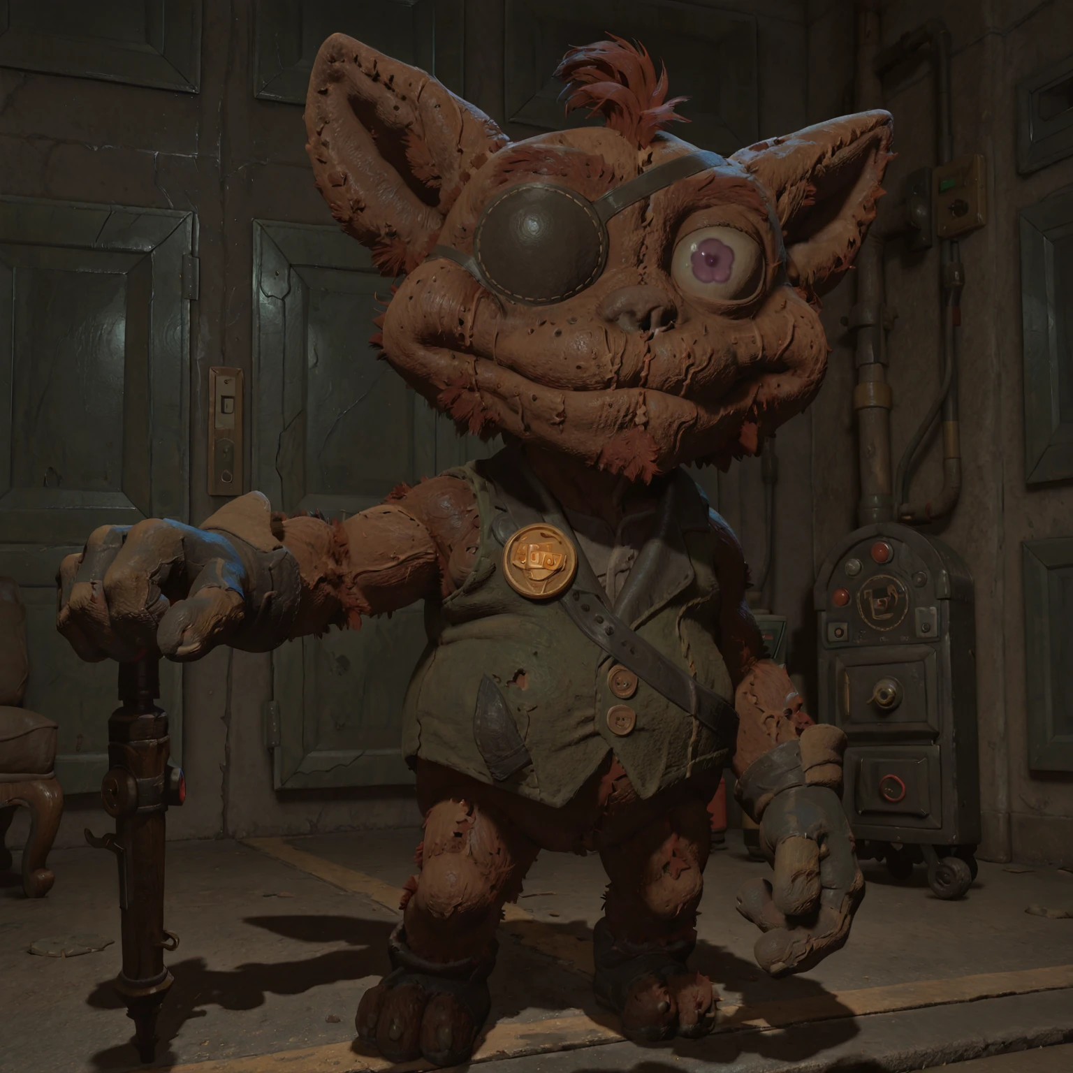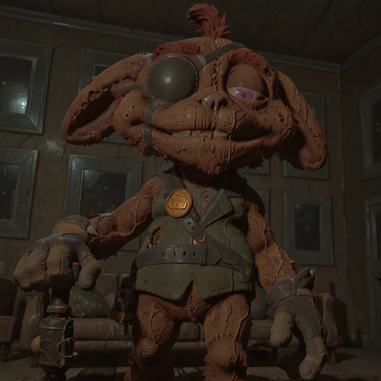 1boy, male, furry, furry male, toy, solo, brown fur, two-tone fur, hair tuft, purple eye, pointed ears, damaged, stitches