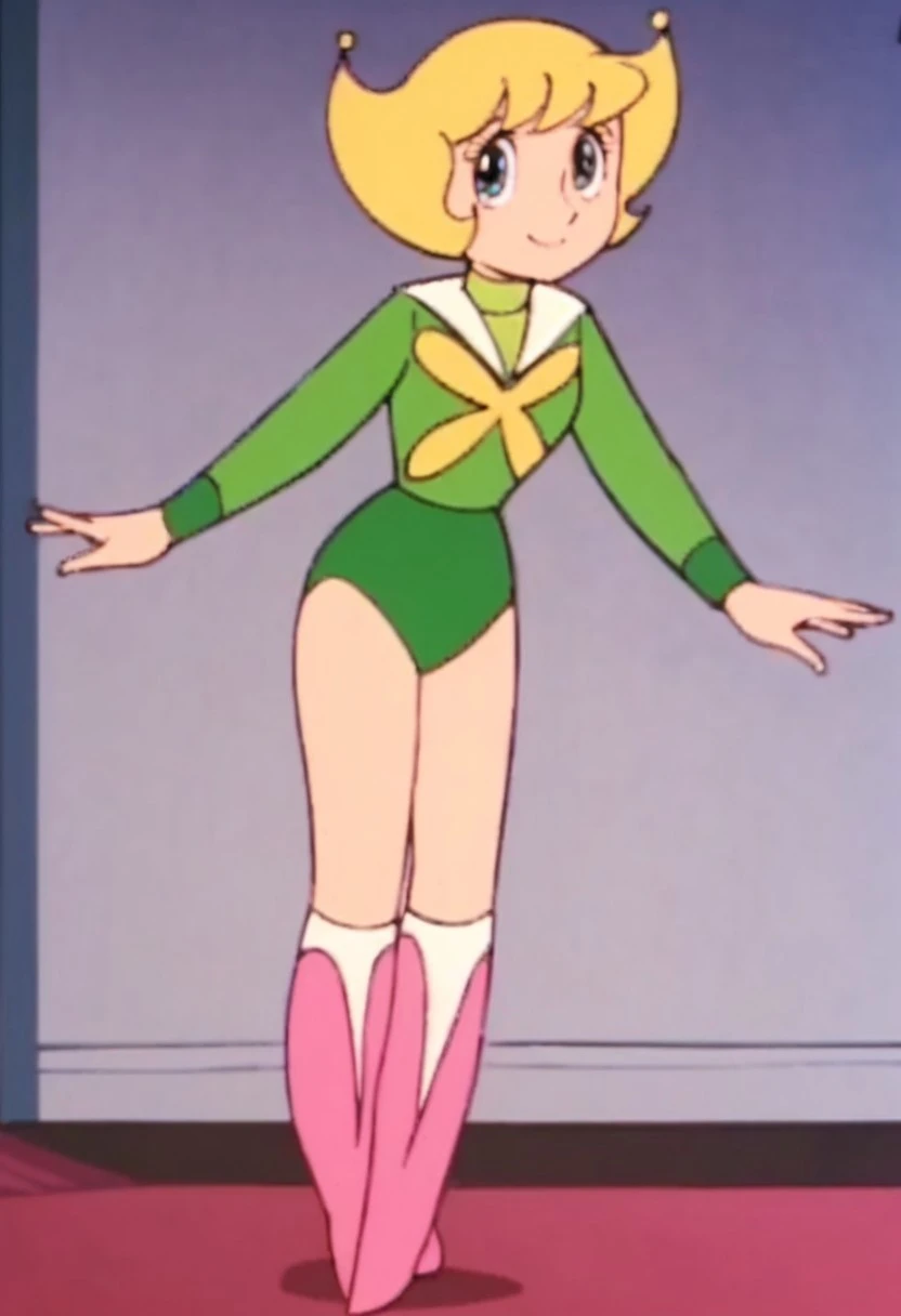 Miri, 1girl, female, blonde hair, yellow hair, light green shirt, long sleeve shirt, green buruma, bare legs, high pink boots, soft smile, curvy, light blue eyes, cute, white sailor-style collar, yellow ribbon on chest, light green serafuku shirt,