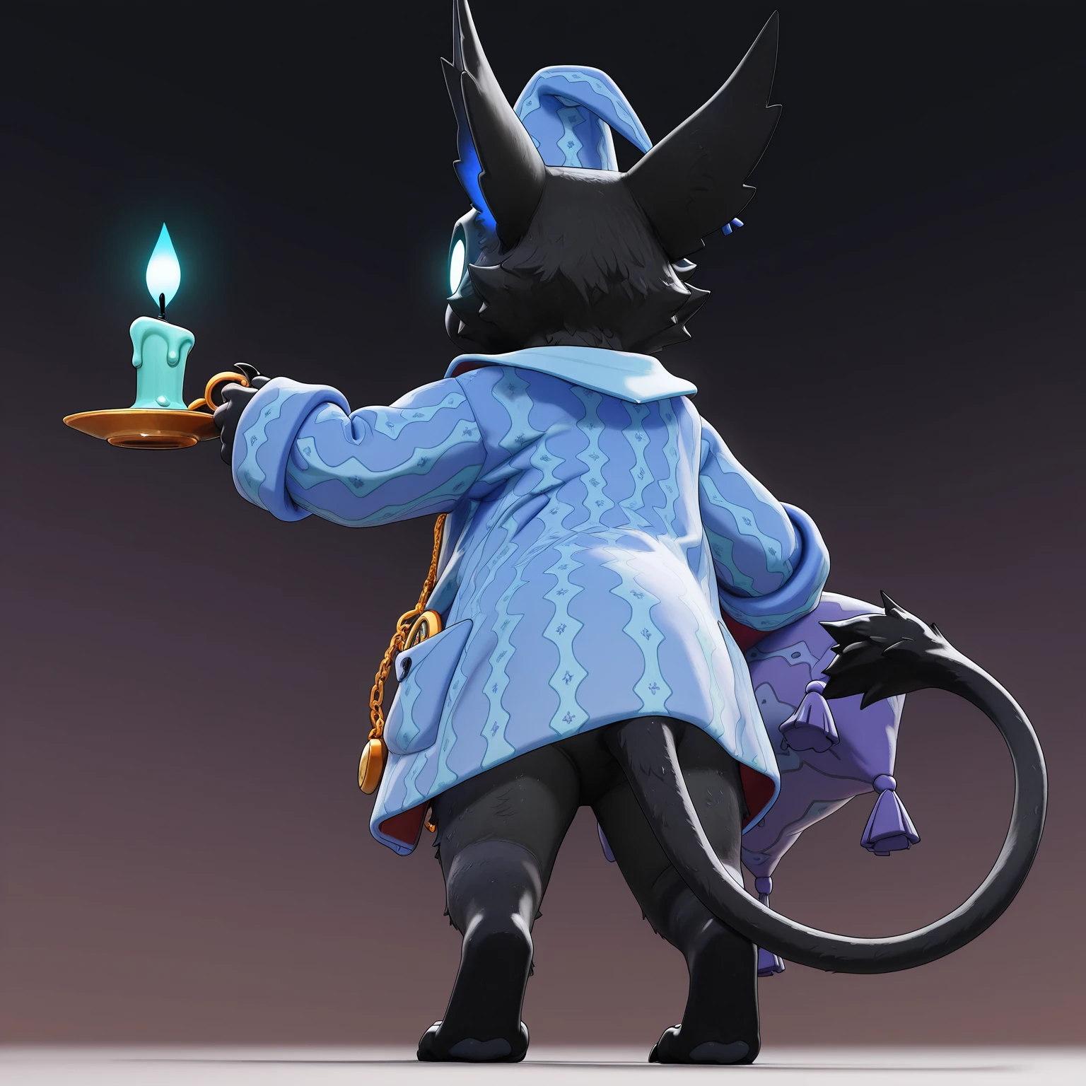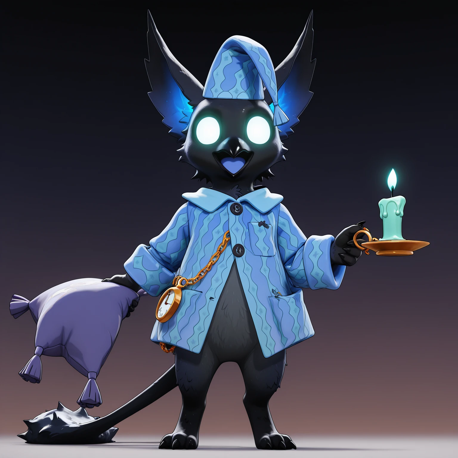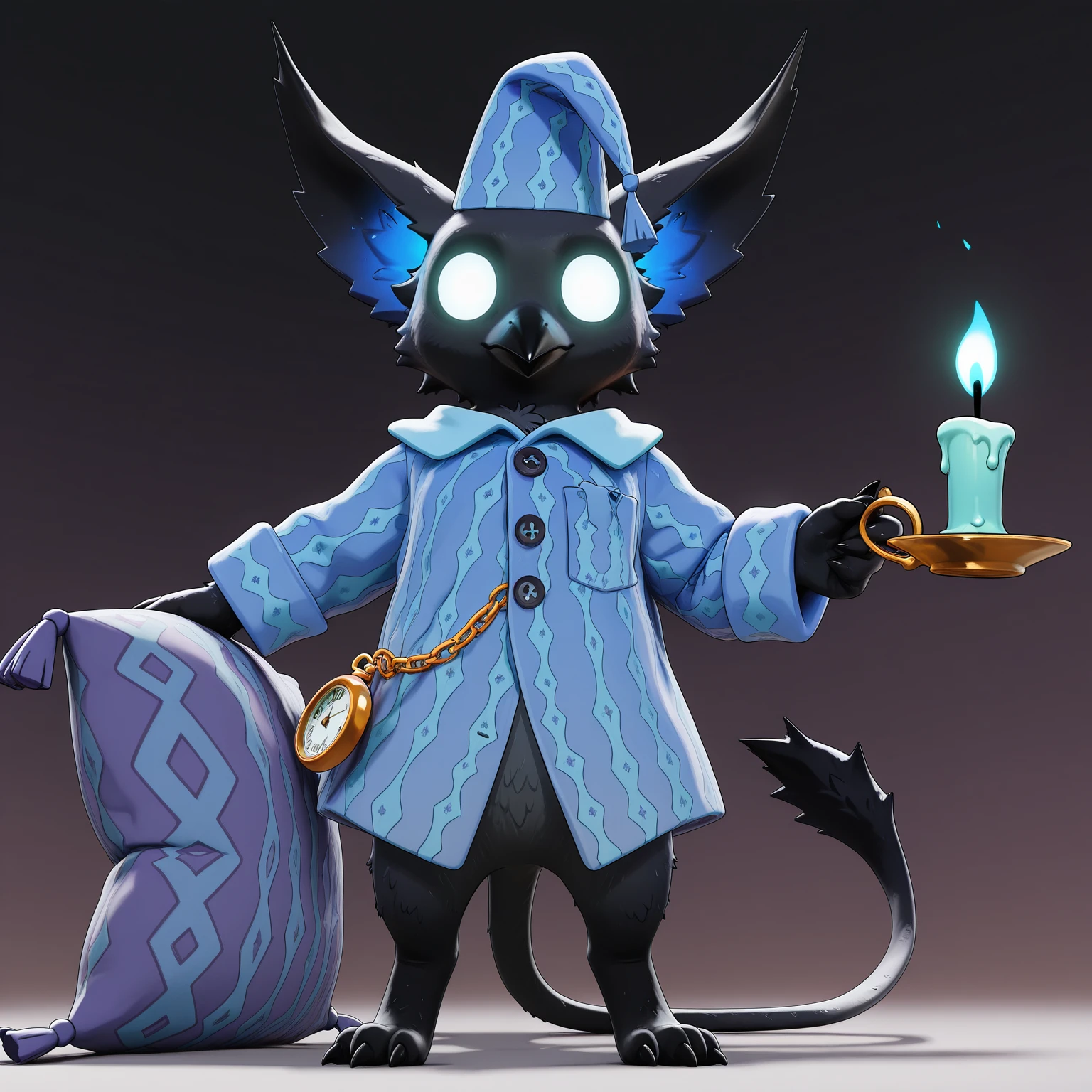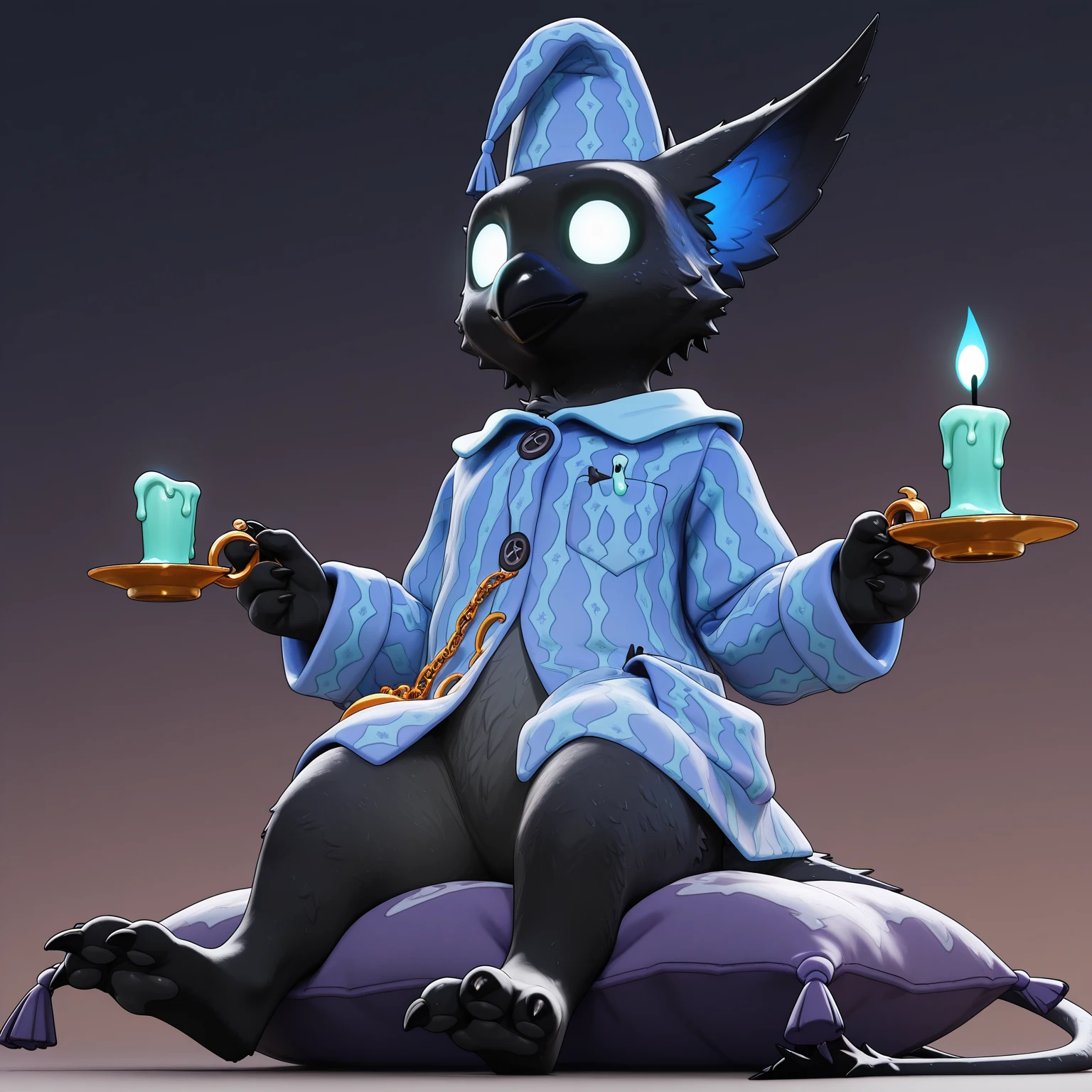 1boy, male, furry, anthro, creature, bird-like, solo, black fur, white eyes, glowing eyes, no pupils, black beak, pointed ears, sharp nails, tail, tail tuft, pawpads, short