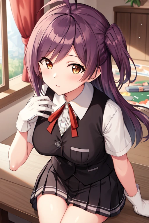hagikazeKC,brown eyes, purple hair,one side up,long hair,ahoge,white shirt, short sleeves, pleated skirt,white gloves, black skirt, red ribbon, neck ribbon, black vest, breasts,