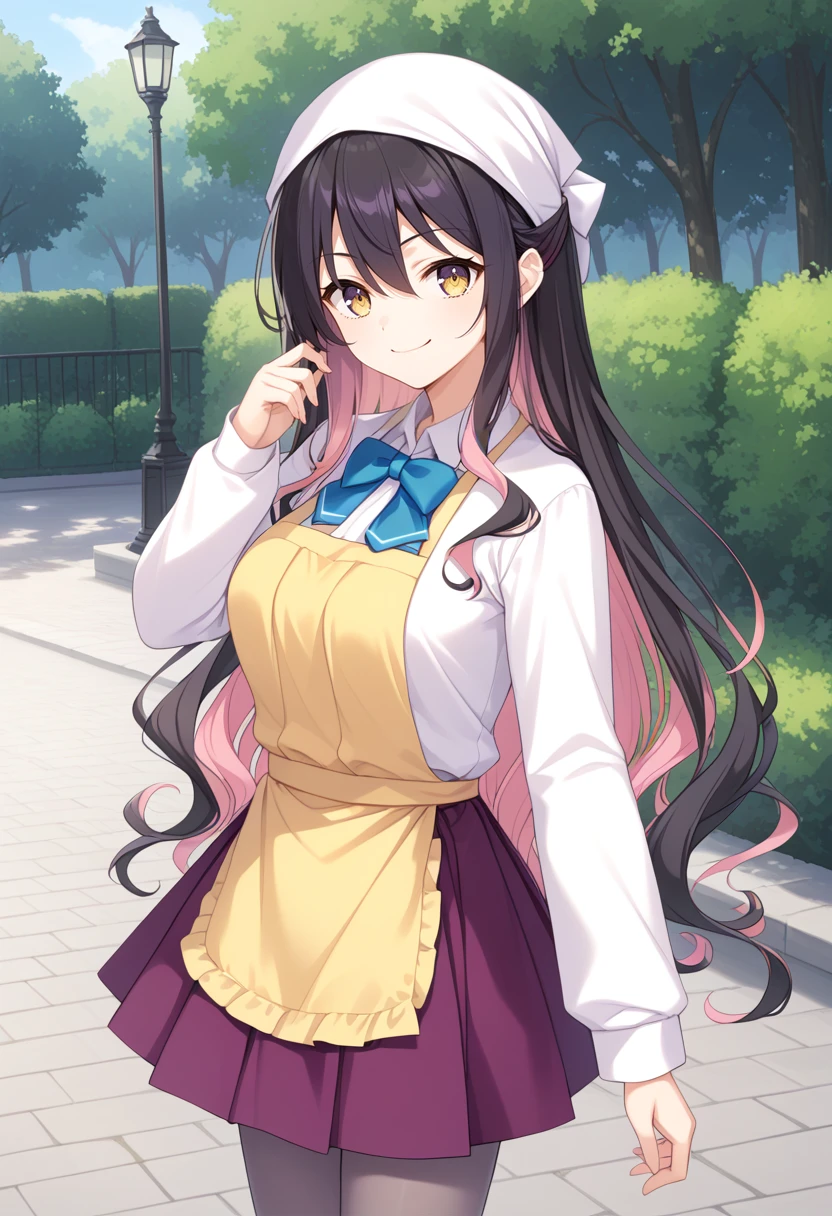 Original base : naganamikc, multicolored hair, black hair, pink hair, colored inner hair, hair bow, orange bow, wavy hair, very long hair, bangs, hair between eyes, purple eyes, yellow eyes, gradient eyes