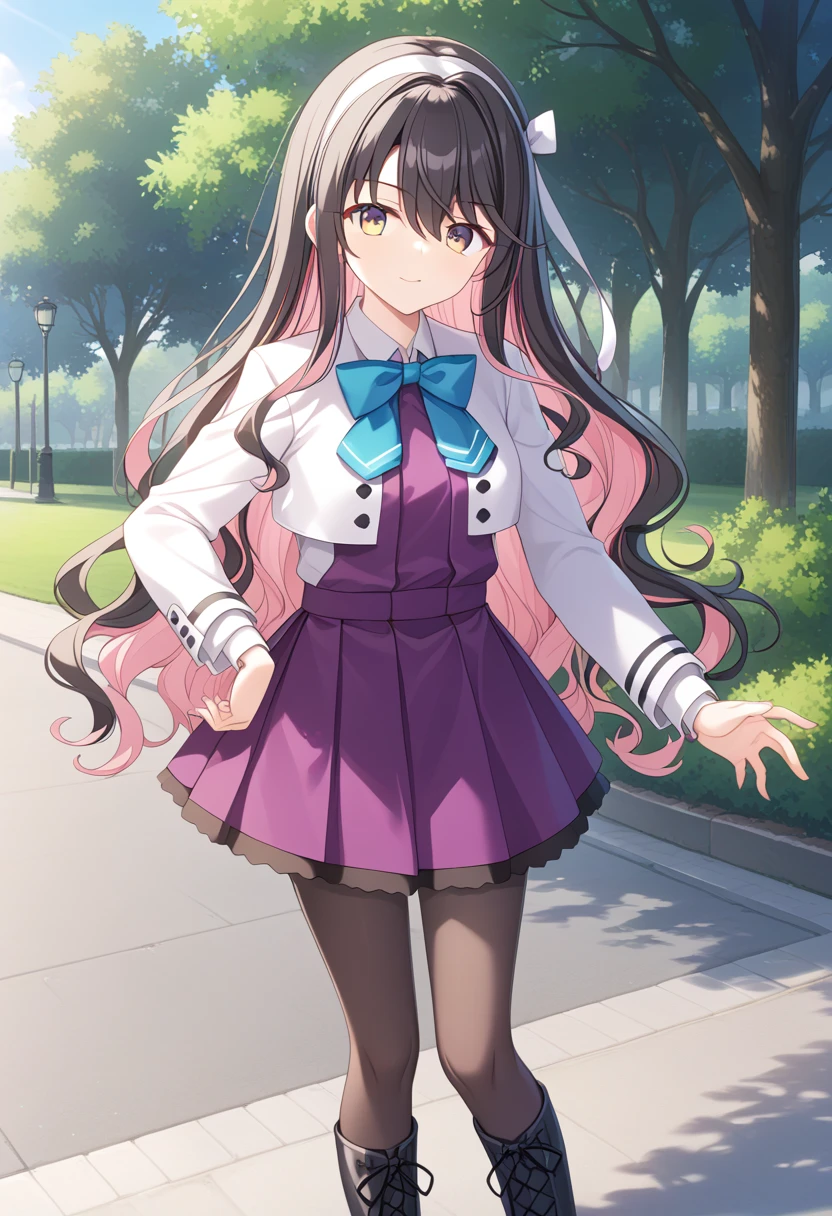 Kai-2 outfit : naganamikaikc, white_jacket, crop jacket, purple dress, blue bowtie, purple skirt, pleated dress, grey pantyhose, boots