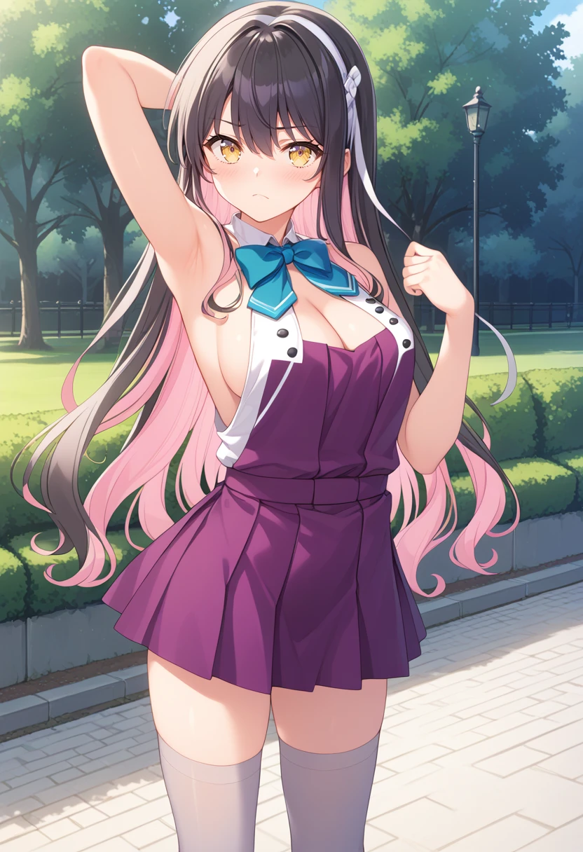 Default outfit : medium breasts, naganamidefkc, halterneck_sleeveless_dress, purple dress, white shirt, white sleeves, long sleeves, blue bowtie, purple skirt, pleated dress, grey pantyhose, boots
