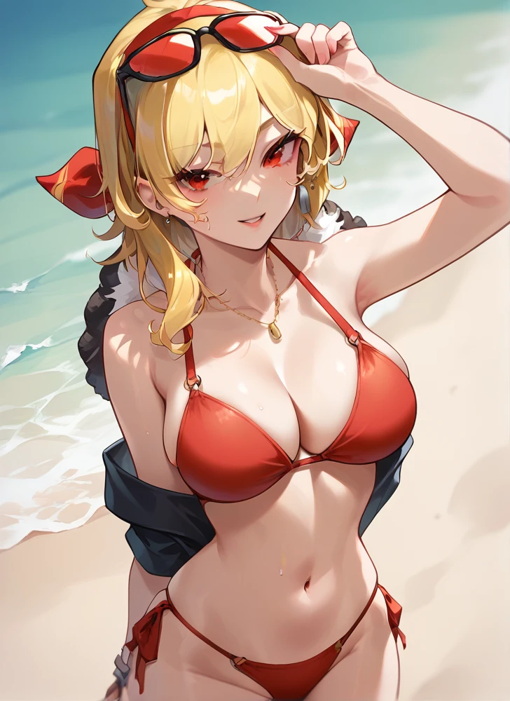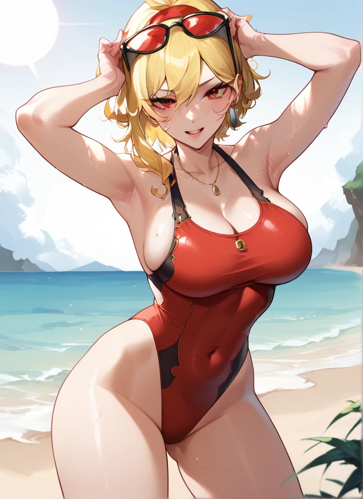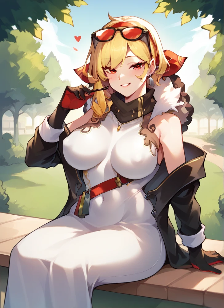 Trigger: KaelaPony, red eyes, eyewear on head, blonde hair, gloves, white dress, large breasts,