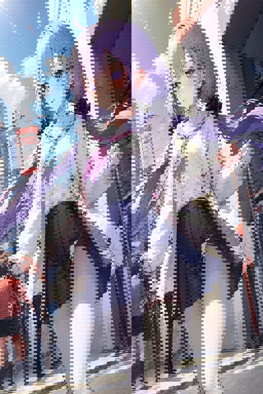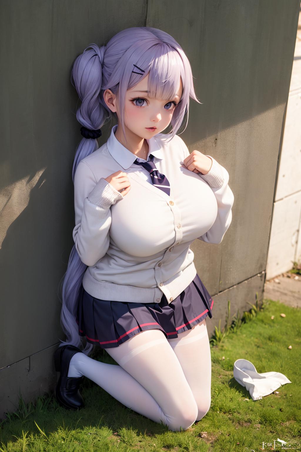 white cardigan, white pantyhose, hair ornament, black scrunchie, pleated skirt, pink neckerchief, school uniform