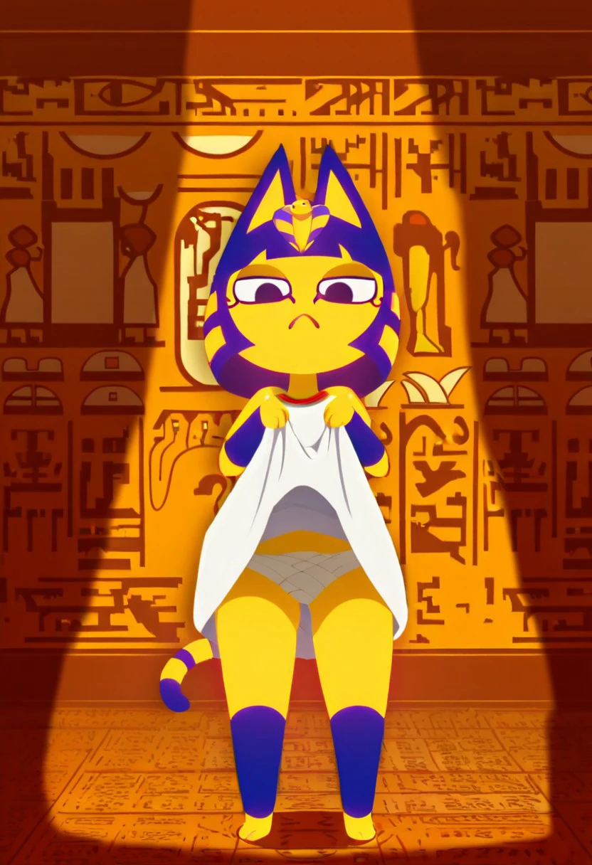 Recommended prompts: egyptian, cat girl, furry, furry female, cat tail, striped tail, cat ears, black eyes, short hair, colored skin, yellow skin, head ornament, snake hair ornament, pawpads, bob cut