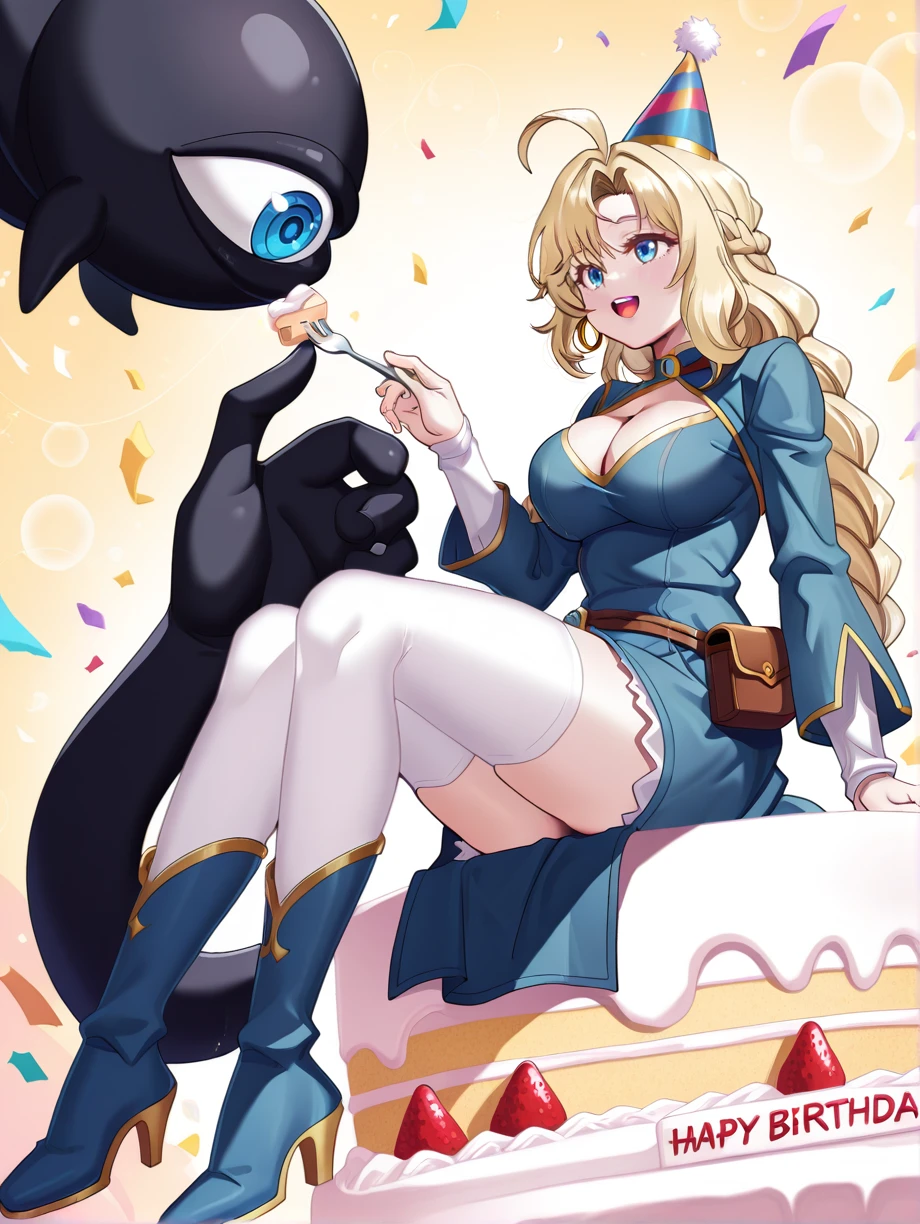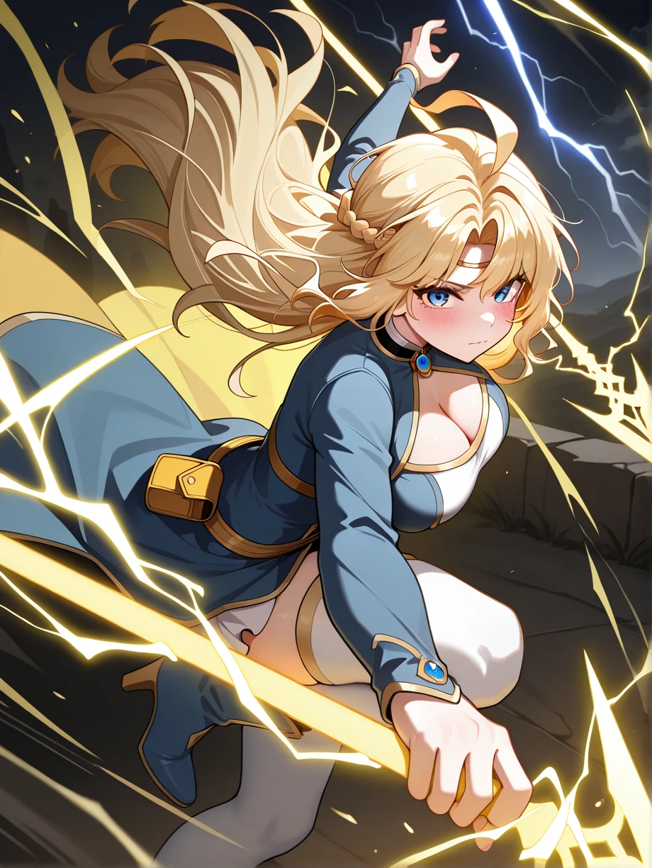 CarolOdin, long hair, blue eyes, blonde hair, thighhighs, breasts, white thighhighs, boots, head hoop, blue footwear, ahoge, long sleeves, high heels, high heel boots, large breasts, pouch, dress, braid, cleavage