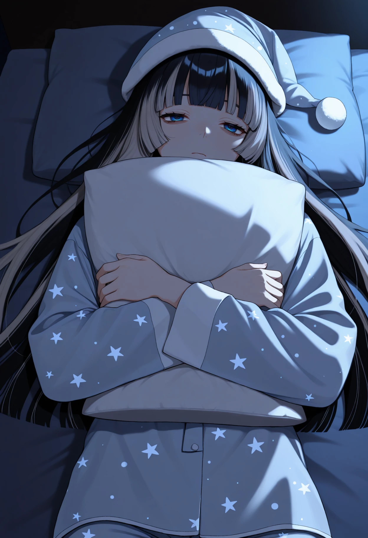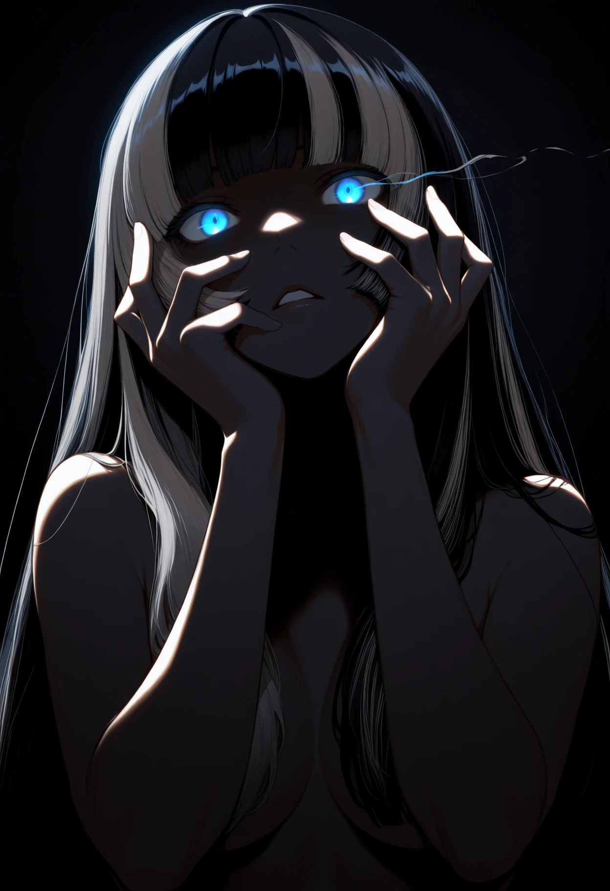Juufuut3iRdn, blue eyes, black hair, grey hair, multicolored hair, long hair, hime cutDefault Outfit: