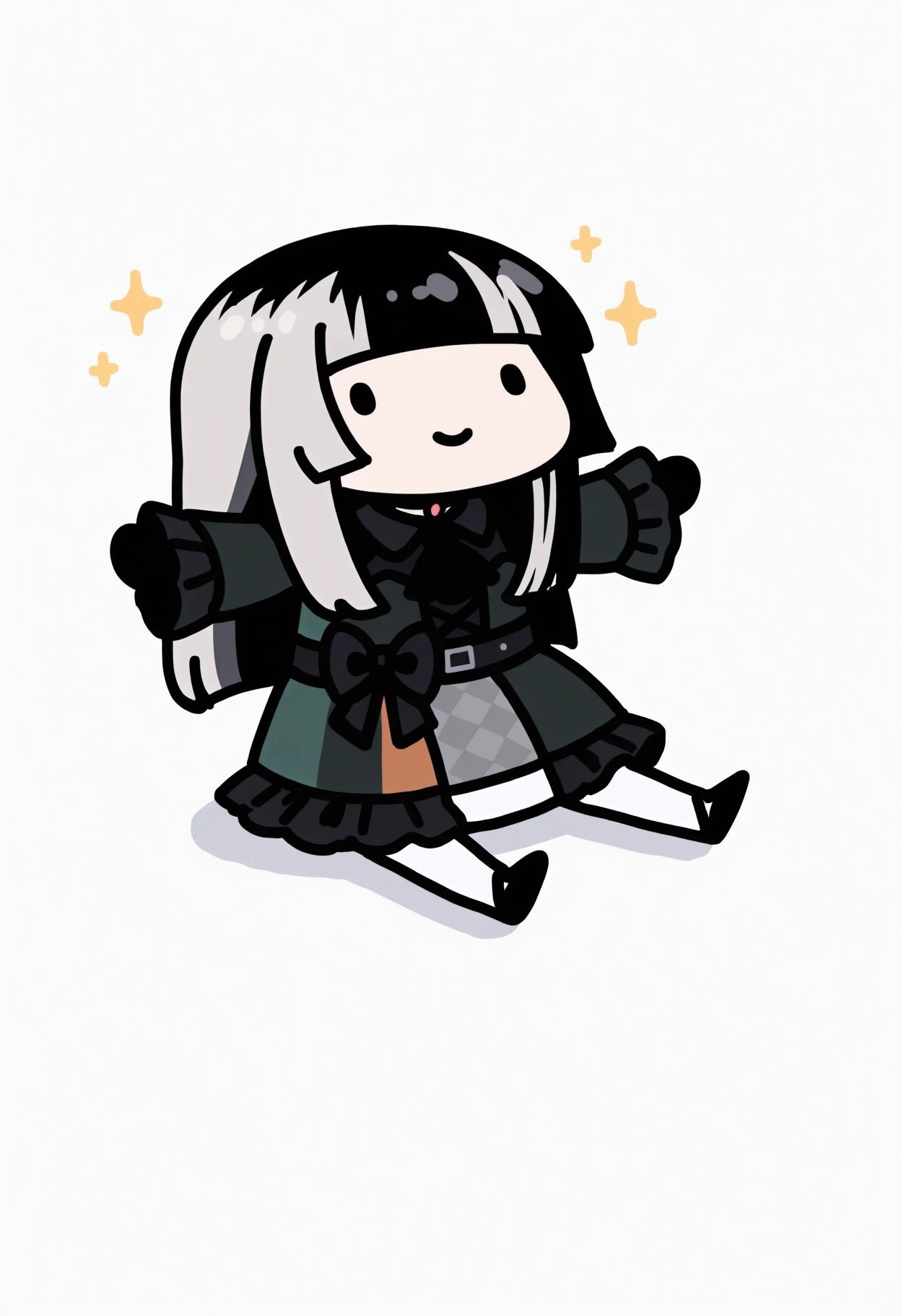 R4denDef, blue eyes, black hair, grey hair, multicolored hair, long hair, hime cut, choker, black ascot, multicolored dress, black dress, green dress, frills, black bow, waist bow, long sleeves, black gloves, white pantyhoseReGLOSS Outfit: