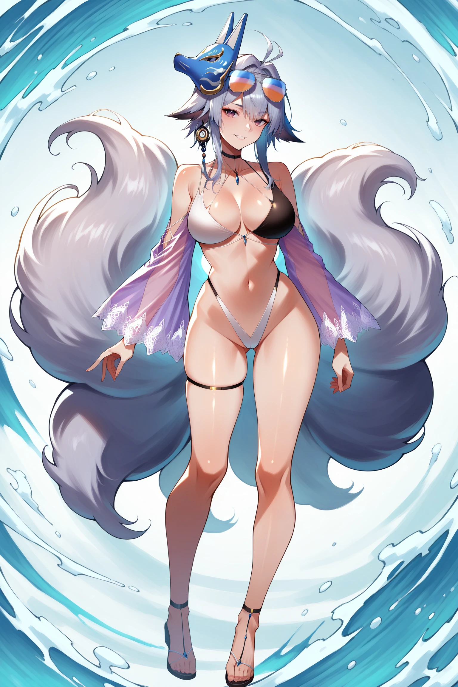 antenna hair, braided pontytail, hair scrunchie, sidelocks, animal ears, fox mask on head, eyewear on head, tassel earrings, choker, halterneck, two-tone bikini, see-through purple sleeves, multiple tails, highleg bikini, thigh strap, anklets