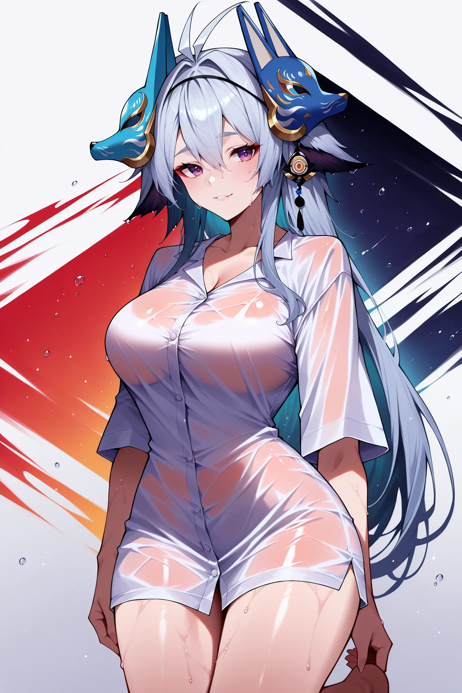 antenna hair, long hair, sidelocks, animal ears, fox mask on head, hairband, tassel earrings, naked shirt, wet shirt, see-through shirt, bare legs