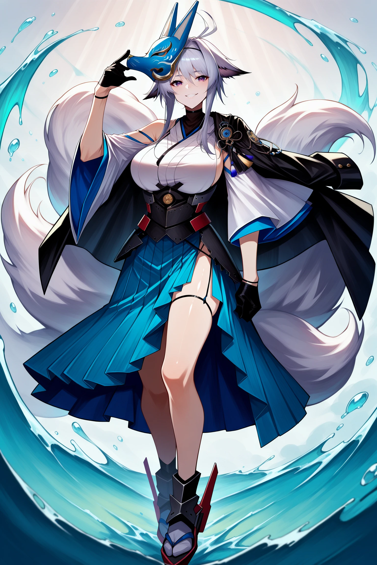 antenna hair, low ponytail, sidelocks, animal ears, fox mask on head, hairband, choker, turtleneck, black jacket on shoulders, white kosode, detached wide sleeves, half gloves, armor, multiple tails, blue hakama skirt, side slit, thigh strap, tabi, rudder footwear