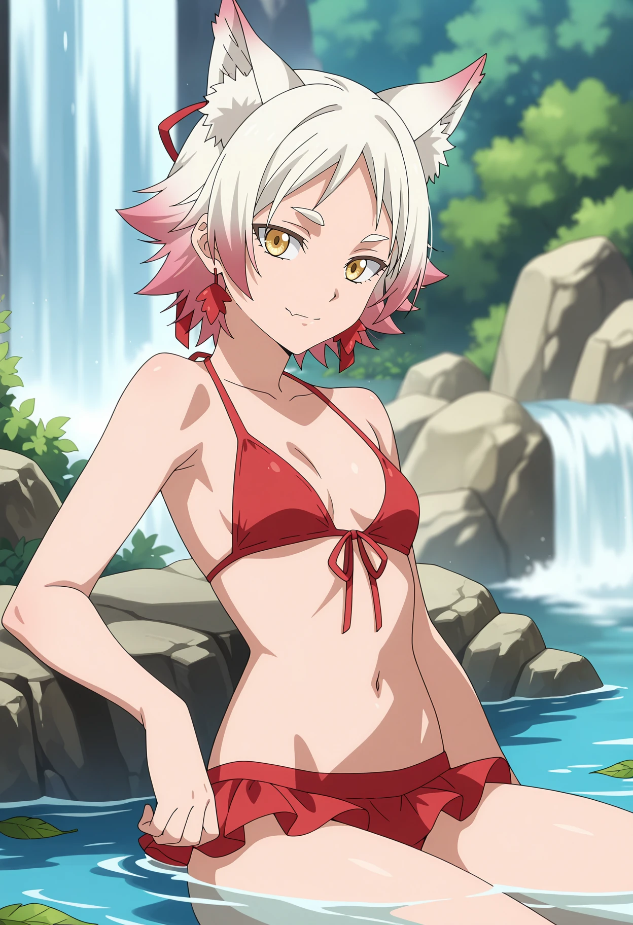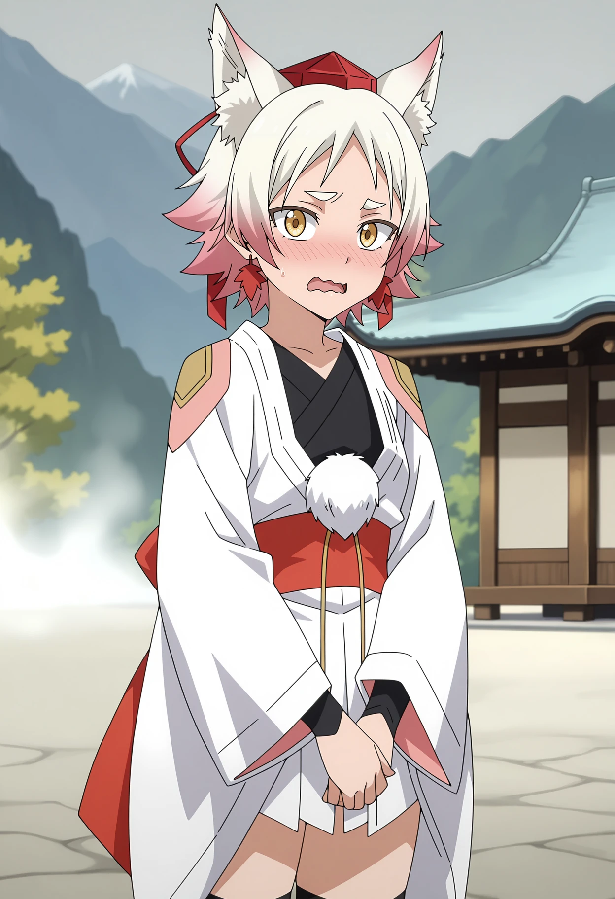 multicolored hair, short hair, white hair, pink hair, yellow eyes, wolf ears, hair ribbon, leaf earrings, tokin hat, red headwear, white kimono, black shirt, red sash, pom pom \(clothes\), long sleeves, black thighhighs
