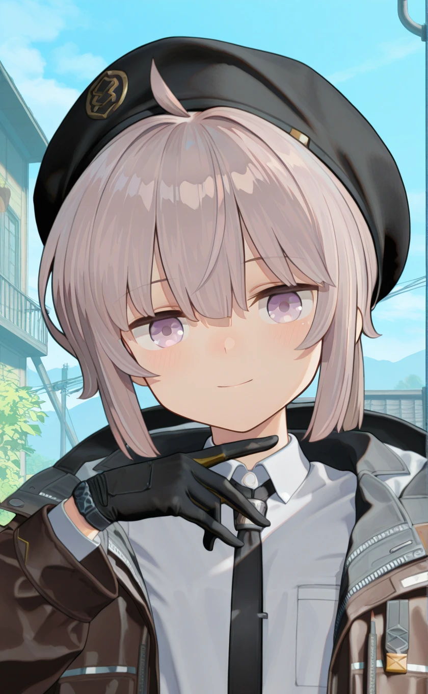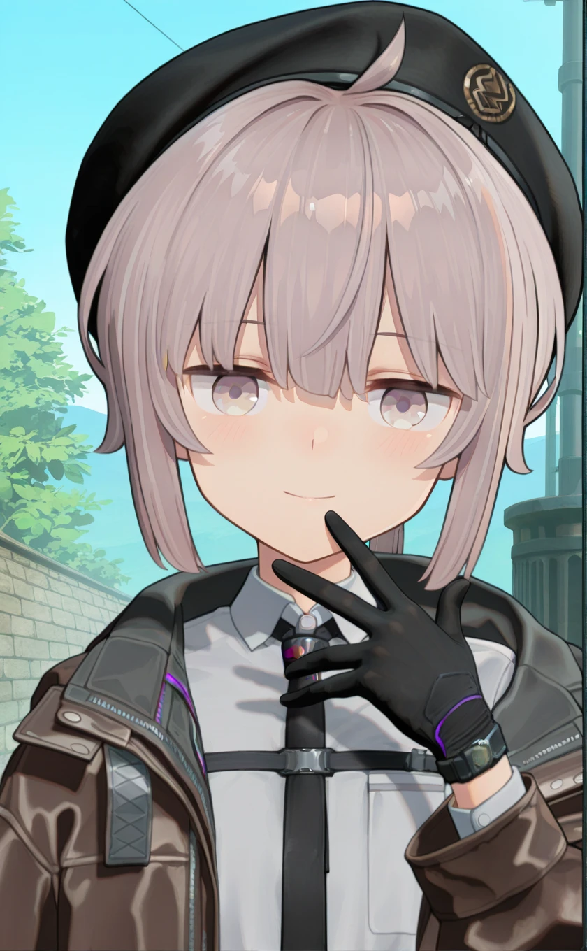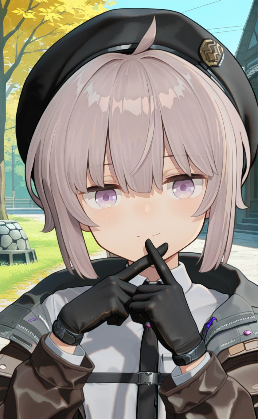 beret,black headwear,ahoge,short hair,grey hair,sidelocks,blunt bangs,purple eyes