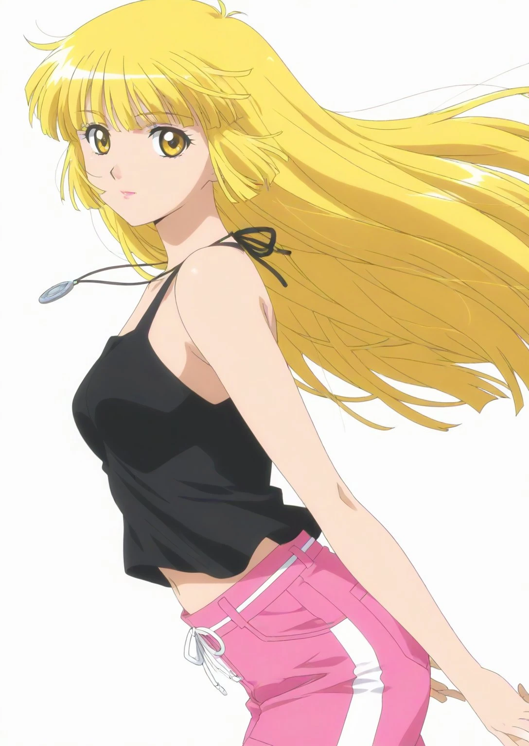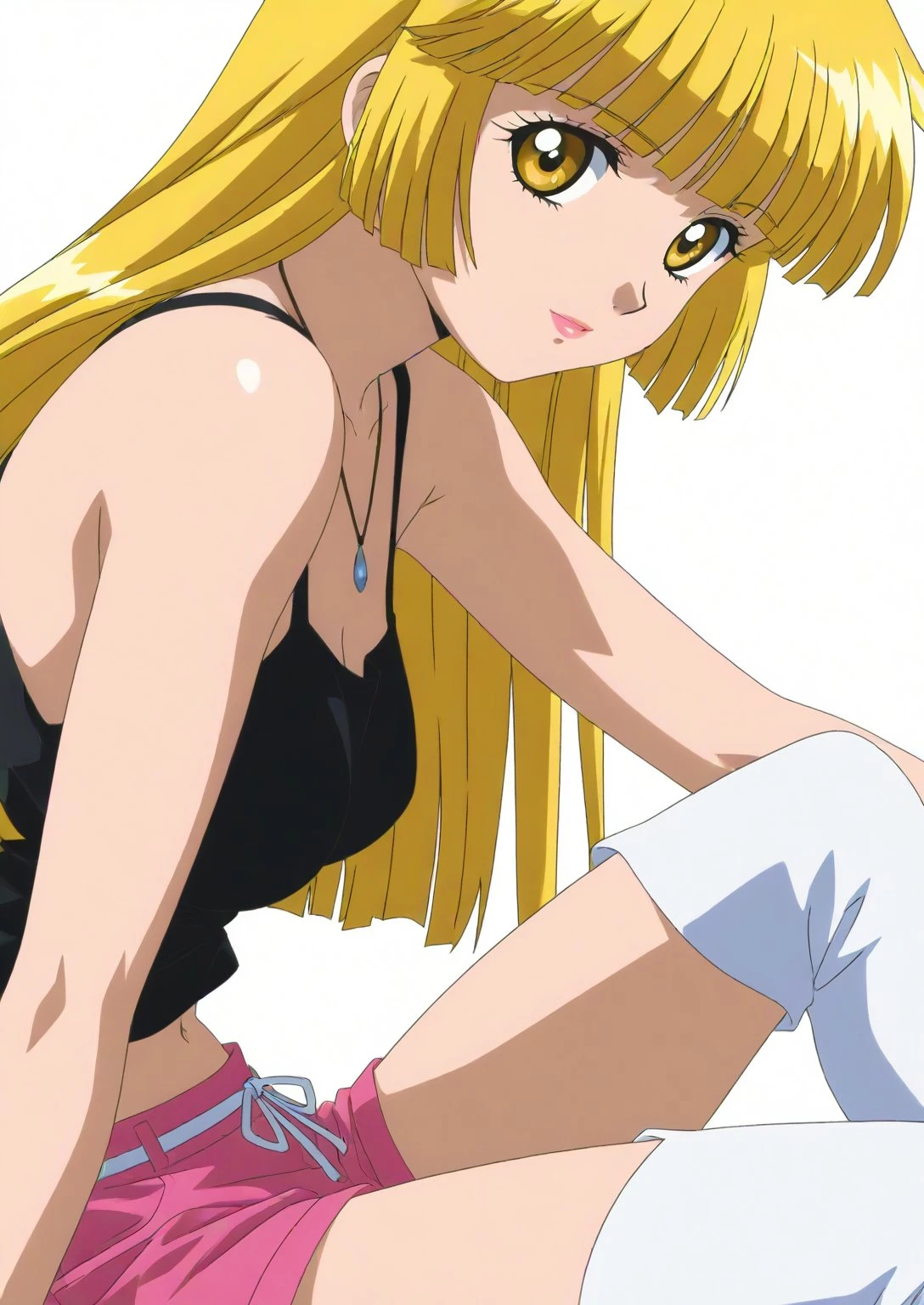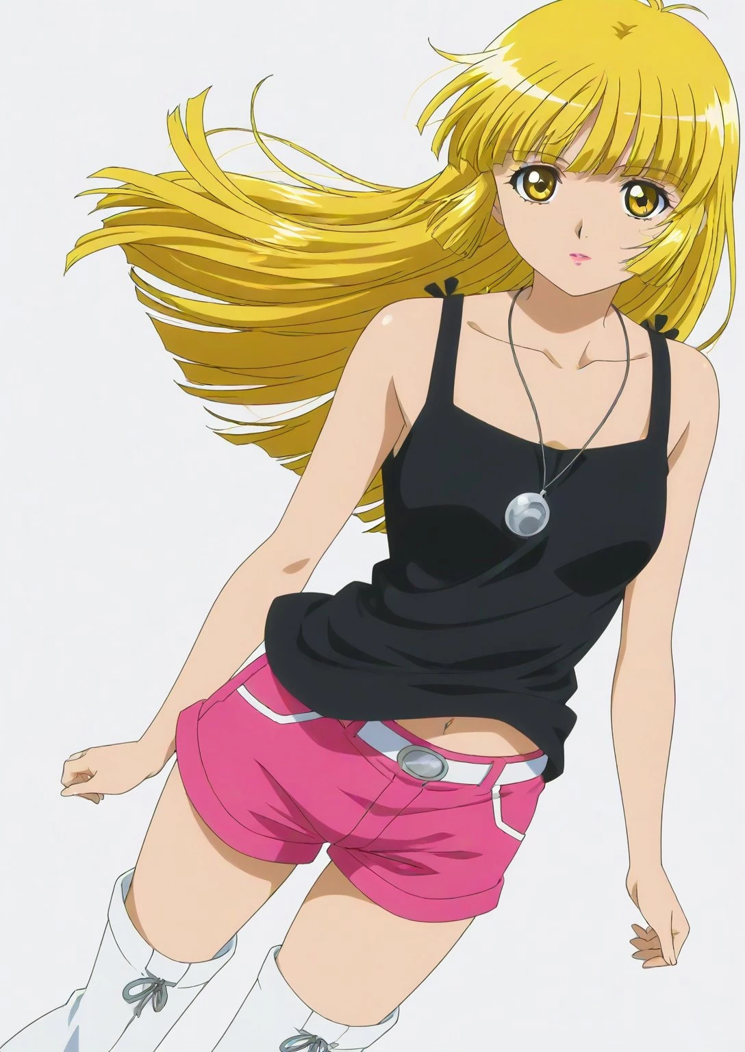 Outfit 2 (casual appearance): coorie casual, long hair, yellow eyes, makeup, hime cut, blunt ends, lipstick, bare shoulders, sleeveless, necklace, bare arms, black dress, navel, pink short pants, white thigh boots