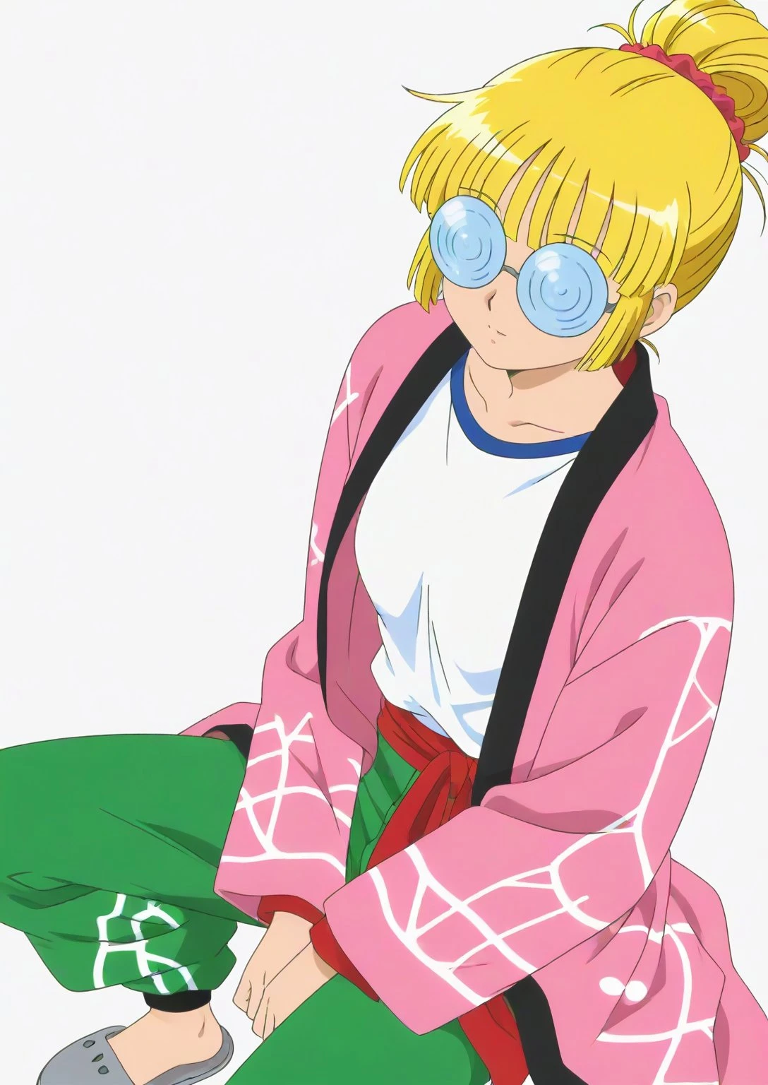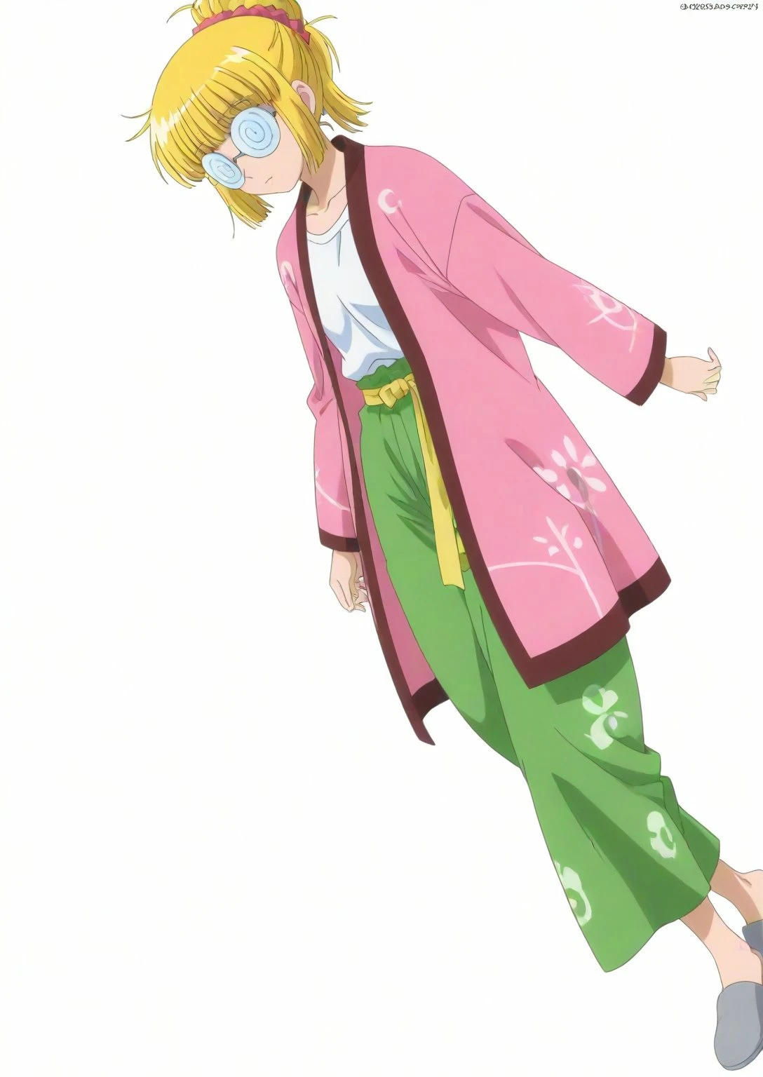 Outfit 1 (working appearance): glasses, no eyes, hair bun, single hair bun, round eyewear, coke-bottle glasses, coorie operator, japanese clothes, pink haori, long sleeves, white shirt, scrunchie, hair ornament, green pants, grey slippers
