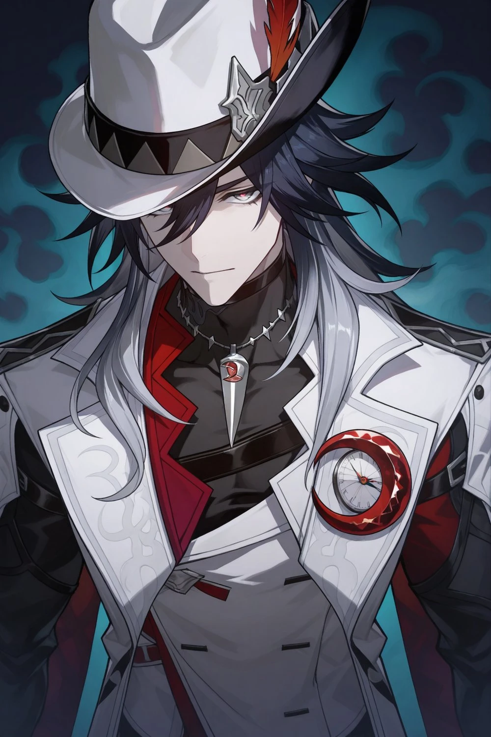 Ashveil, black hair, grey hair, long hair, hair between eyes, multicolored hair, grey eyes, hat, hat feather,