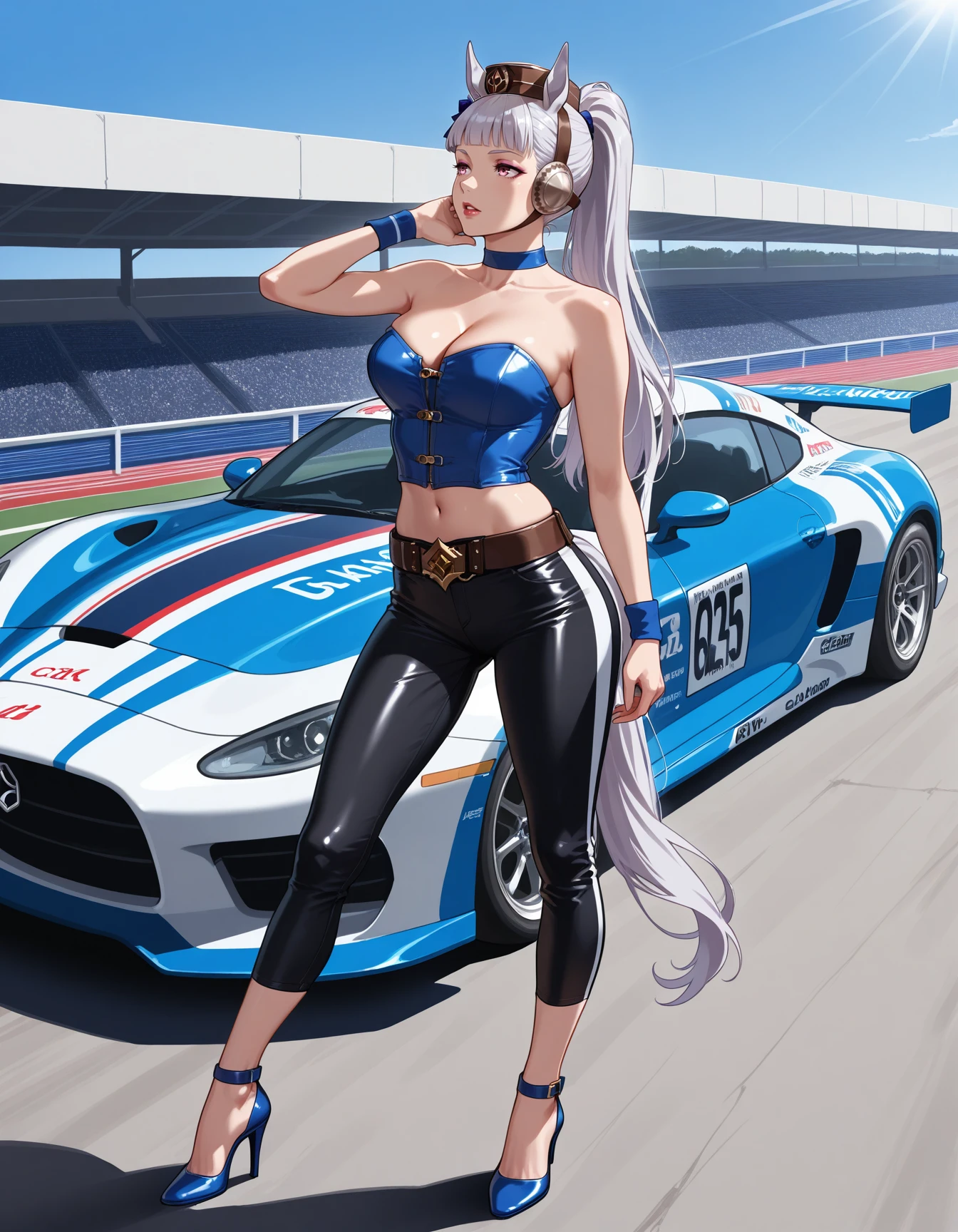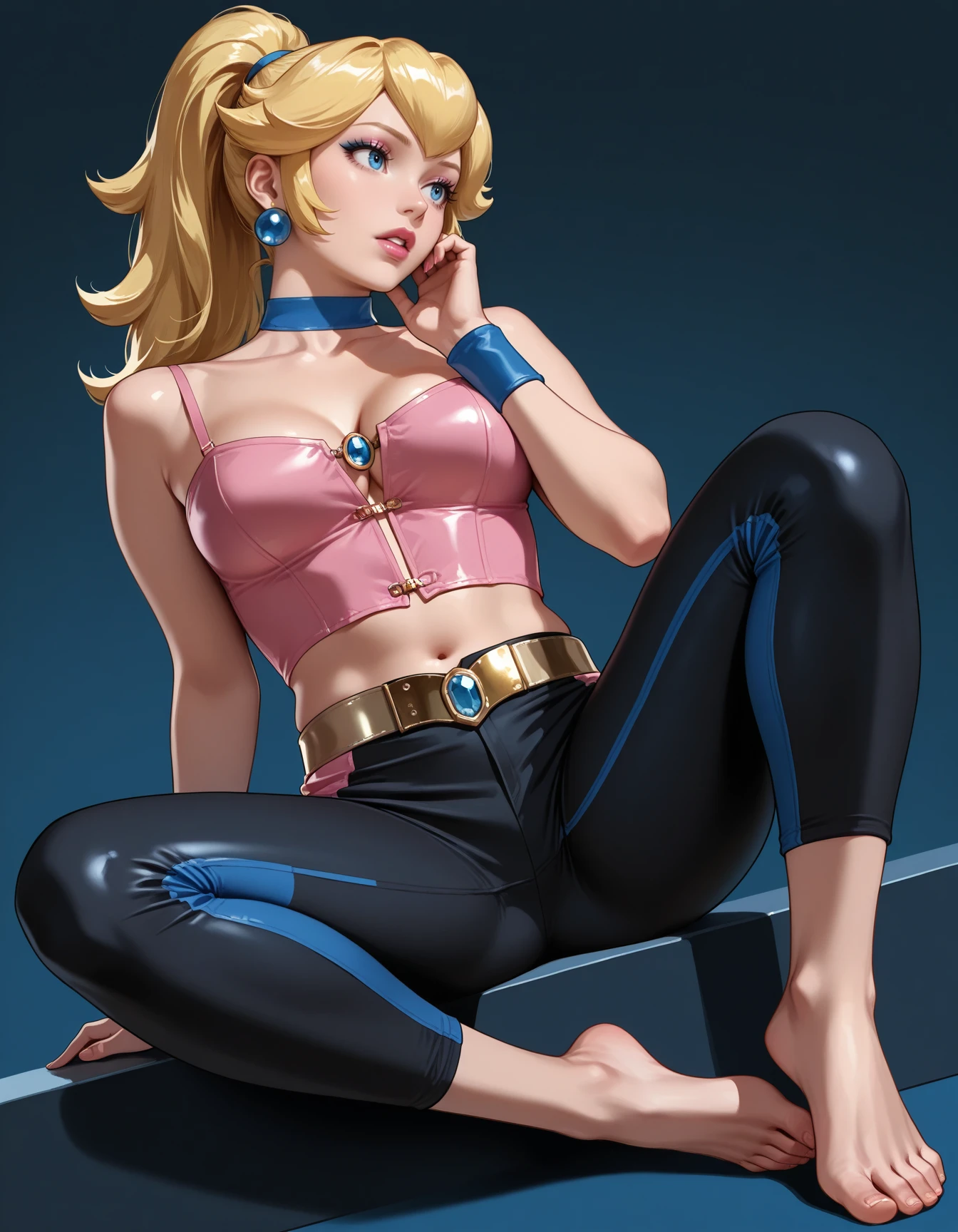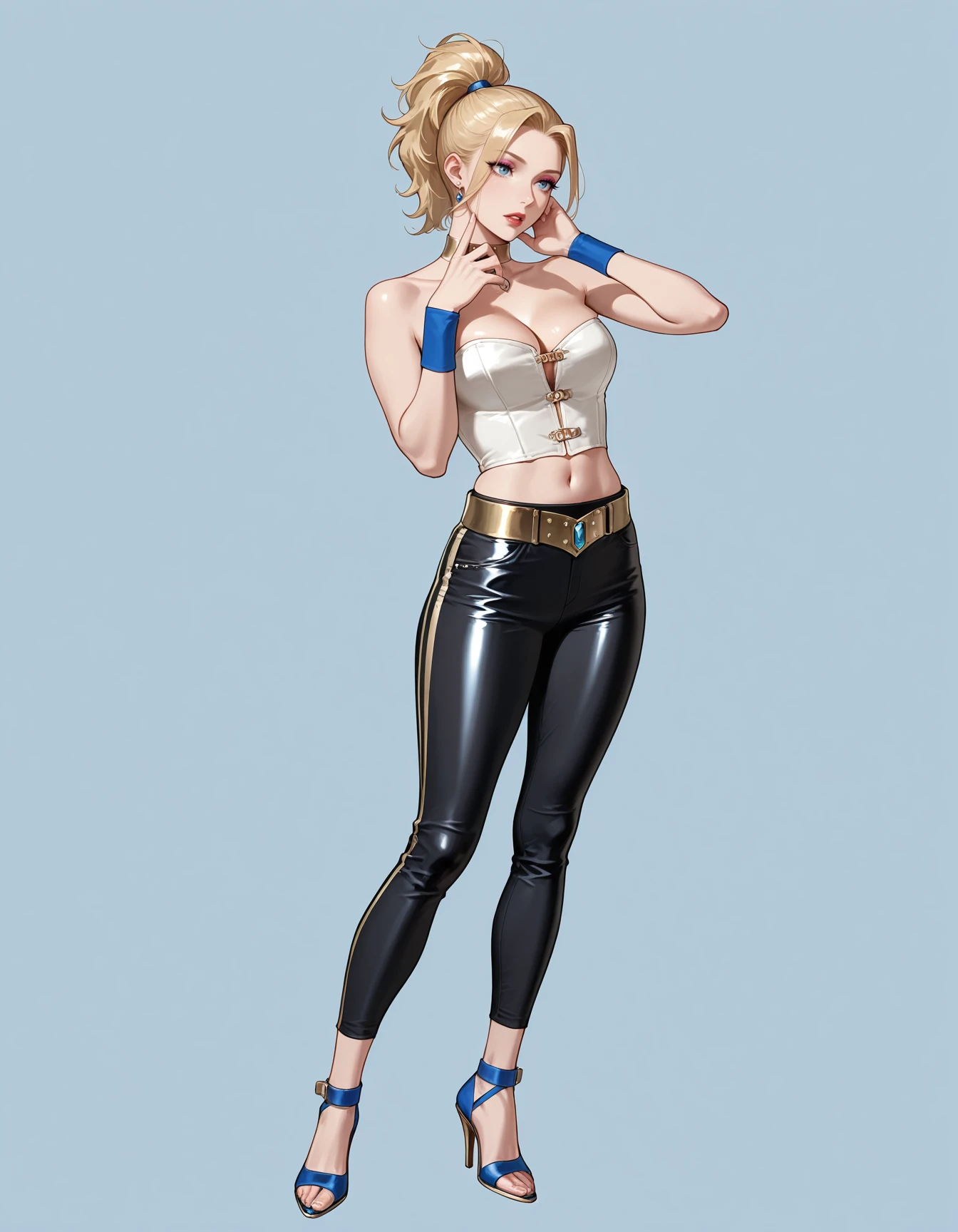 blue bustier, leather bustier, choker, wristbands, gold belt, gem, racestripe pants, capri pants, strappy heels, strapless, clasps, studs, midriff