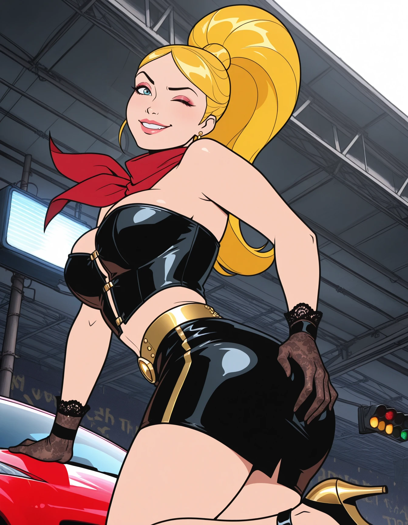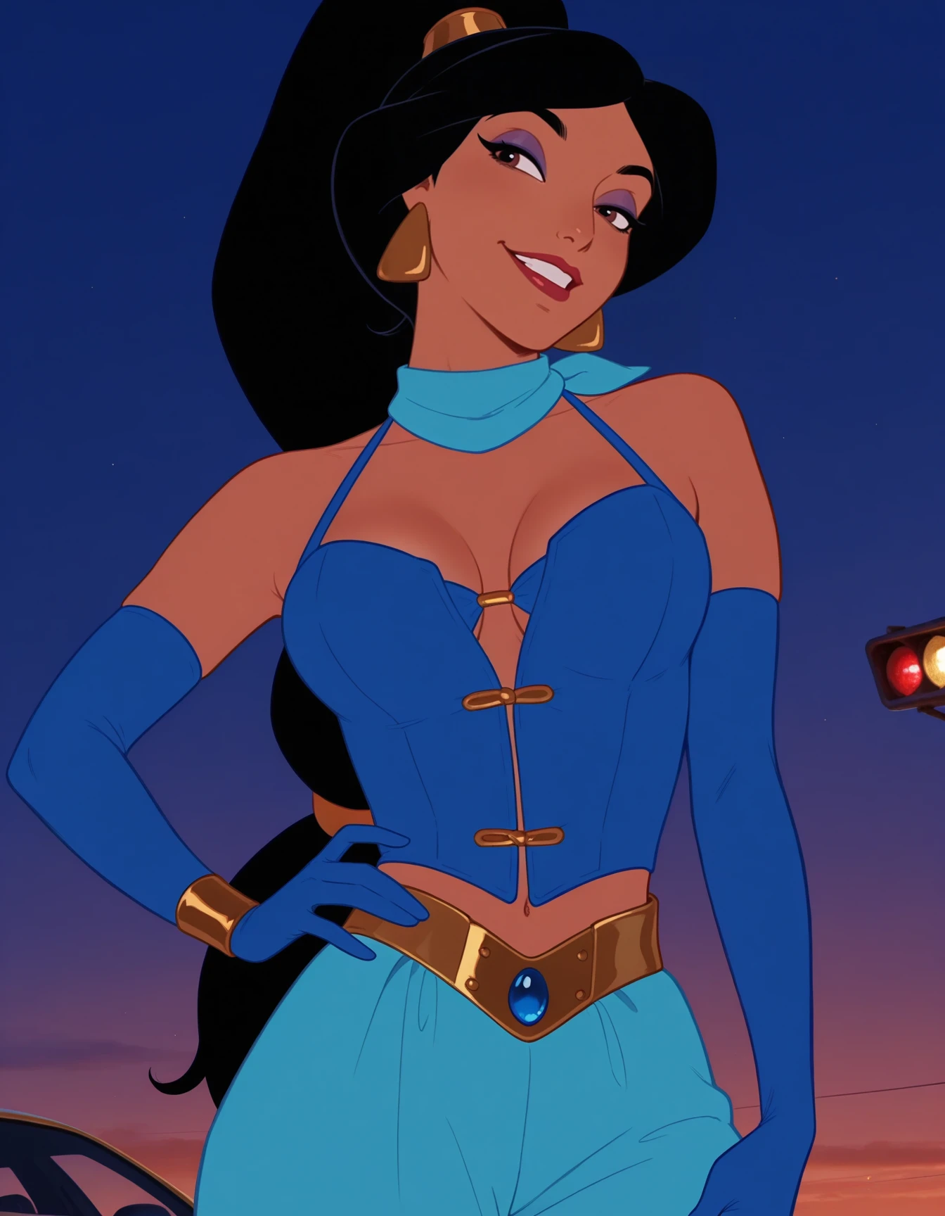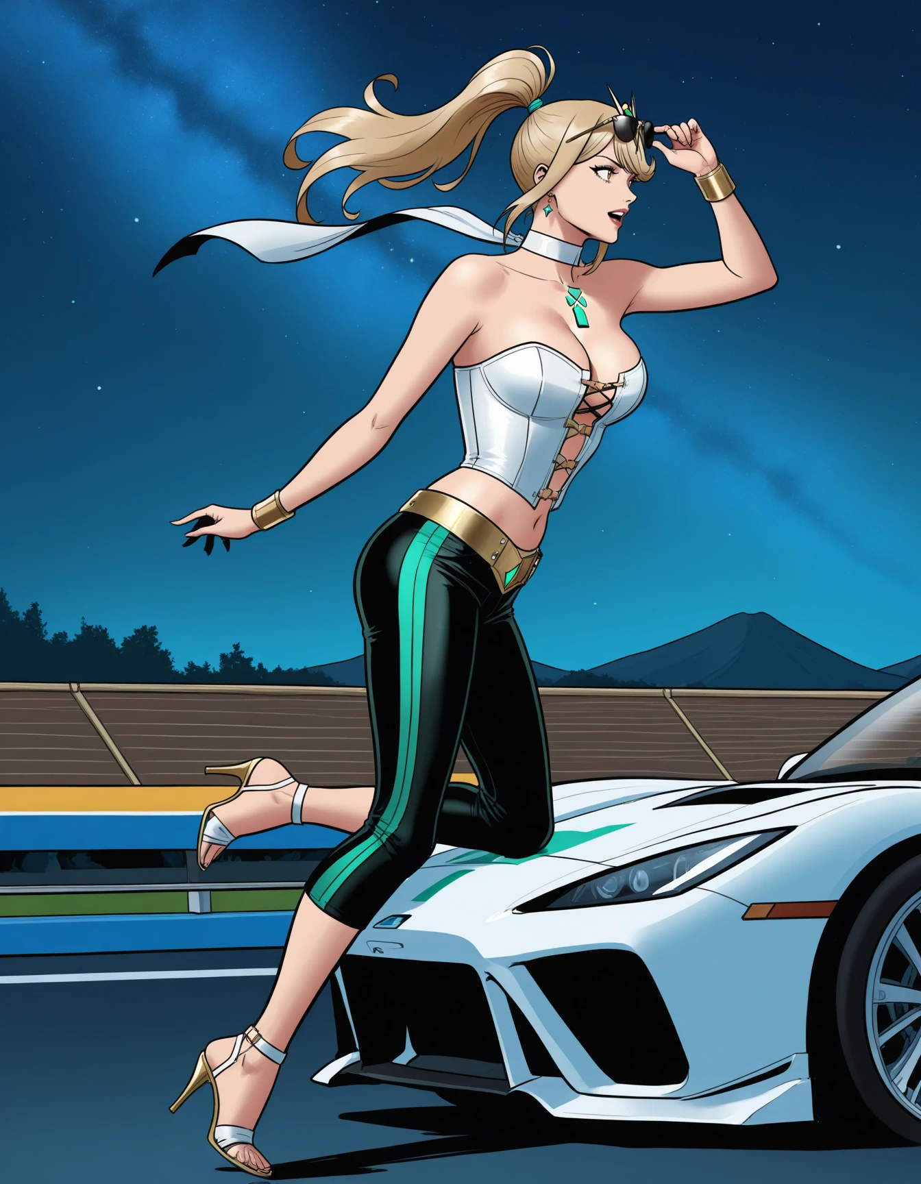 blue bustier, leather bustier, choker, wristbands, gold belt, gem, racestripe pants, capri pants, strappy heels, strapless, clasps, studs, midriff