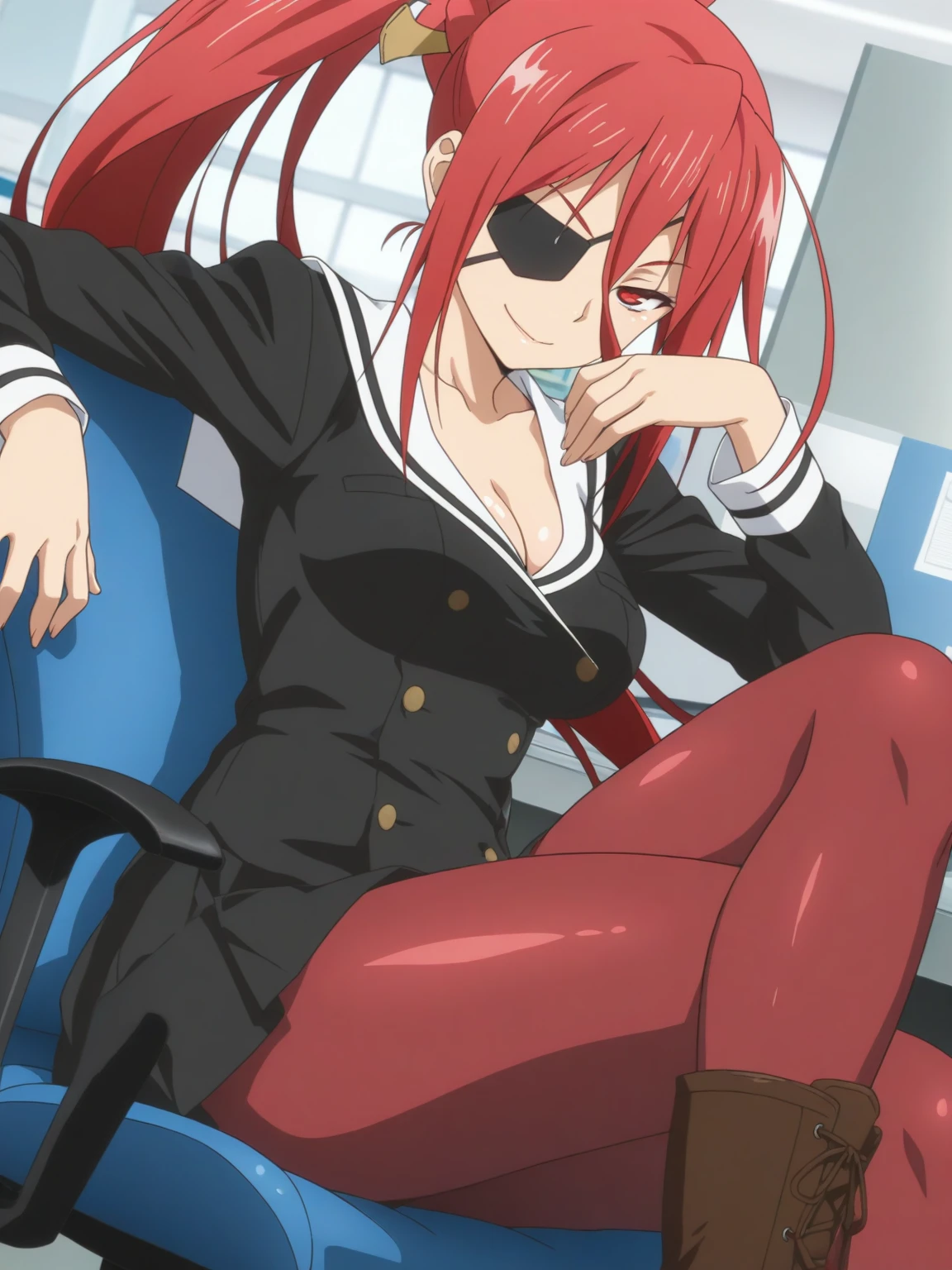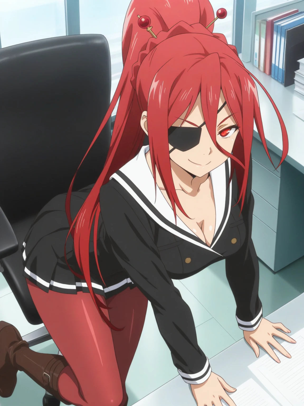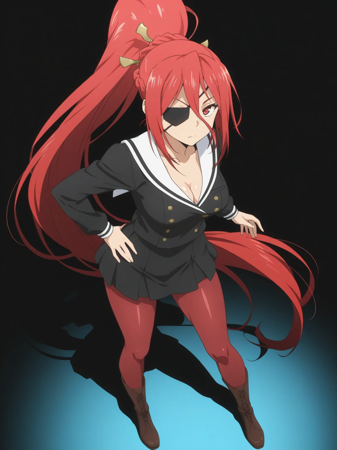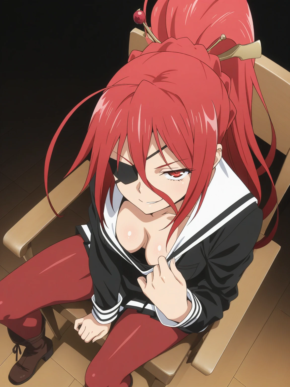 Character: (ArashiNikaido, red eyes, red hair, long hair, high ponytail, eyepatch)