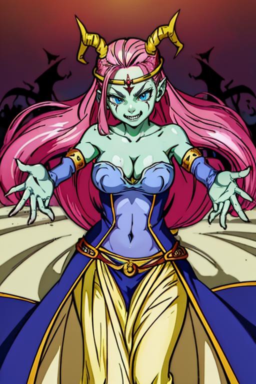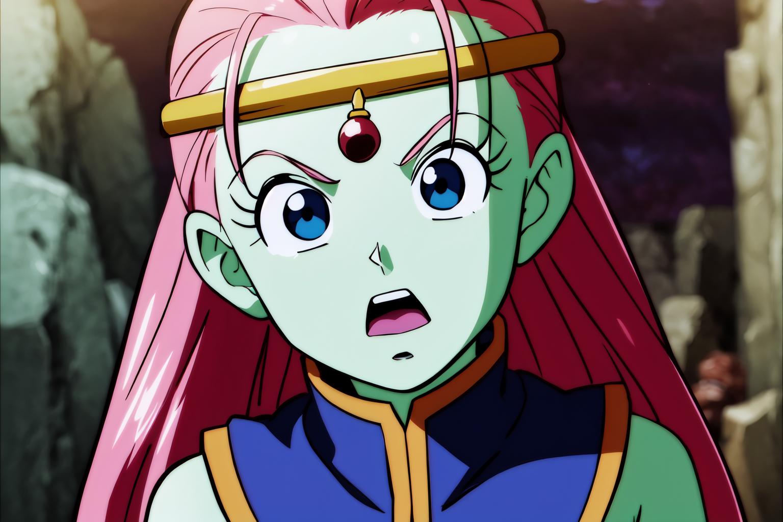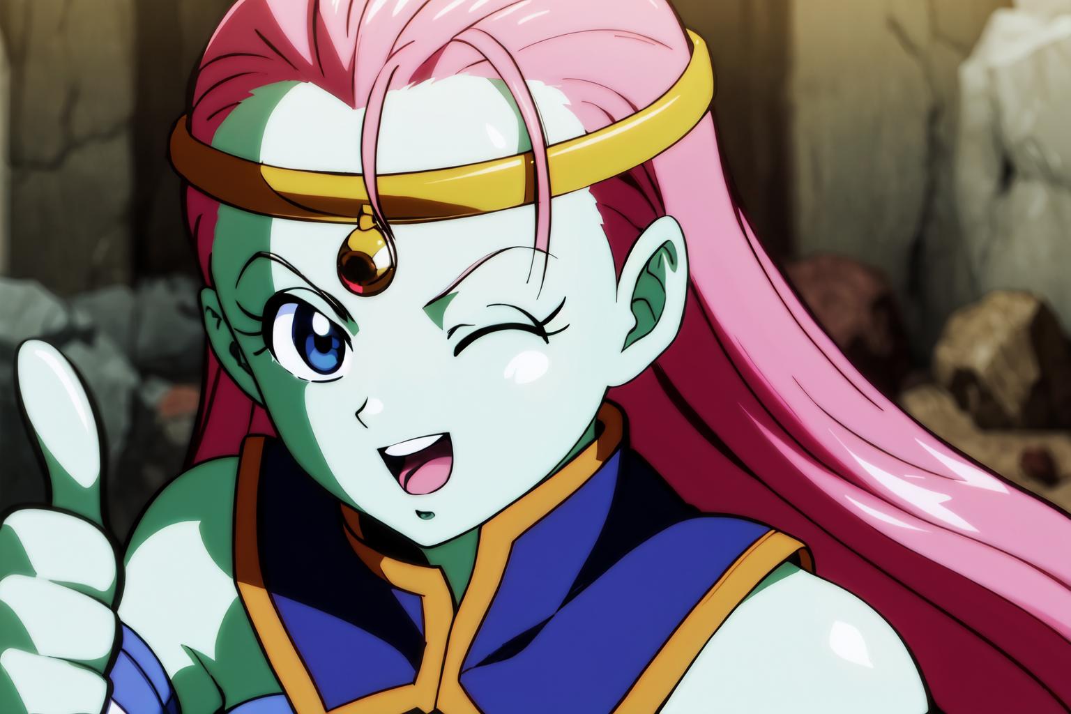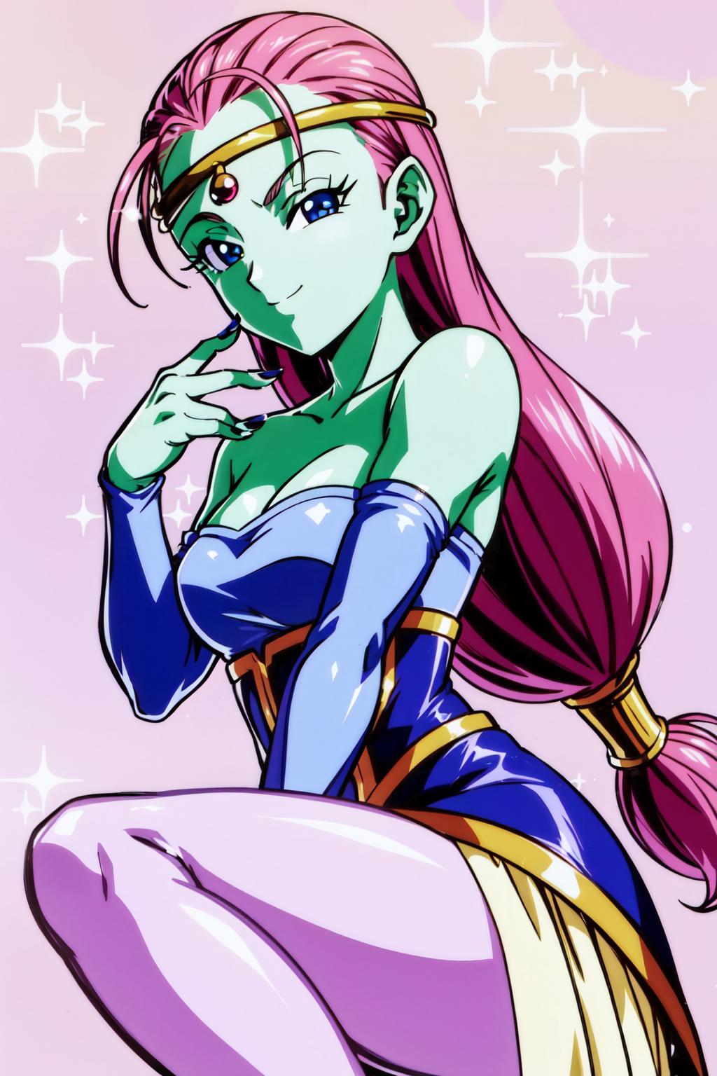 caway, low-tied long hair, pink hair, blue eyes, green skin,
