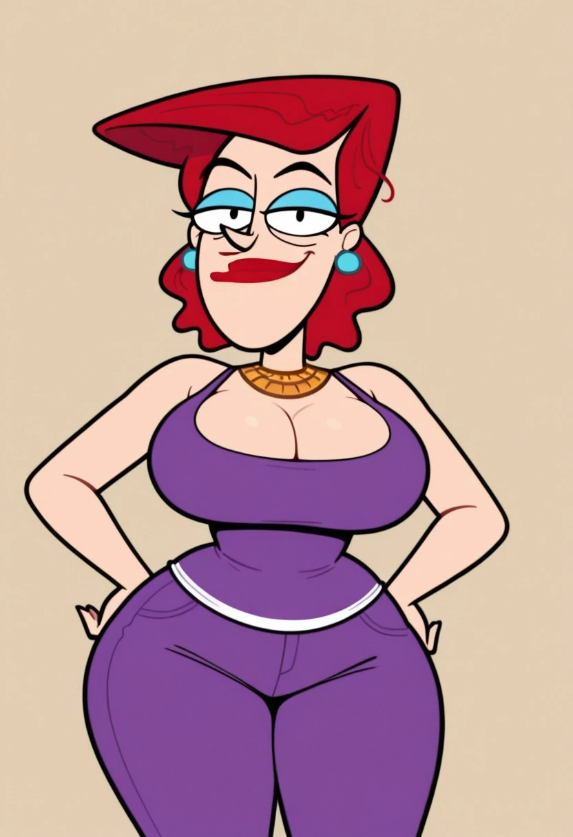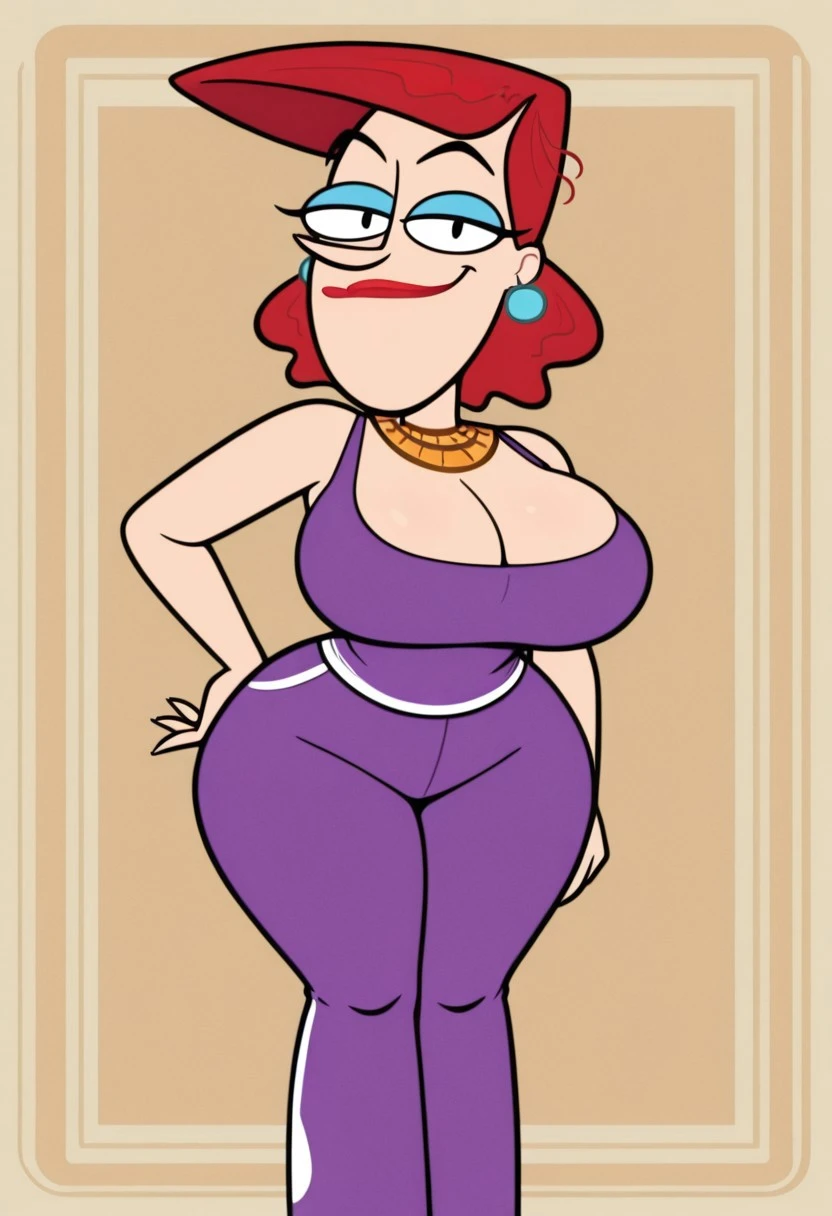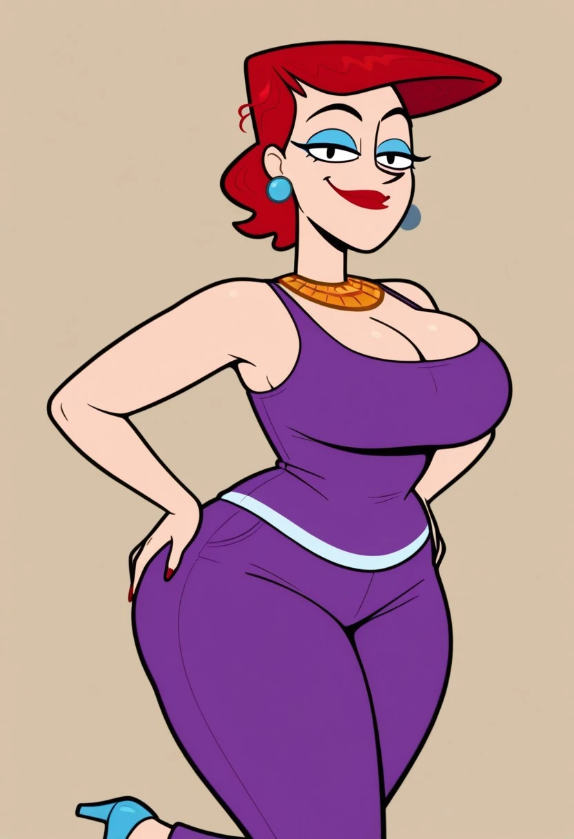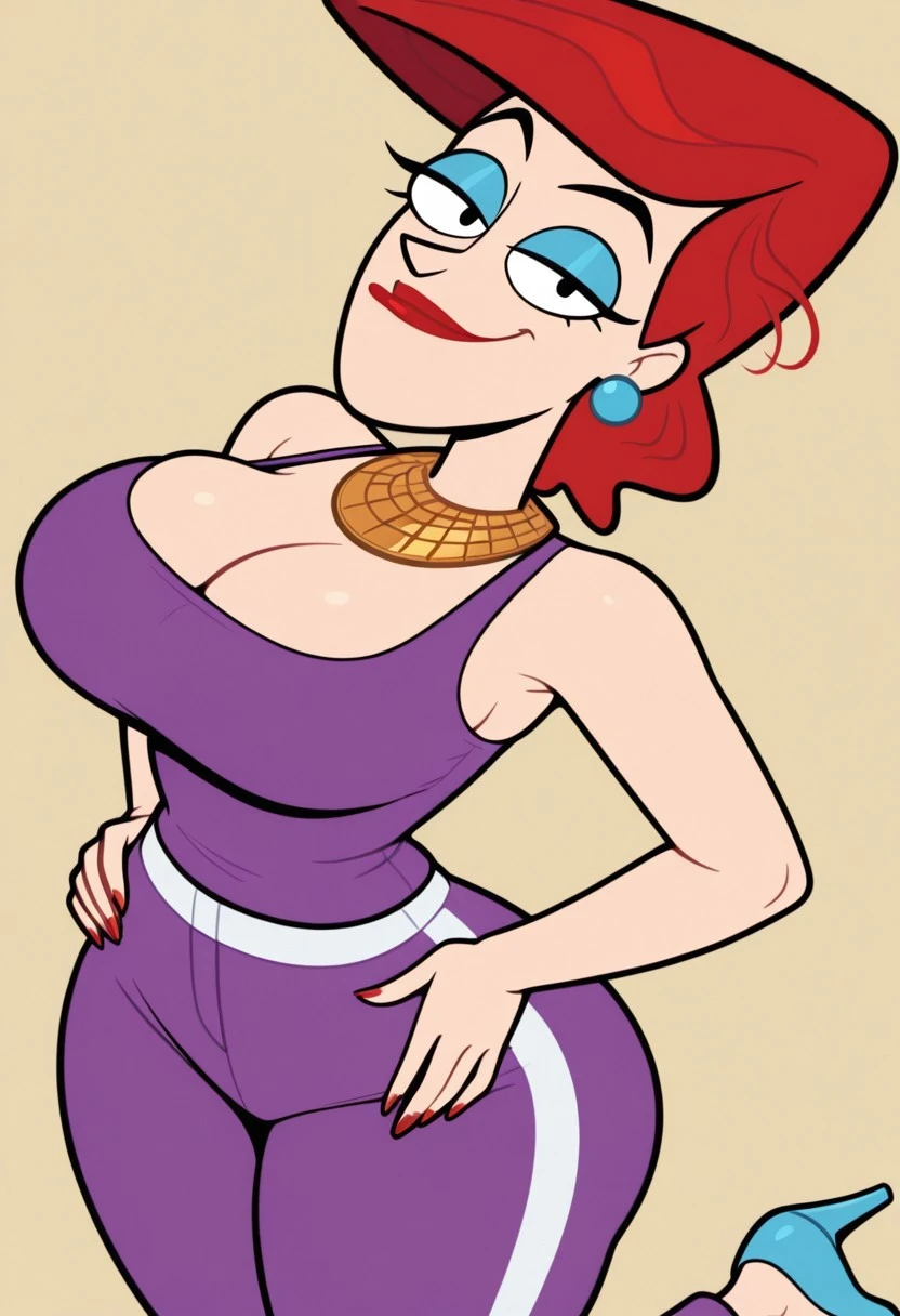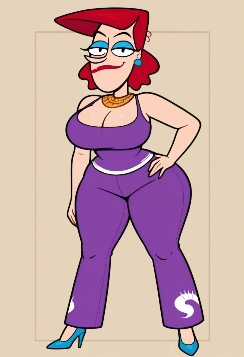 Cookie Falcone, 1girl, solo, red hair, earrings, red lipstick, blue eyelashes, gold collar, large breasts, huge ass, wide hips, thick thighs