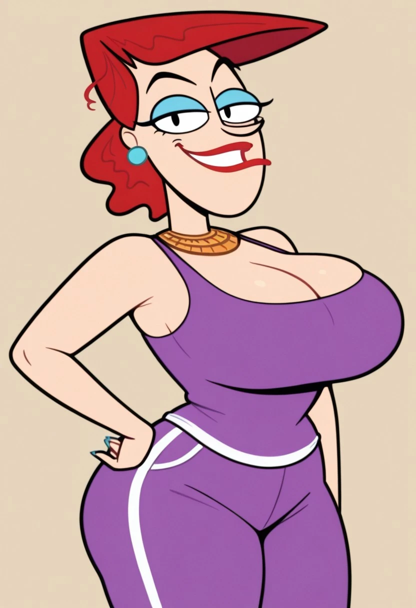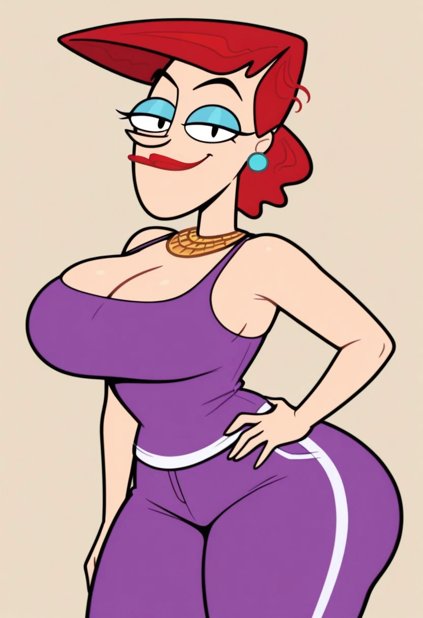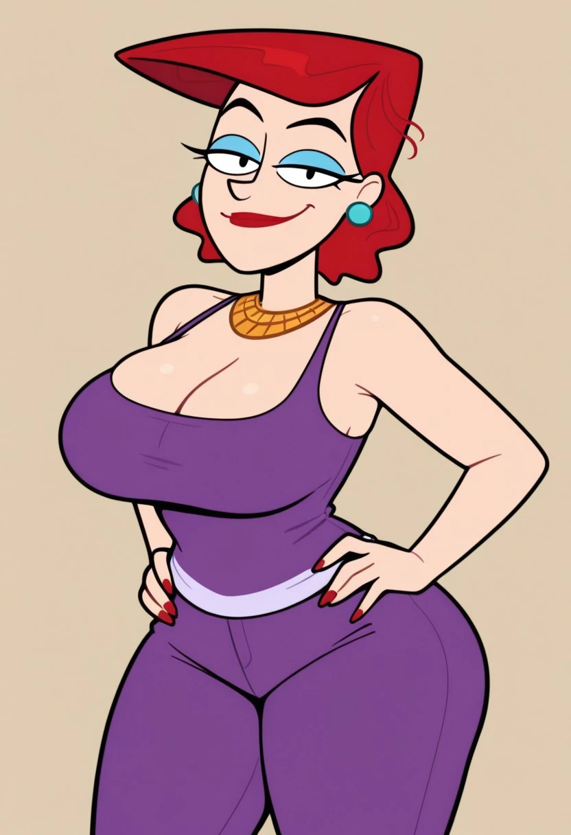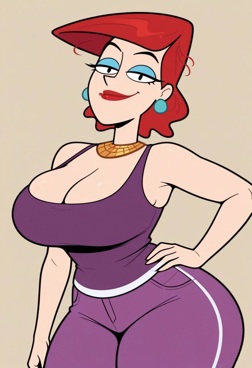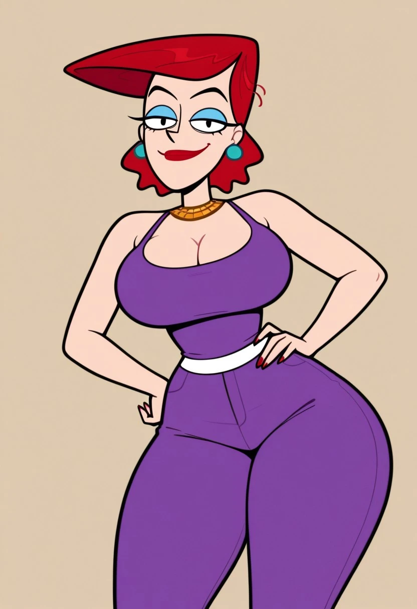 Cookie Falcone, 1girl, solo, red hair, earrings, red lipstick, blue eyelashes, gold collar, large breasts, huge ass, wide hips, thick thighs