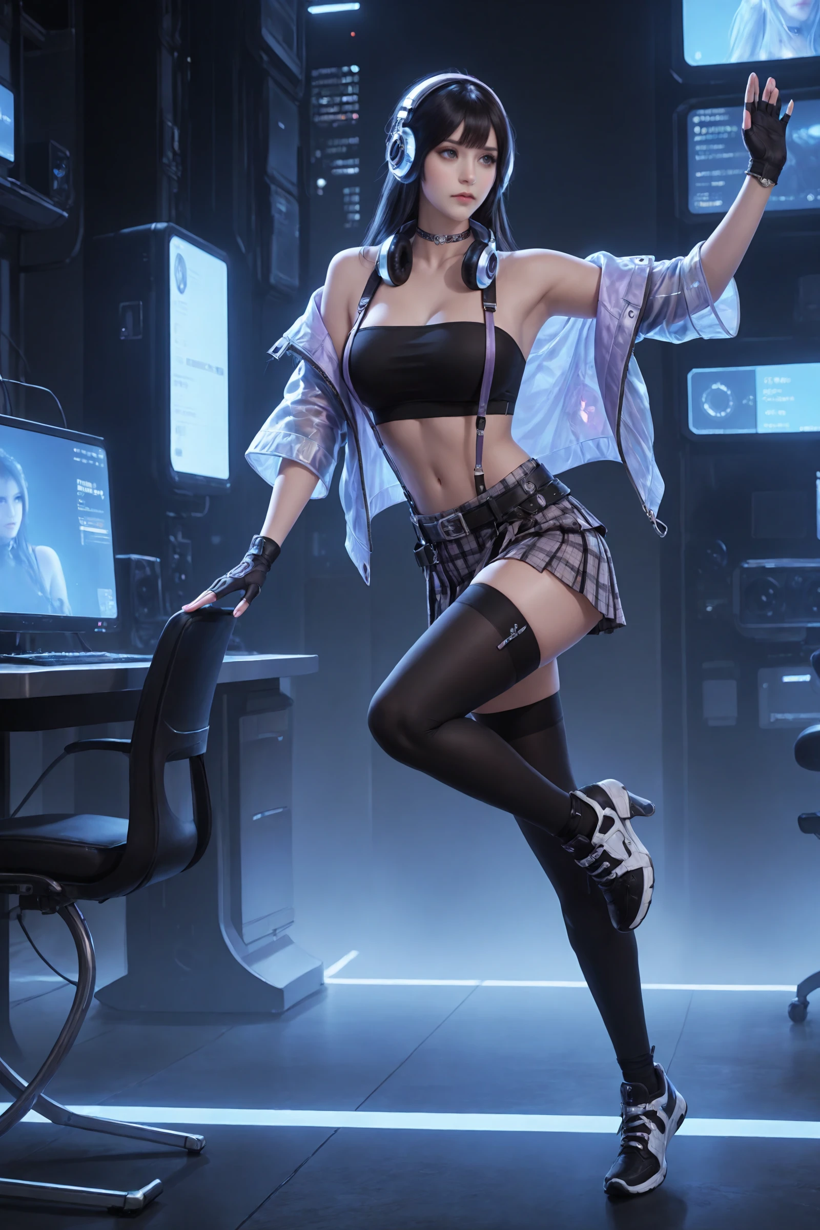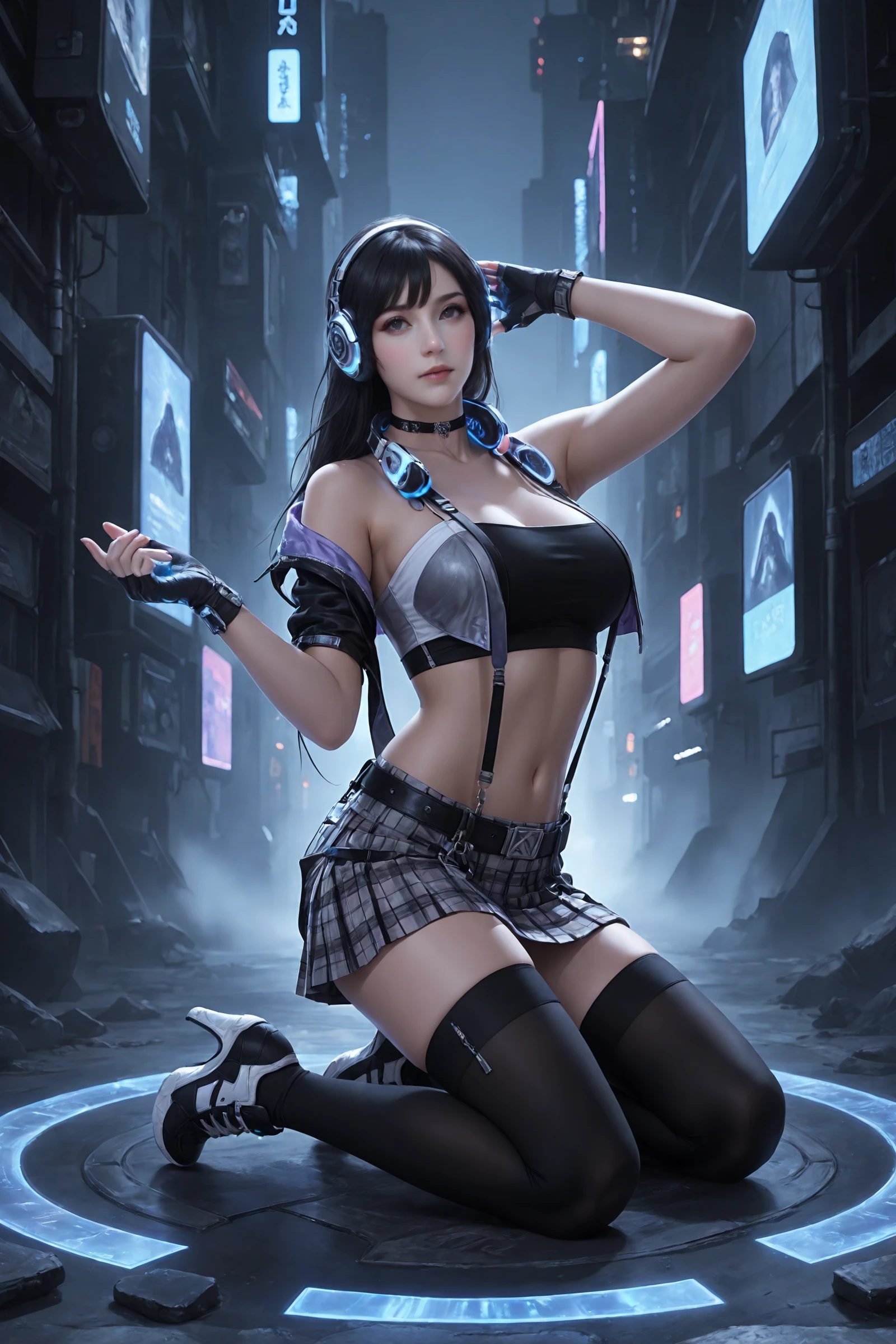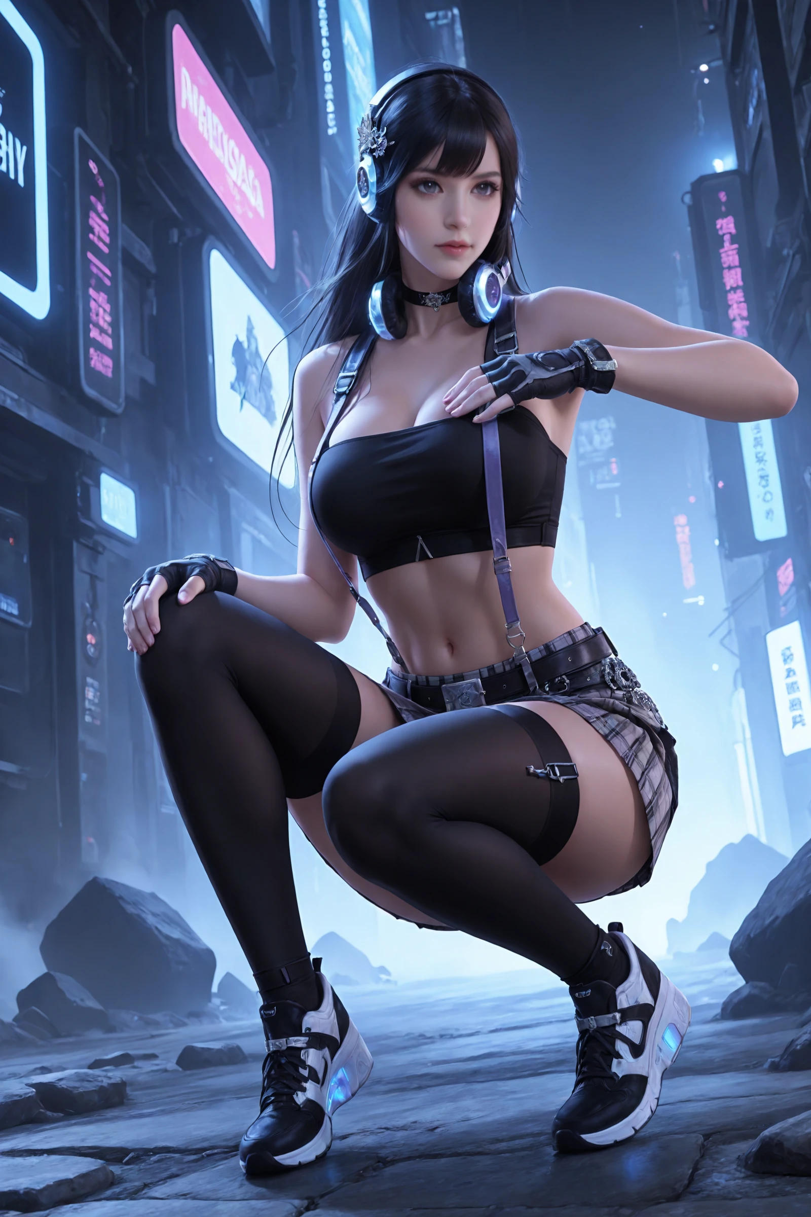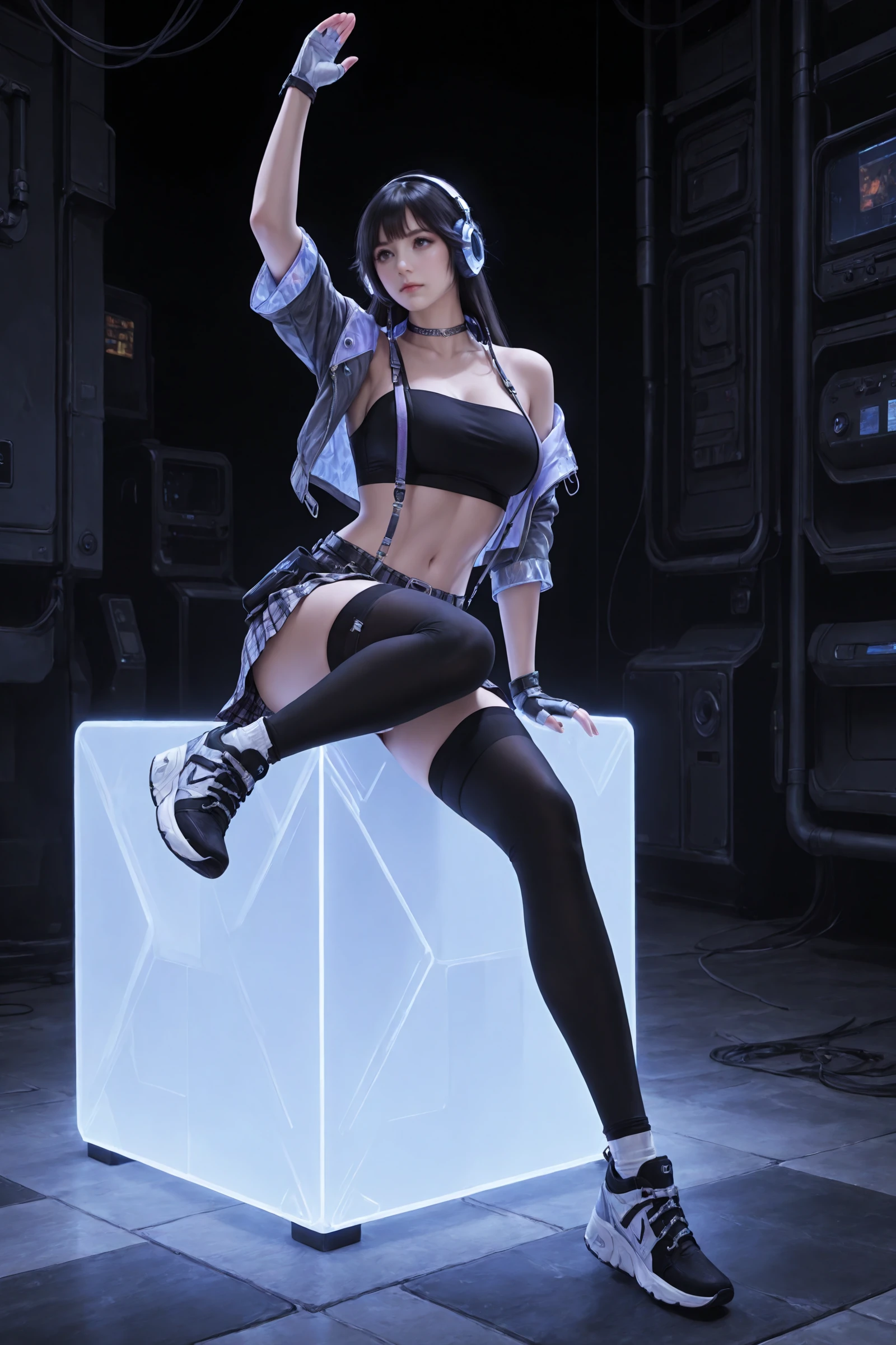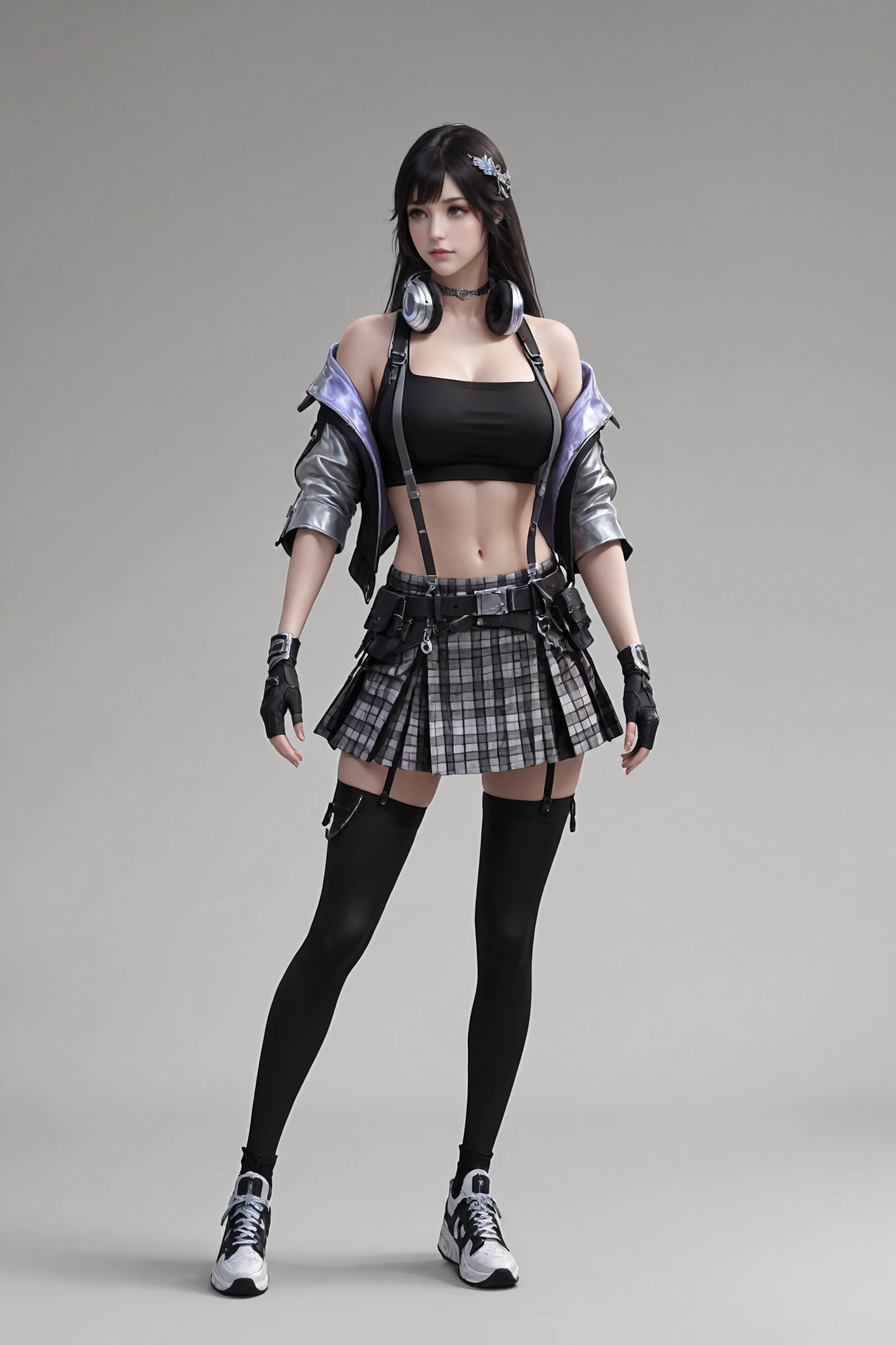 long_hair,black_hair,hair_ornament, large_breasts,midriff,navel,choker,bare_shoulders,open_jacket,headphones_around_neck, jacket,crop_top,suspenders,gloves,plaid_skirt,belt,black_thighhighs,zettai_ryouiki, sneakers,high_heels,