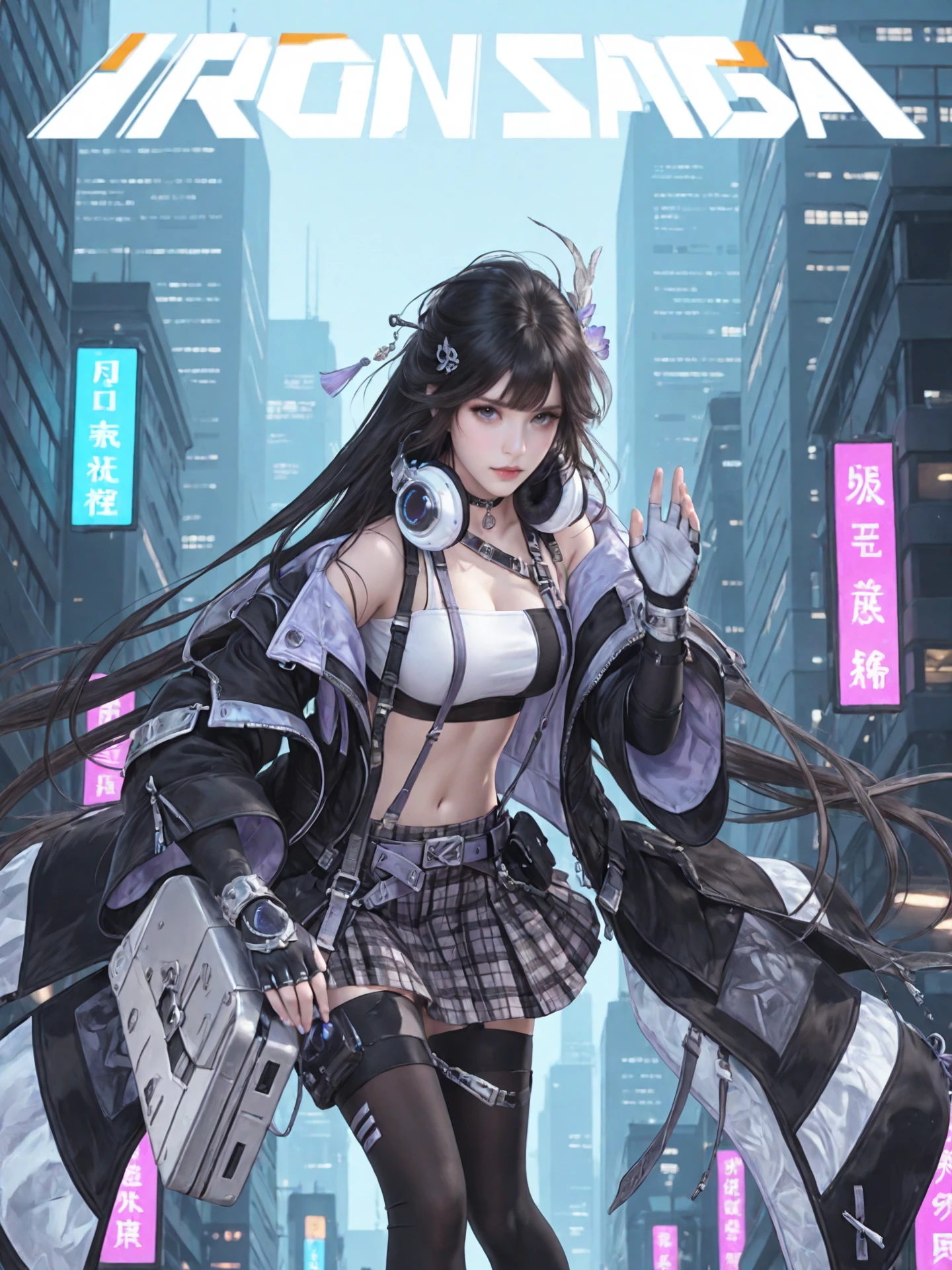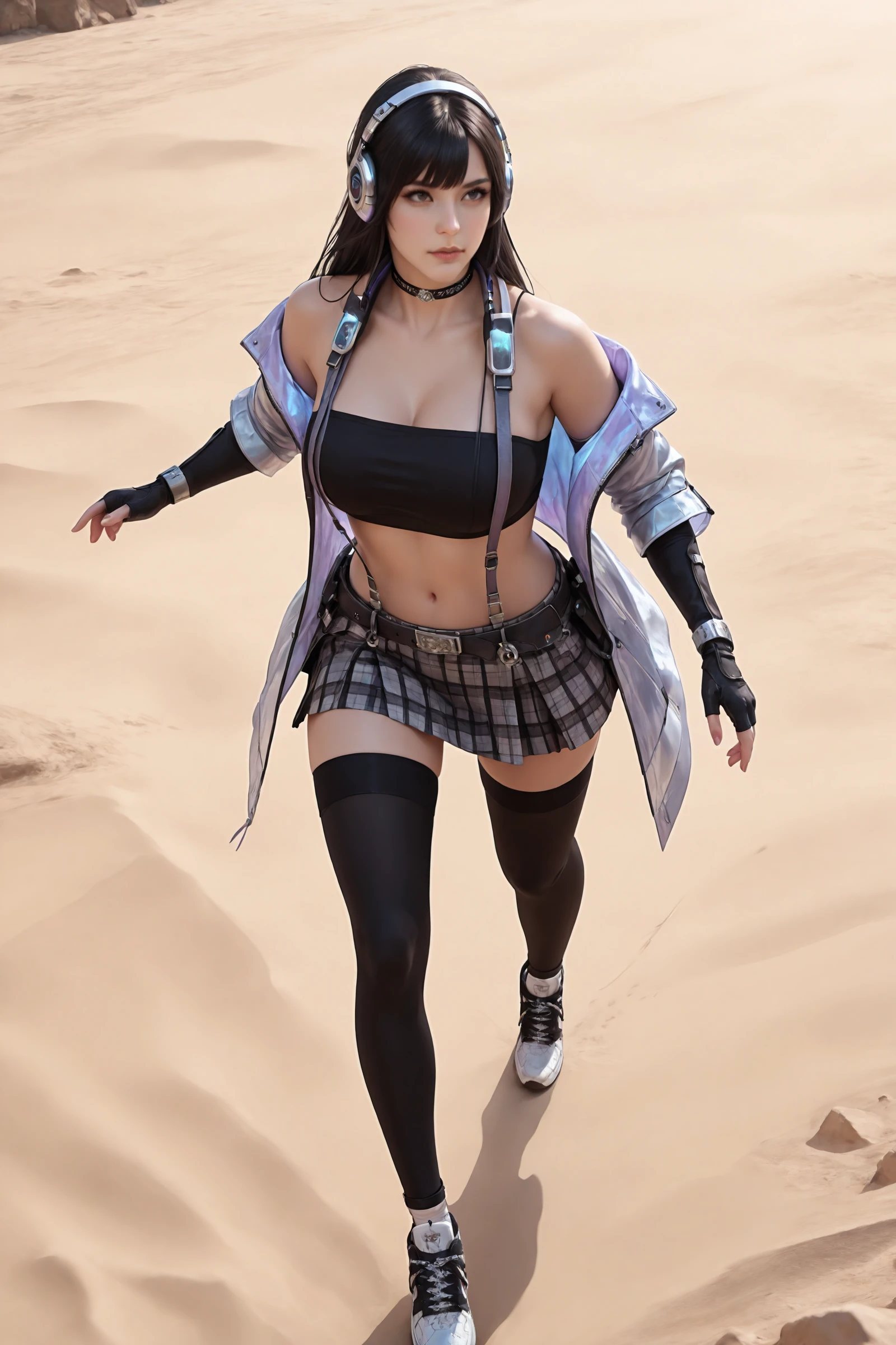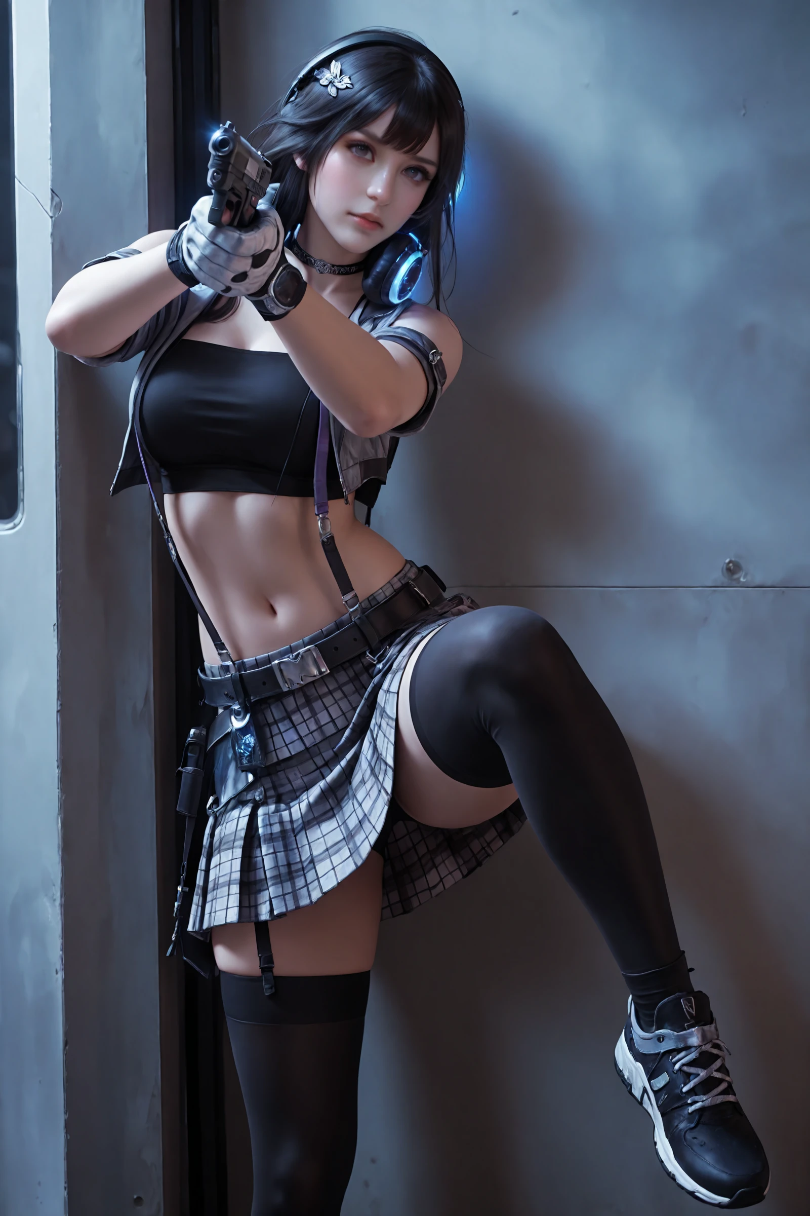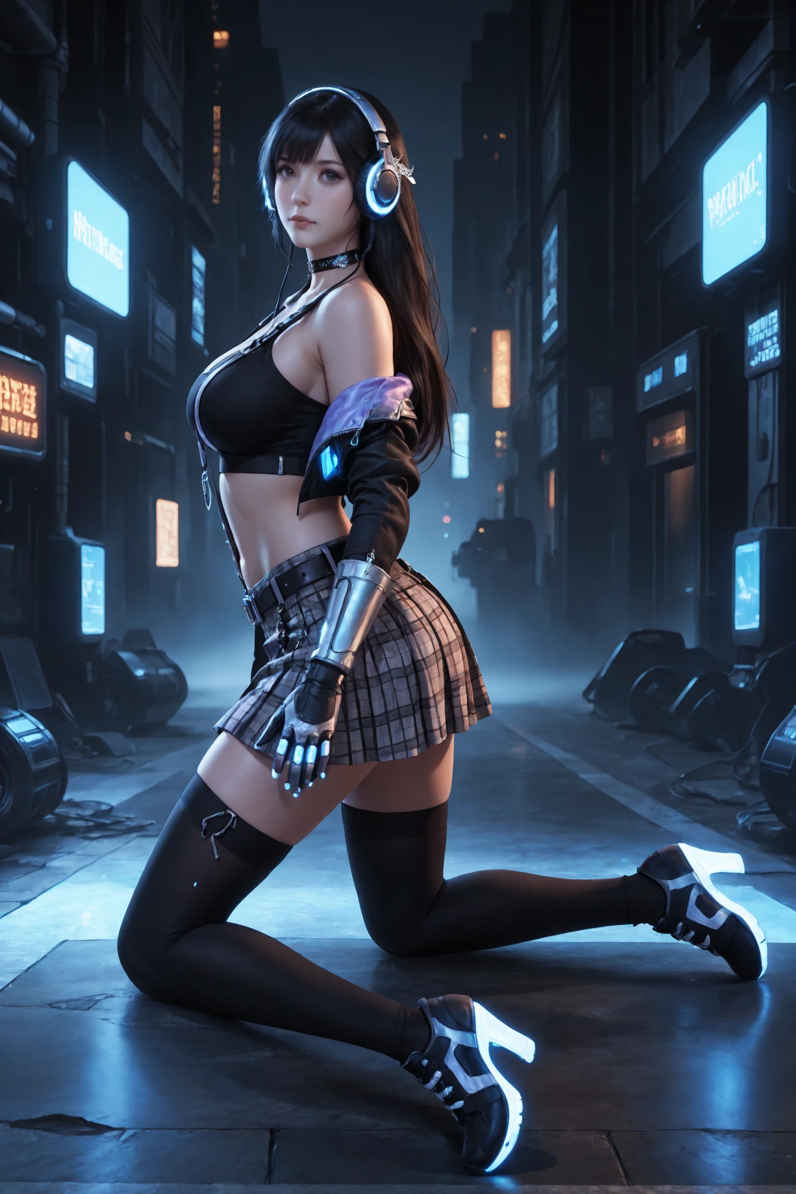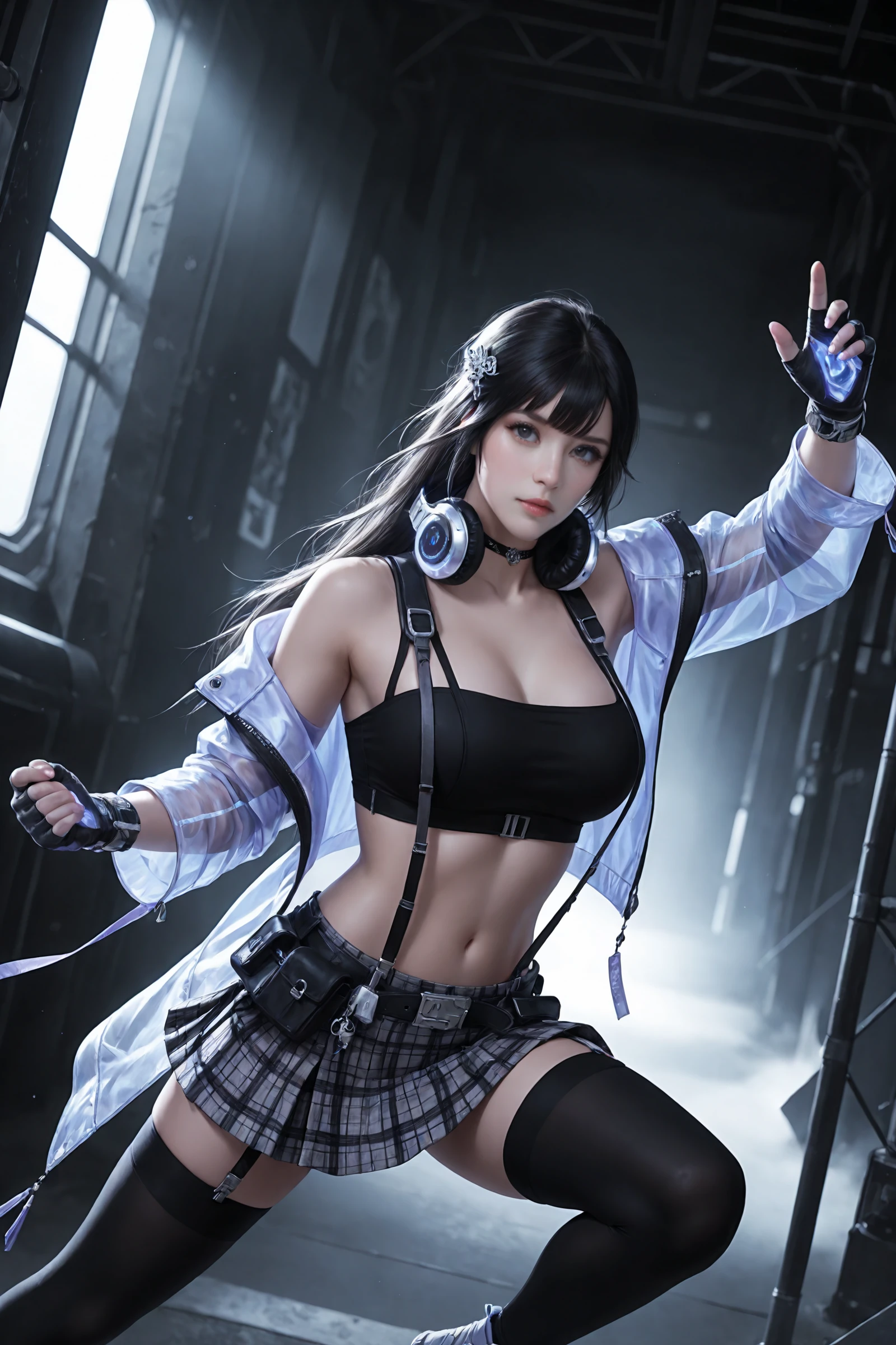 long_hair,black_hair,hair_ornament, large_breasts,midriff,navel,choker,bare_shoulders,open_jacket,headphones_around_neck, jacket,crop_top,suspenders,gloves,plaid_skirt,belt,black_thighhighs,zettai_ryouiki, sneakers,high_heels,