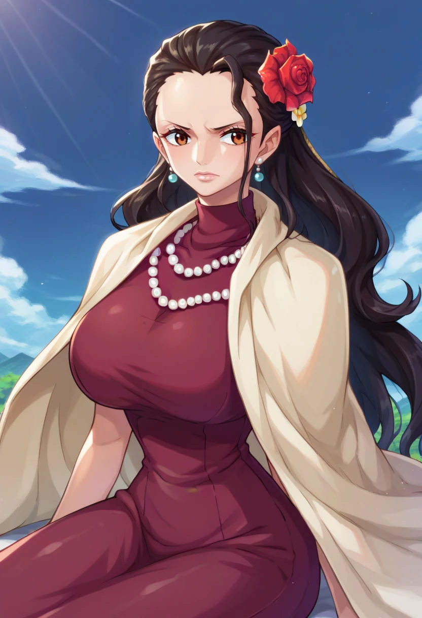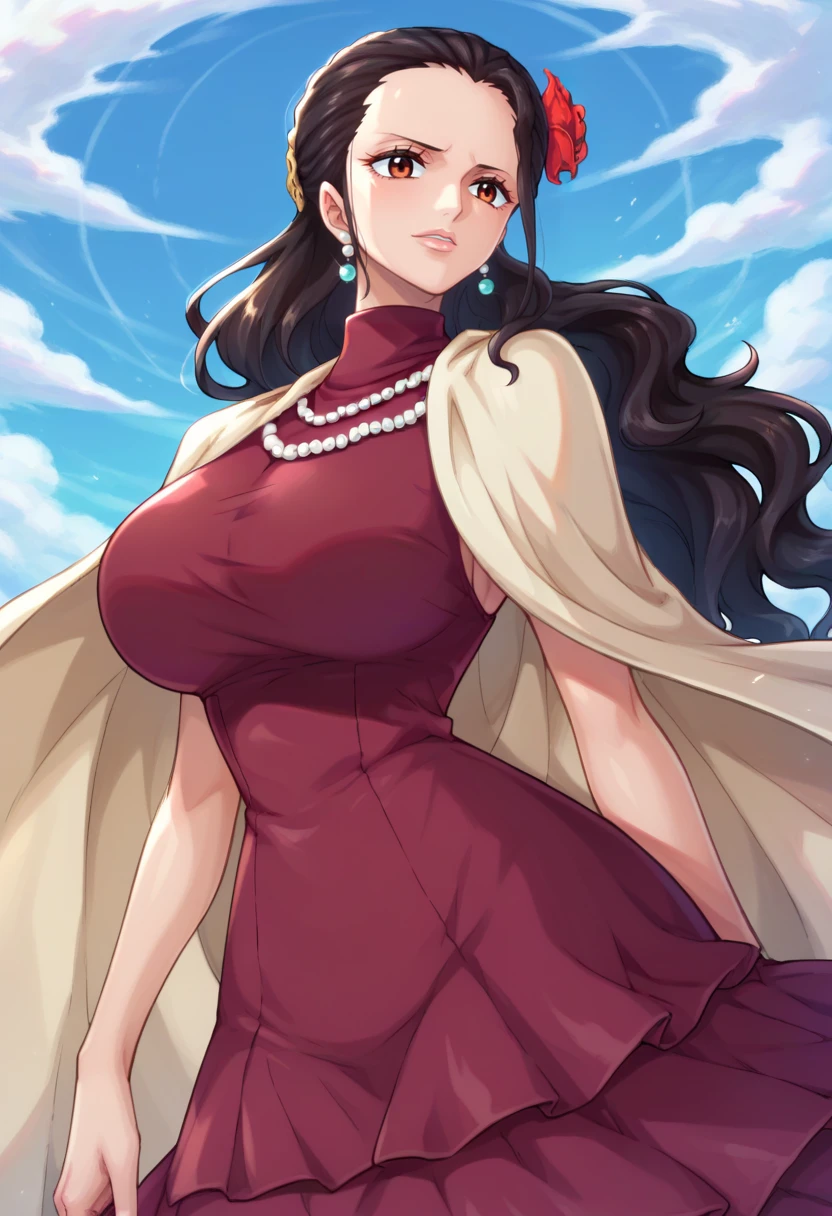 ViolaOP,1girl,solo,long hair,large breasts,brown eyes,black hair,red dress,jacket,necklace,hair flower,pearl necklace,necklace,hair slicked back,earrings,cape on shoulders,