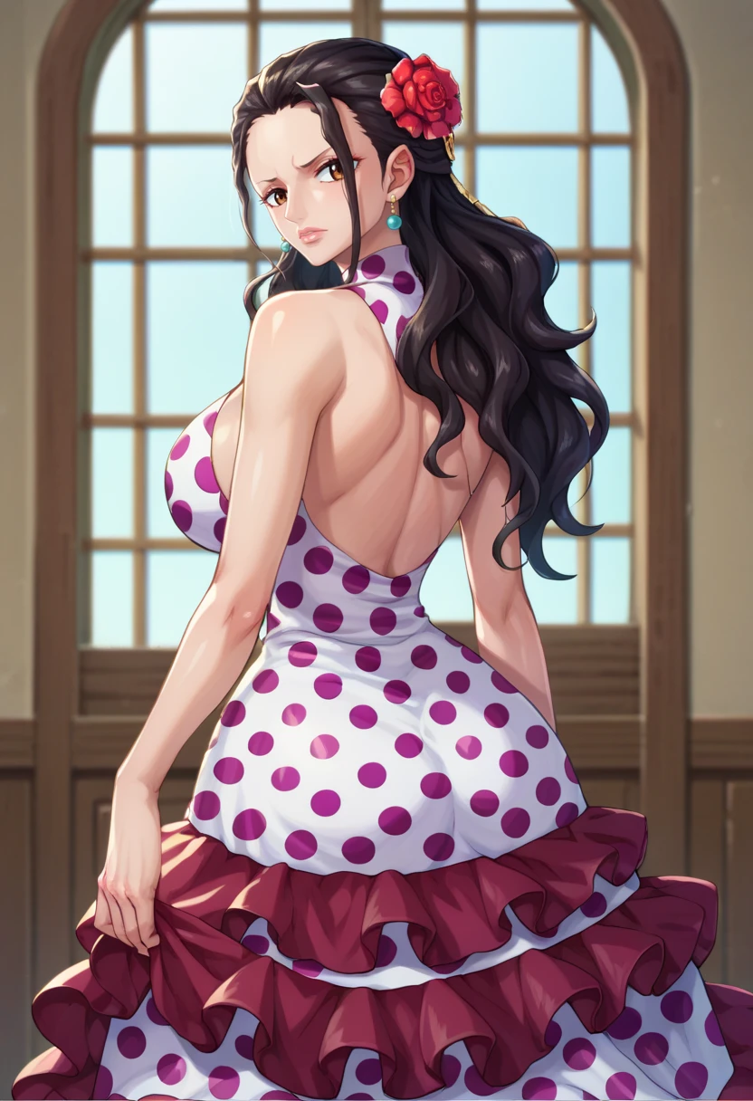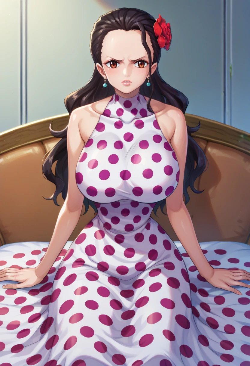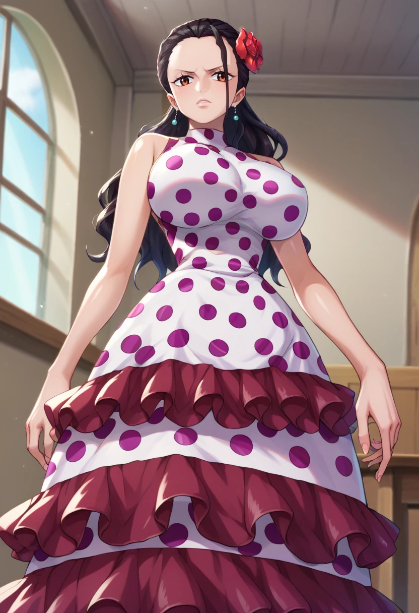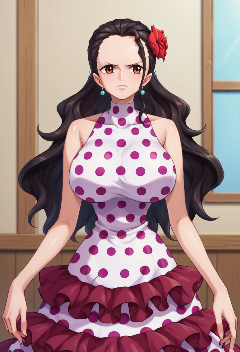 ViolaOP,1girl,solo,long hair,brown eyes,large breasts,black hair,dress,bare shoulders,hair flower,sideboob,frills,earrings,hair slicked back,polka dot,lips,polka dot dress,