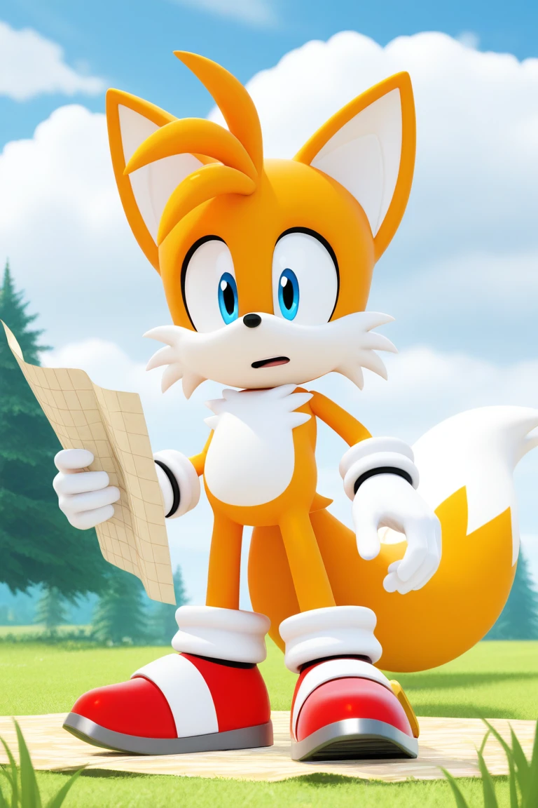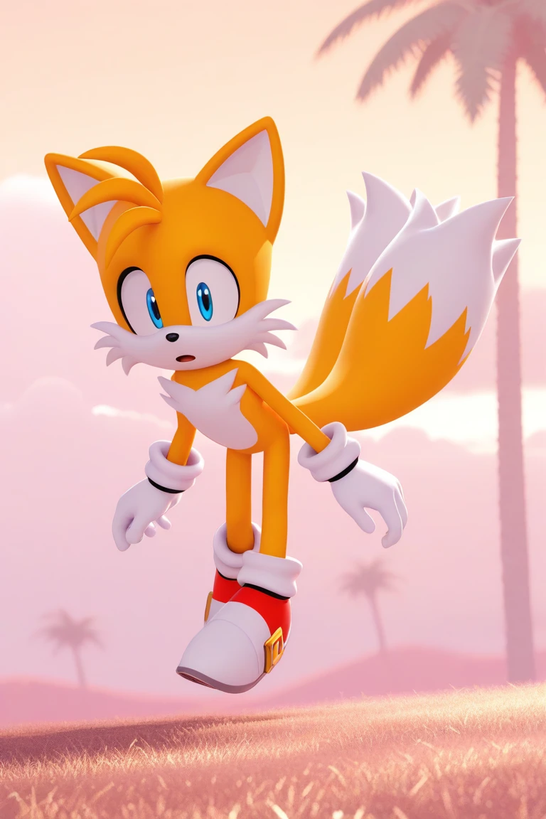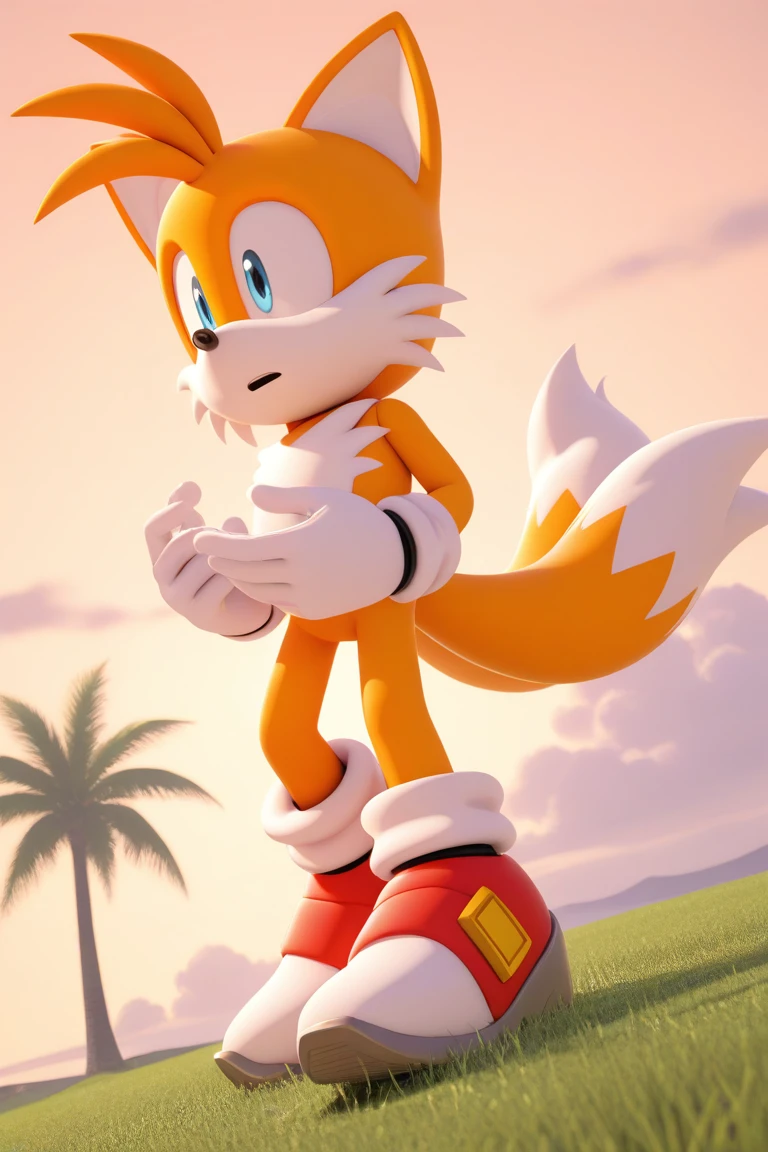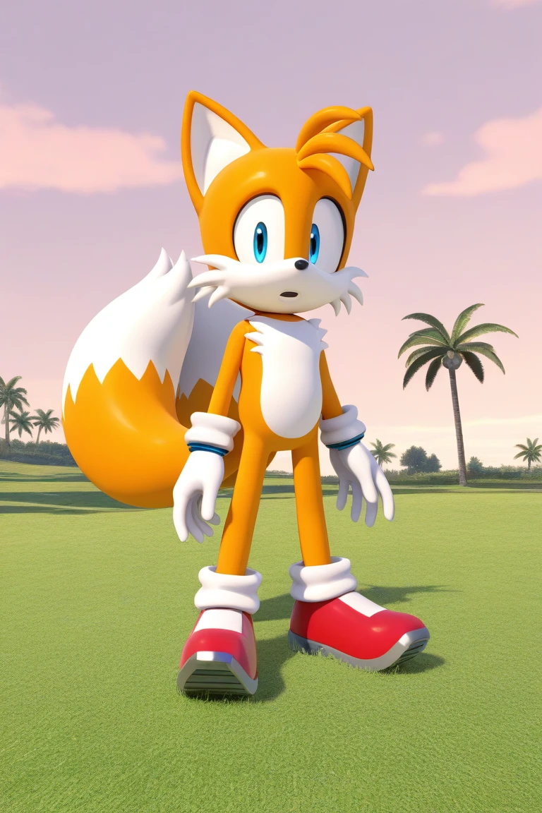1boy,Miles “Tails” Prower from Sonic Prime, full-body character render, stylized 3D animation, cartoon shading, not realistic. Cute young fox with bright orange fur, white muzzle and , large expressive blue eyes, two fluffy tails spinning behind him. Slightly surprised but heroic expression. Wearing white gloves and red-and-white shoes, holding a small futuristic device. Smooth textures, rounded proportions, bold colors, soft lighting, clean outlines, official Netflix Sonic Prime art style, high detail,full body, grass,sky,cloud,sonic palmtree,
