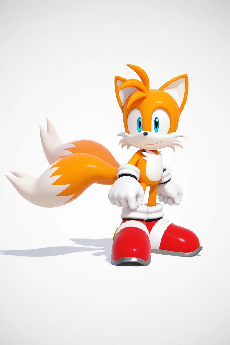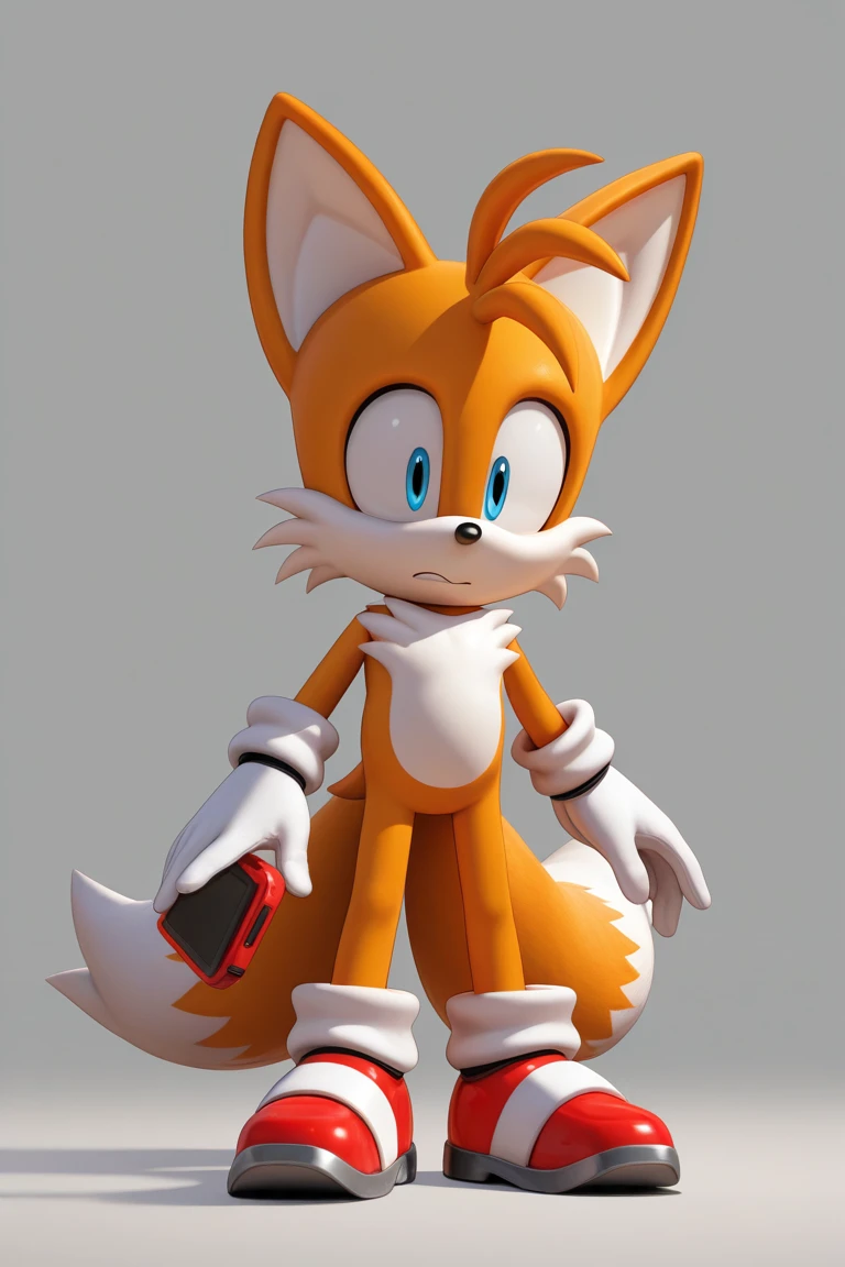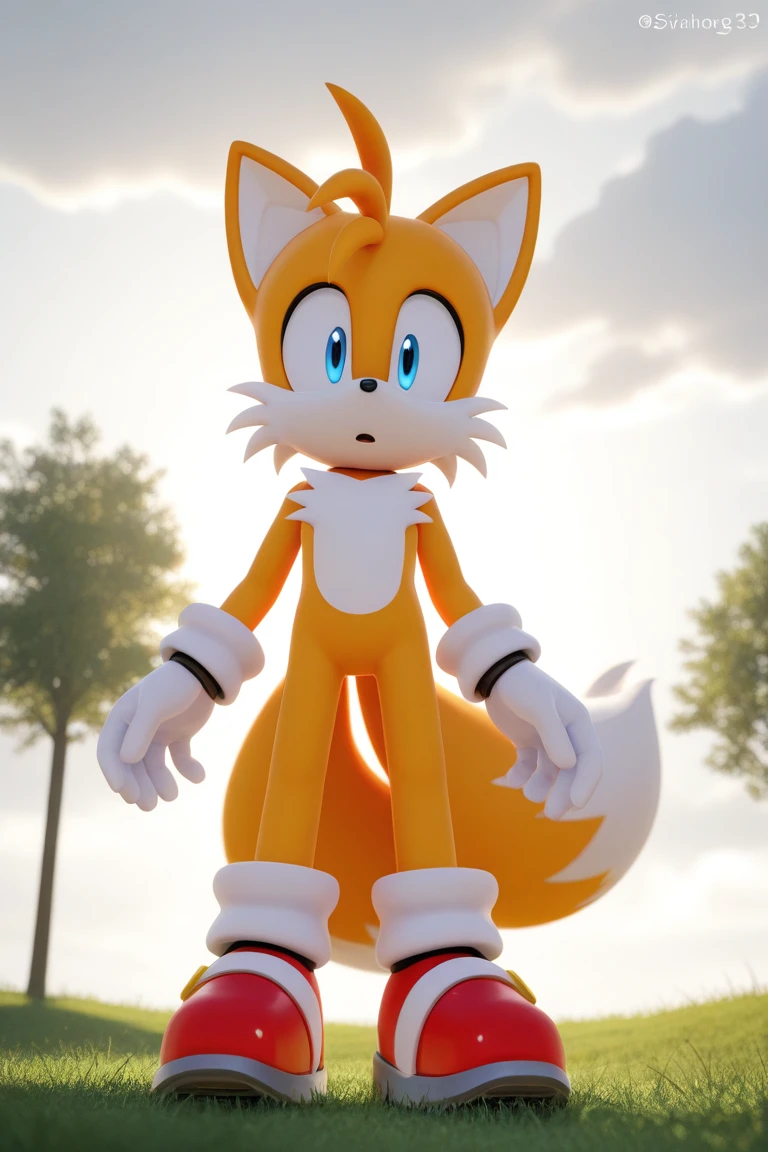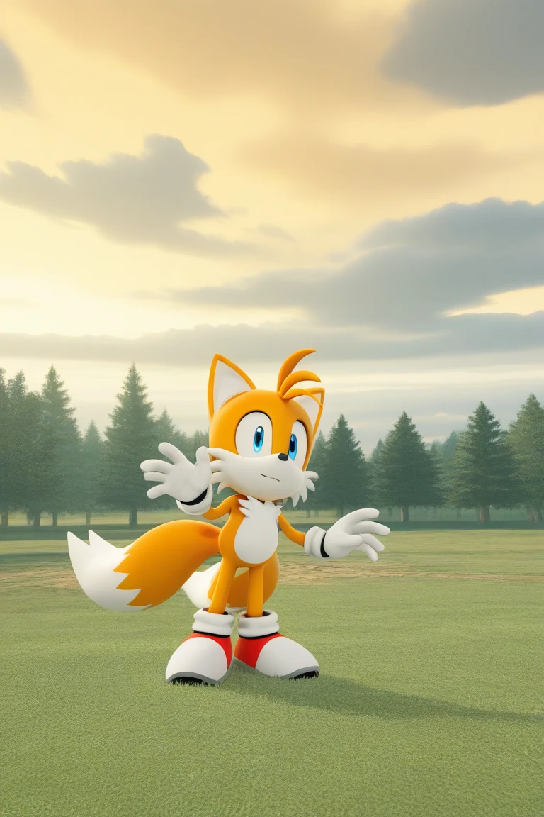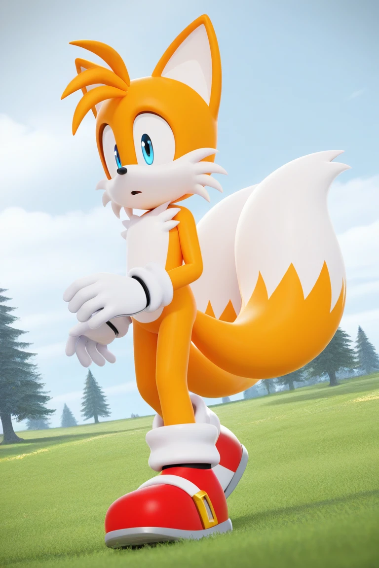 1boy,Miles “Tails” Prower from Sonic Prime, full-body character render, stylized 3D animation, cartoon shading, not realistic. Cute young fox with bright orange fur, white muzzle and , large expressive blue eyes, two fluffy tails spinning behind him. Slightly surprised but heroic expression. Wearing white gloves and red-and-white shoes, holding a small futuristic device. Smooth textures, rounded proportions, bold colors, soft lighting, clean outlines, official Netflix Sonic Prime art style, high detail,full body, grass,sky,cloud,sonic palmtree,