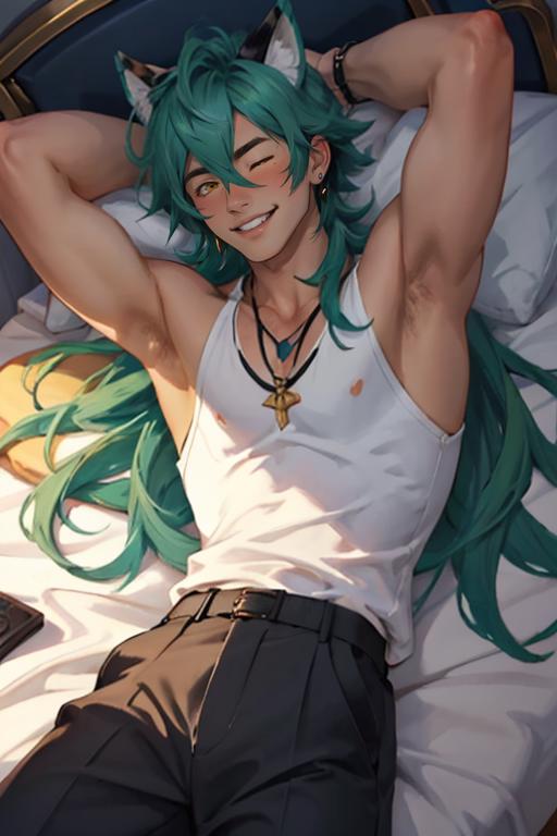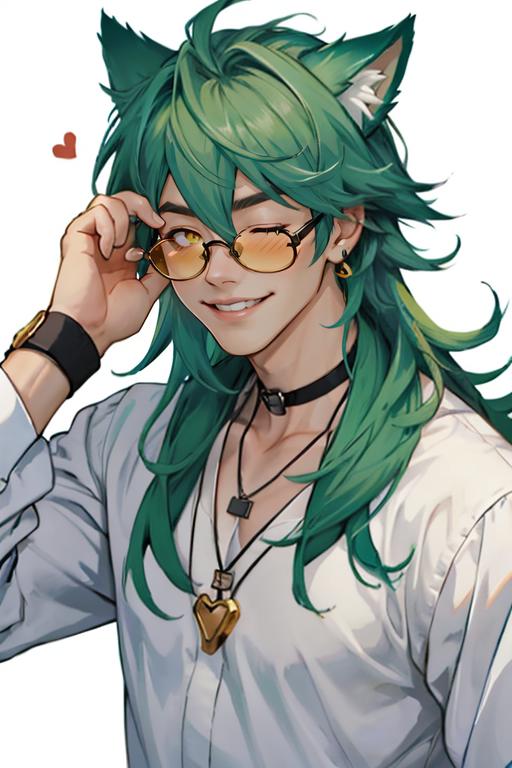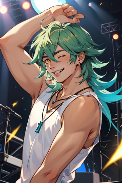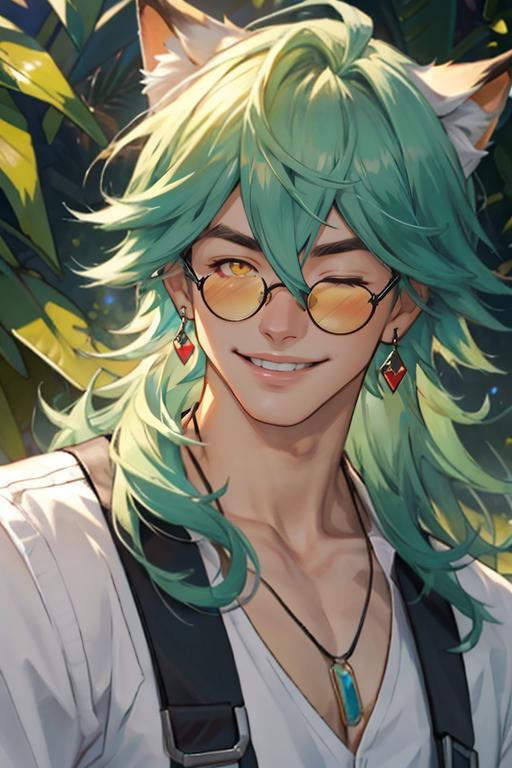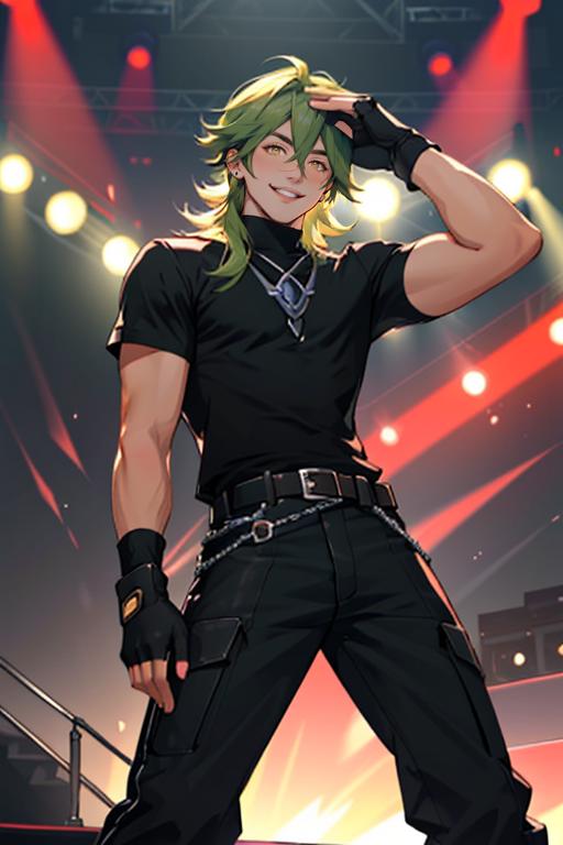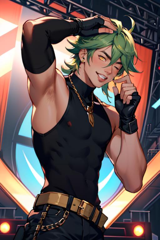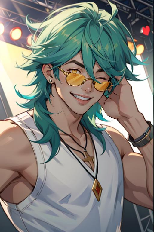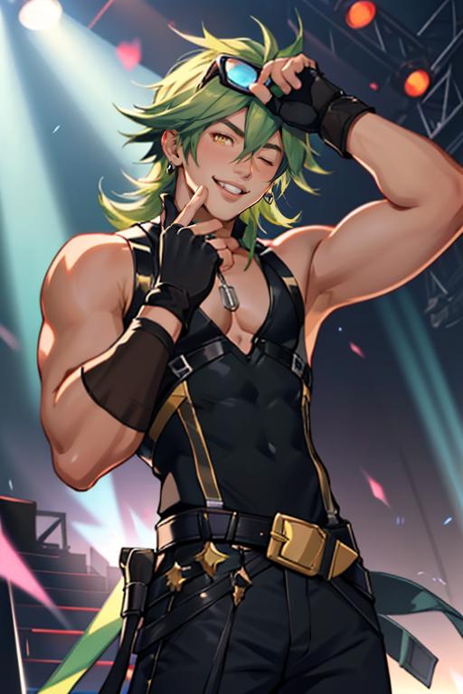 Ez: Ezreal_Heartsteel, solo, long hair (or medium hair), smile, 1boy, hair between eyes, yellow eyes, male focus, green hair, black gloves, belt, fingerless gloves, black pants, (yellow eyewear on head), jewelry, sleeveless.