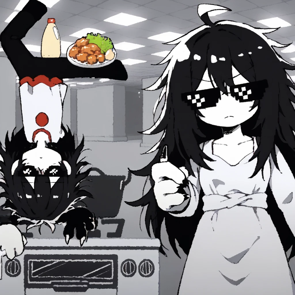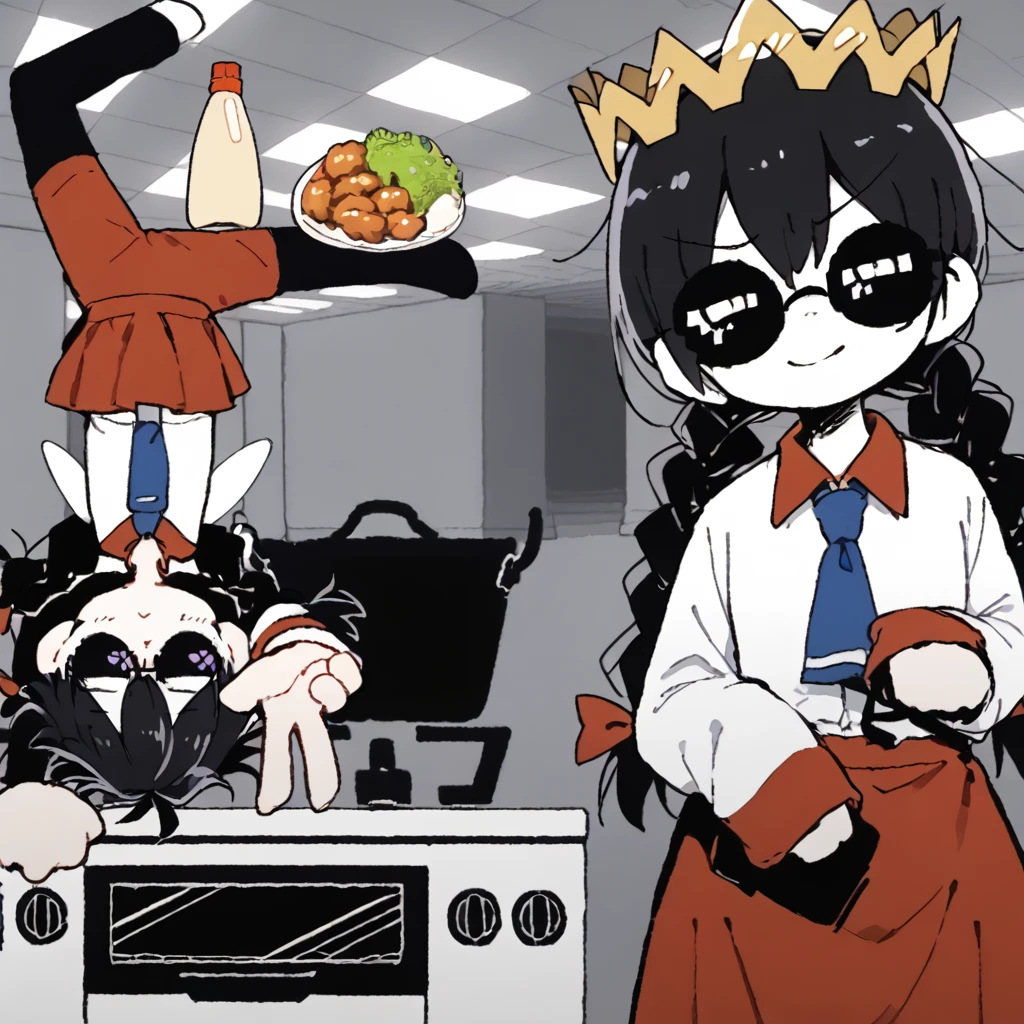 mayokaraage, sunglasses, oven, pot, food, (holding gun:1), bottle